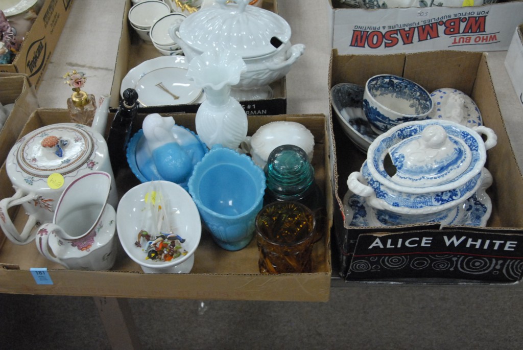 Four box lots child’s tea set, small tureen, milk glass, export tea pot spout as is, export creamer, two perfume bottles, German stein, and German beaker as is.