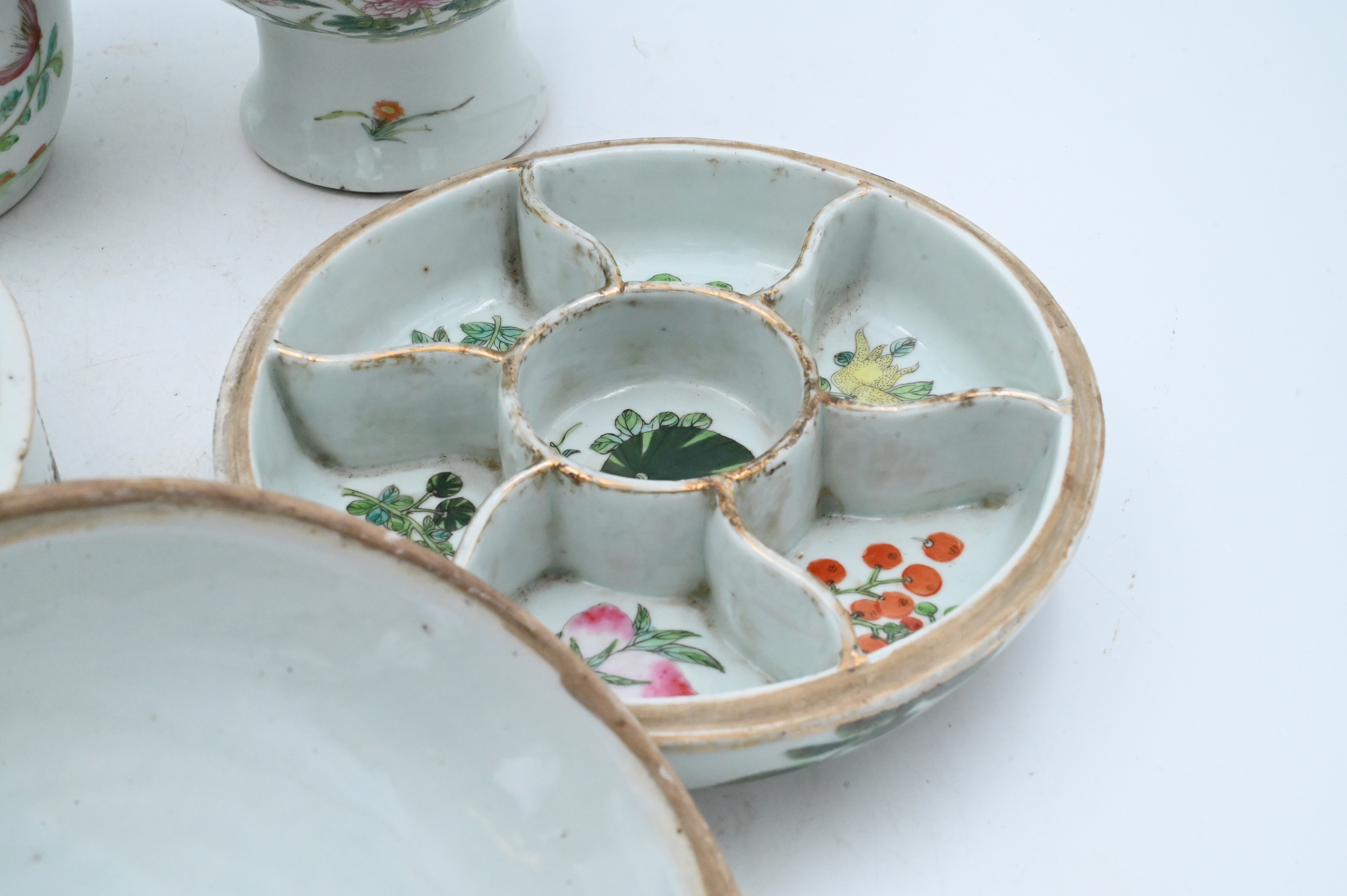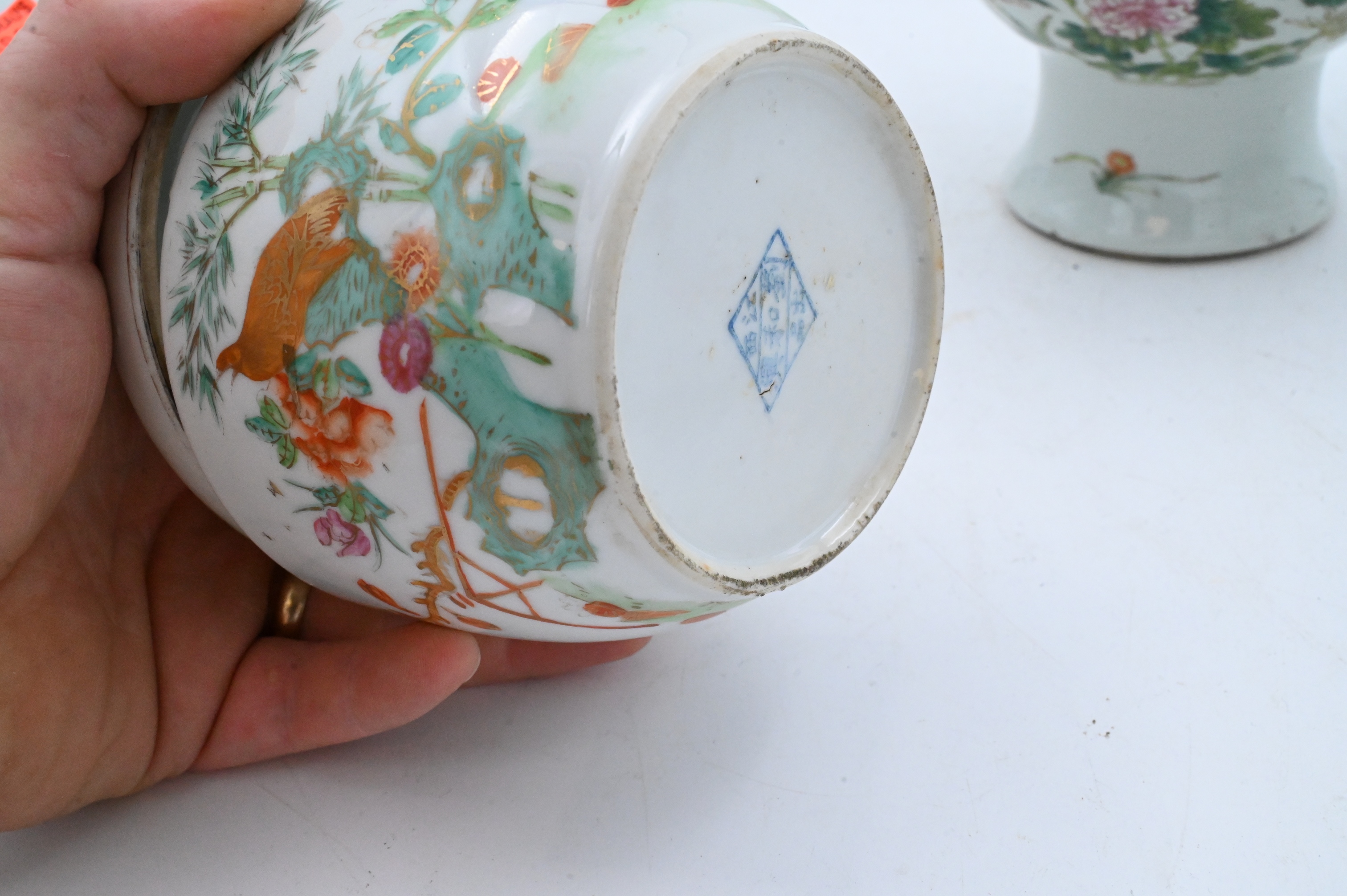 round quail jar, squat pot with geishas in a courtyard motif, pedestal cup having chrysanthemum motif with gilt foo dog finial and blue and white handles along with sweets serving dish with seven compartments and floral and bird motif