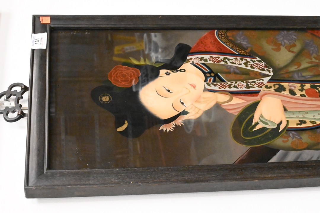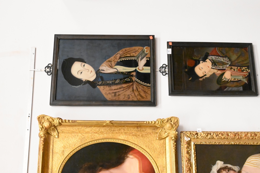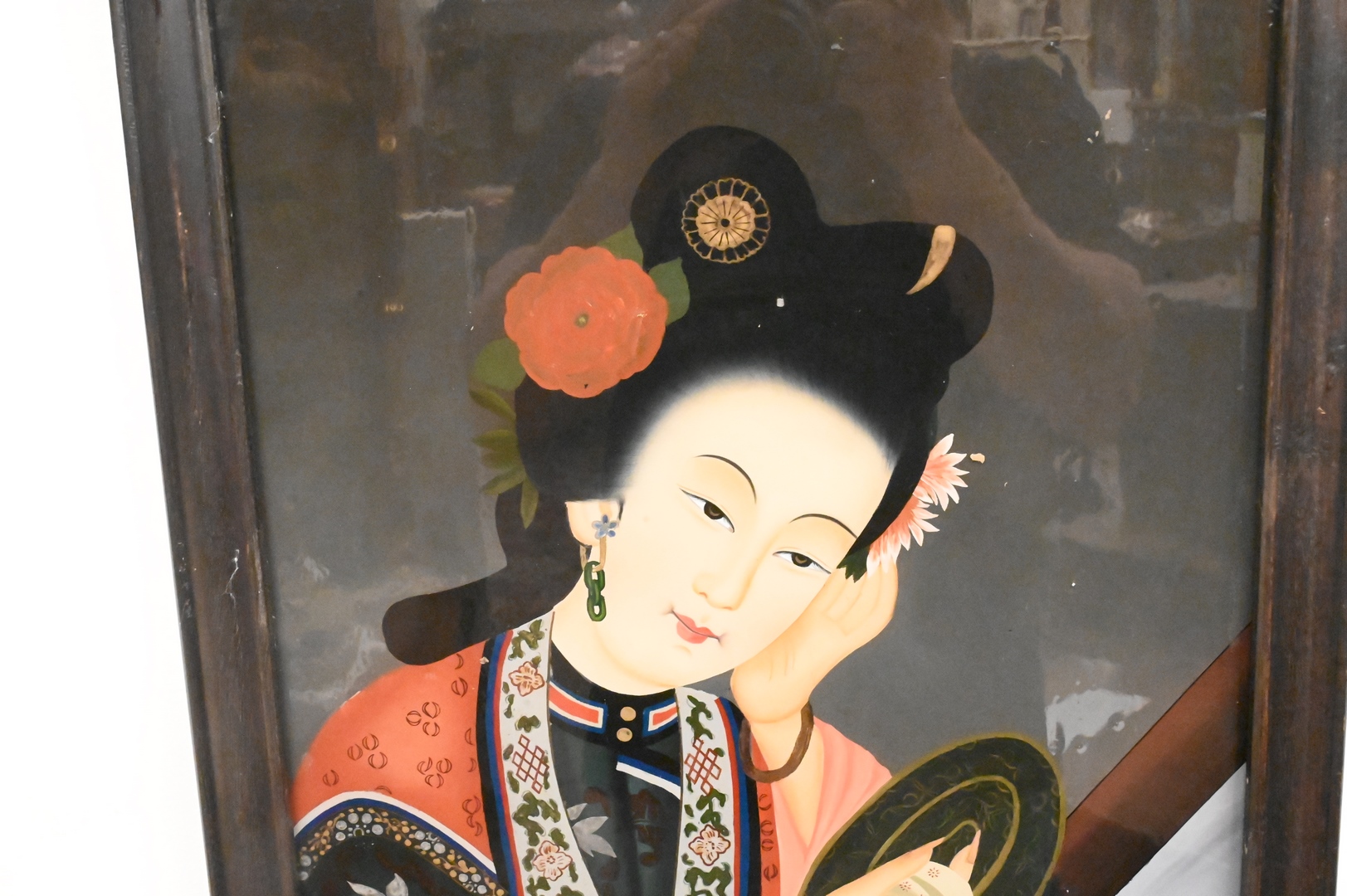 Four Chinese Reverse Painted Portraits of Young Women, each framed with brass hanging bracket, 23″ x 16 1/2″.
