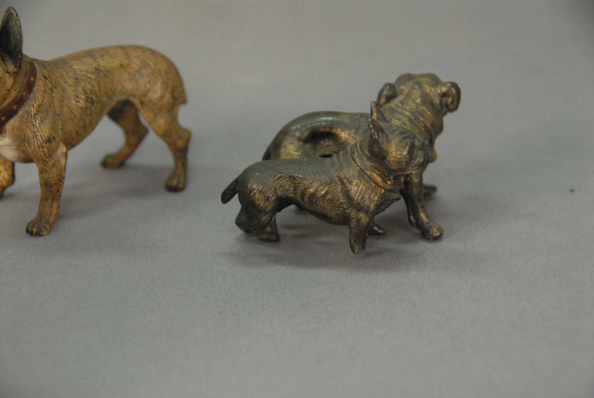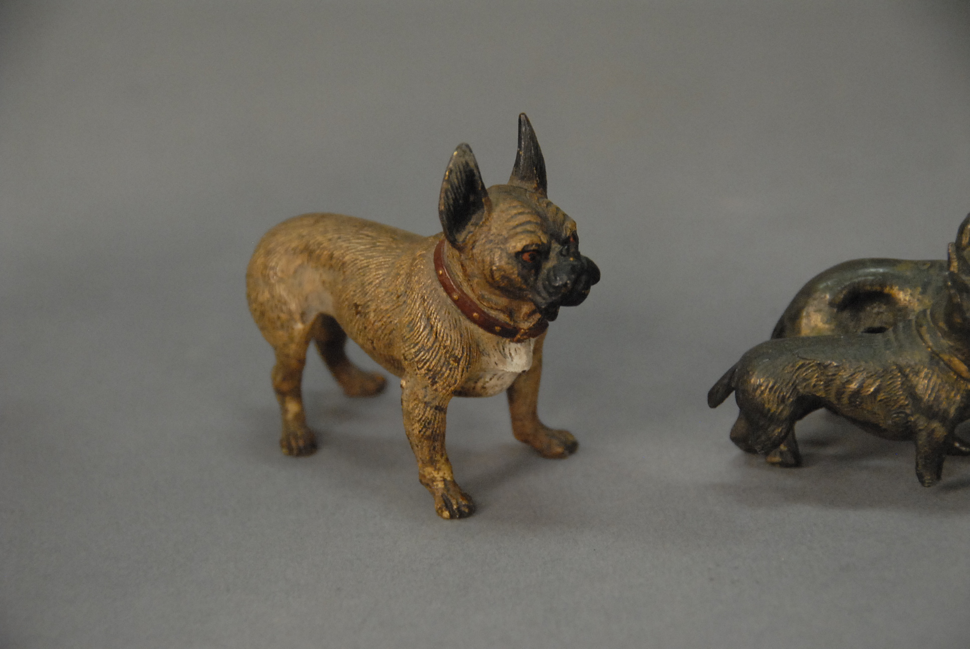 Geschutzt cold painted pug ht. 2in. along with two small bronze pugs as is ht. 1 1/2in.