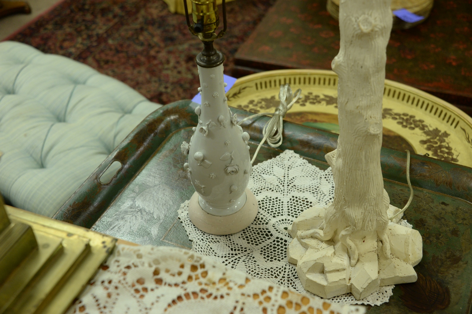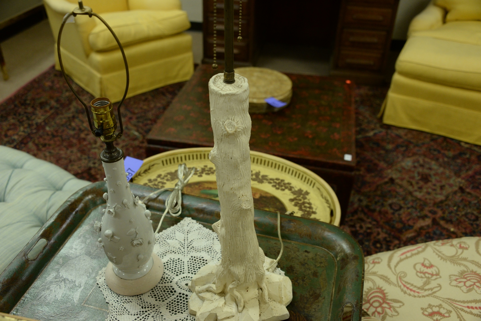 Group of Five Table Lamps, to include pair of papier mache table lamps, with painted flowers as is, height 29 inches a large ceramic vase, made into a lamp tree form plaster lamp, along with a white glazed vase with moulded flowers and fruit.