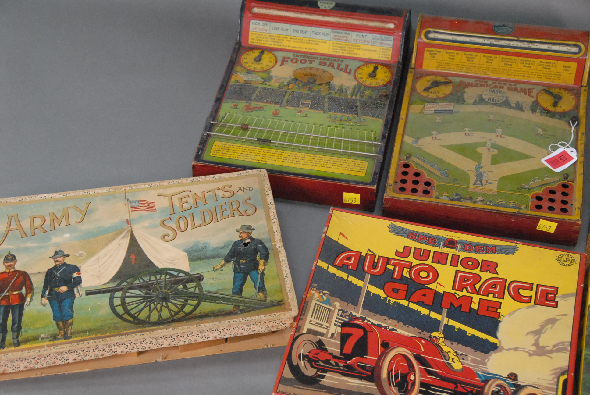 Lot 181: Group of six games two Arnold Palmer games, Intercollegiate Football, The Great American Game, Junior Auto Race Game, and Army Tent…