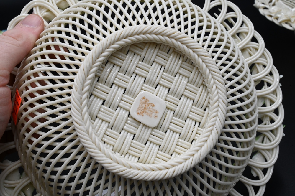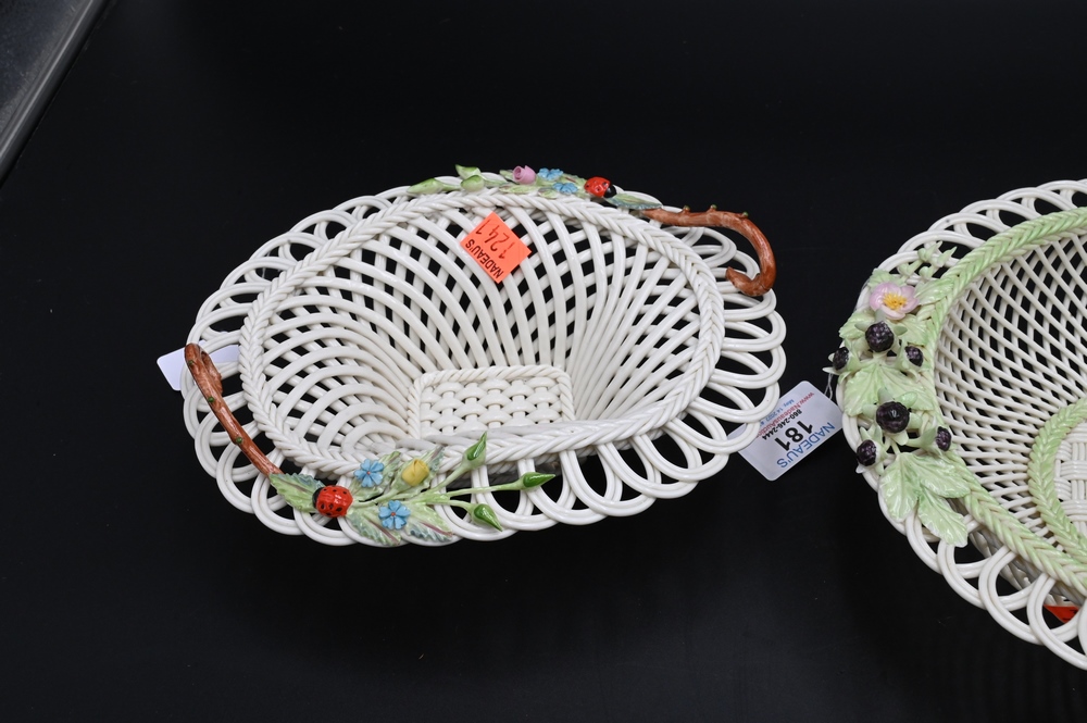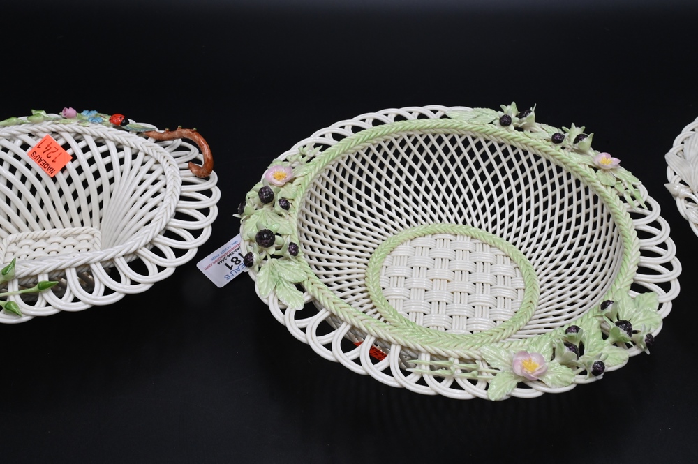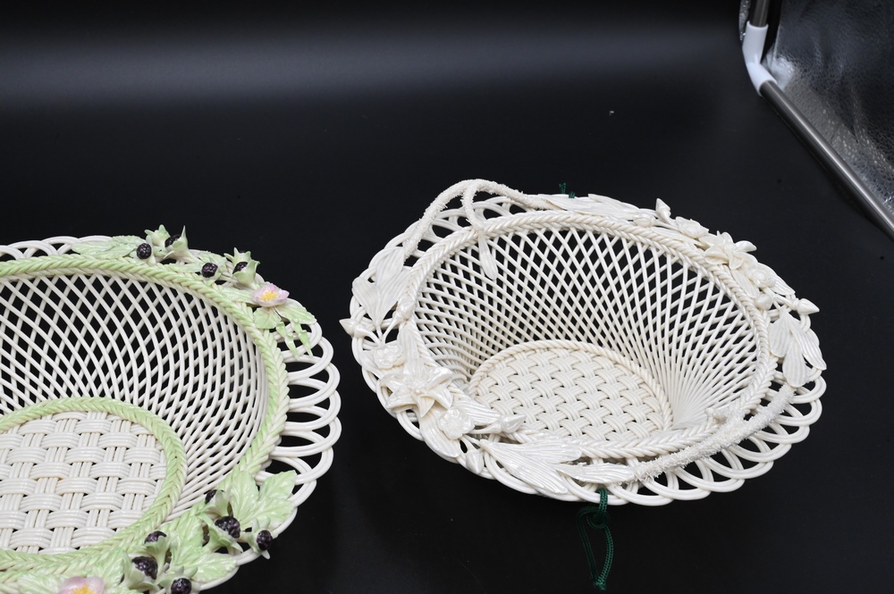 Group of Three Belleek Baskets, to include round bowl with berries and flowers, brown mark, diameter 9 inches; round basket with twig handles, not marked, diameter 8 1/2 inches; an oval basket with twig handles; along with a oval basket having twig handles and ladybugs, height 8 1/2 inches, Collectors Society mark. Provenance: Collections of Norma Reilly, New Jersey.