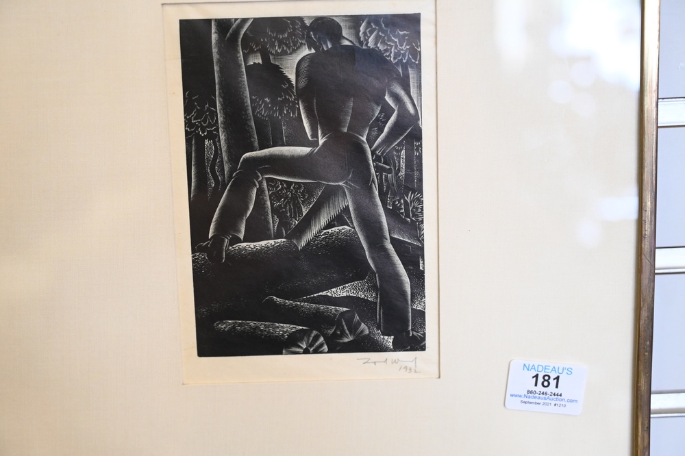 Lot 181: Group of Three Lynd Kendall Ward (American, 1905 – 1985), woodcuts on paper, each signed in pencil in the lower margin, and one dated “1932” in pencil, all matted in the same frame, each image size 6 1/4″ x 4 1/4″.