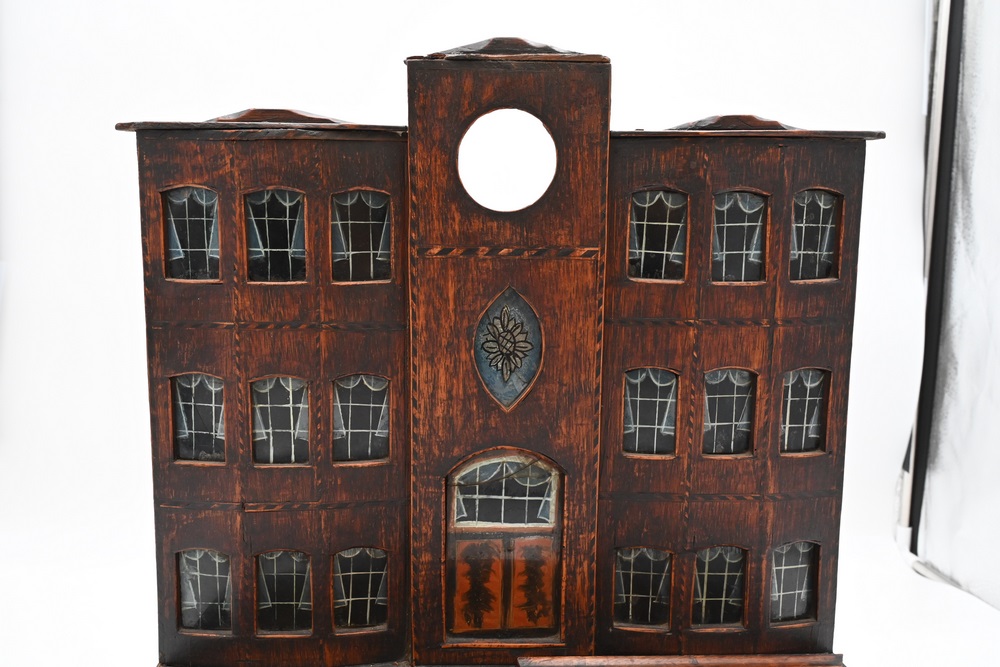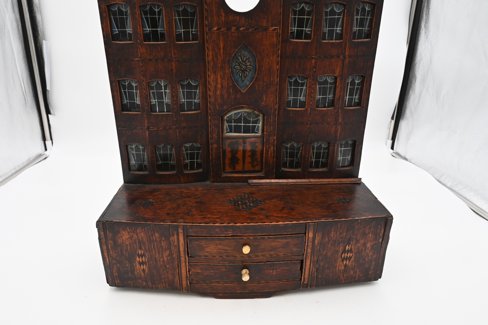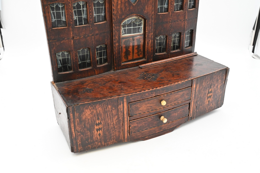 Lot 181: Inlaid Colonial Architectural Watch Hutch in the form of a colonial house having 20 reverse painted windows and doors set on a base having 2 drawers 19th century height 17 1/2 inches, width 15 1/2 inches.