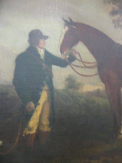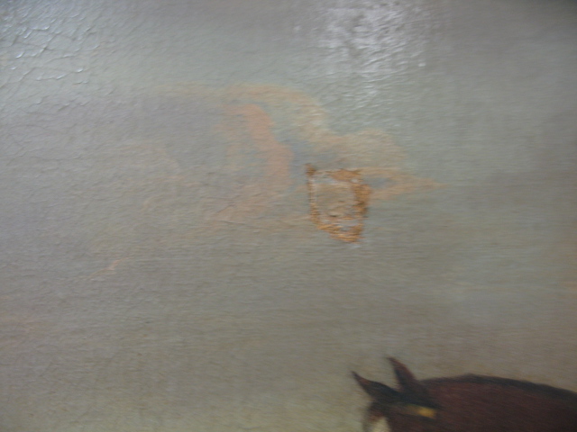 Large oil on canvas of a horse & rider with a small dog unsigned in Burlwood frame