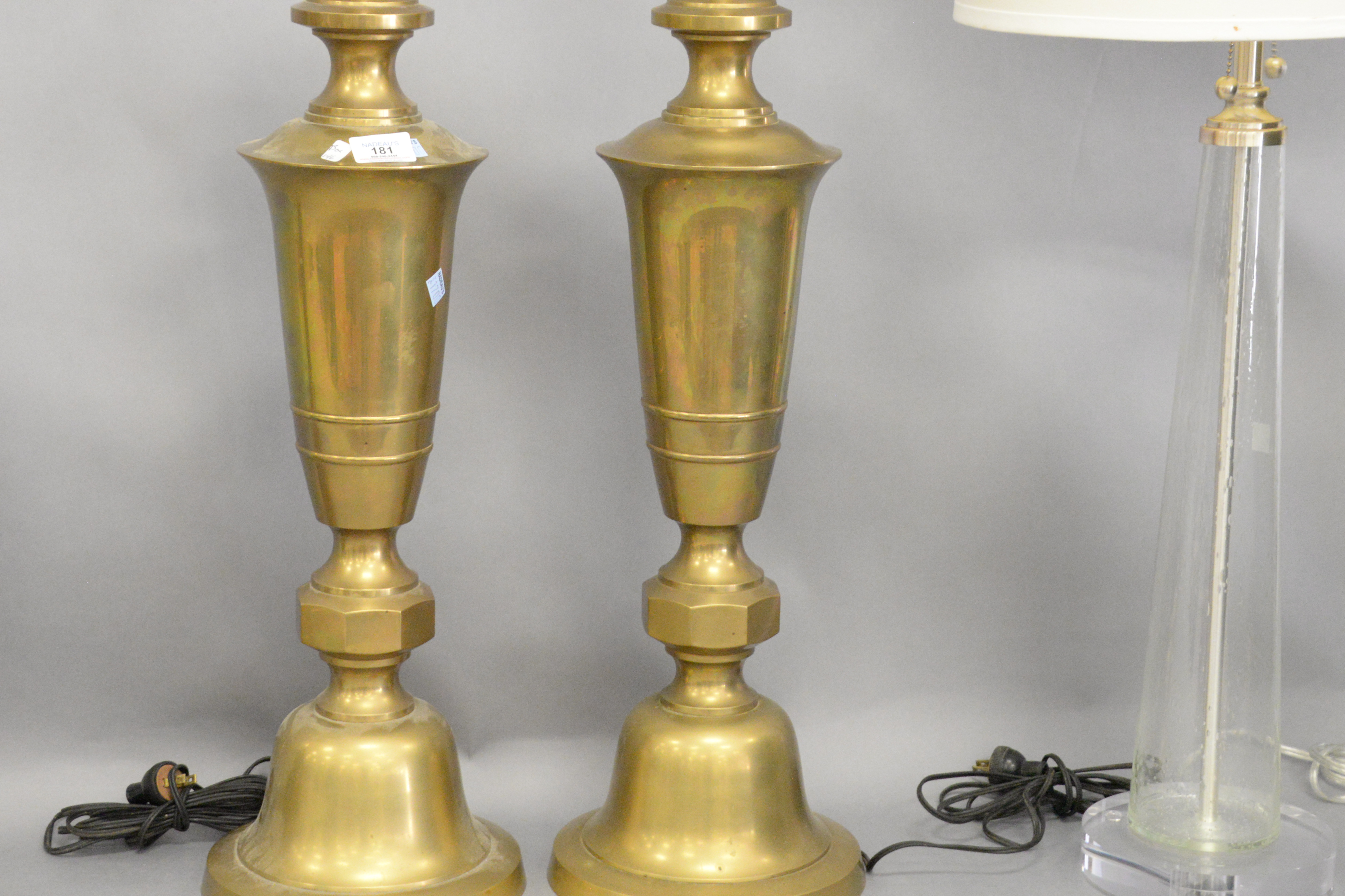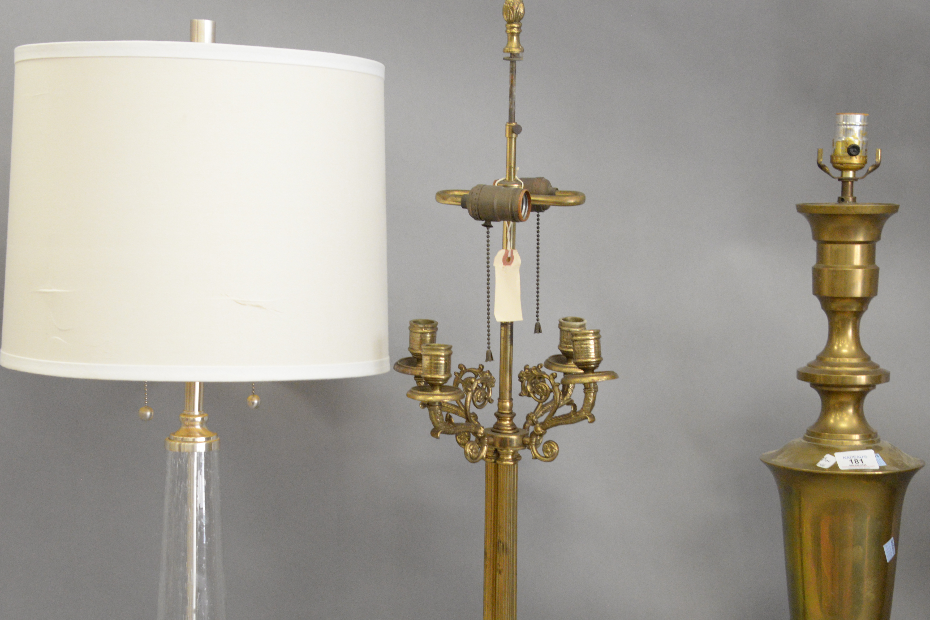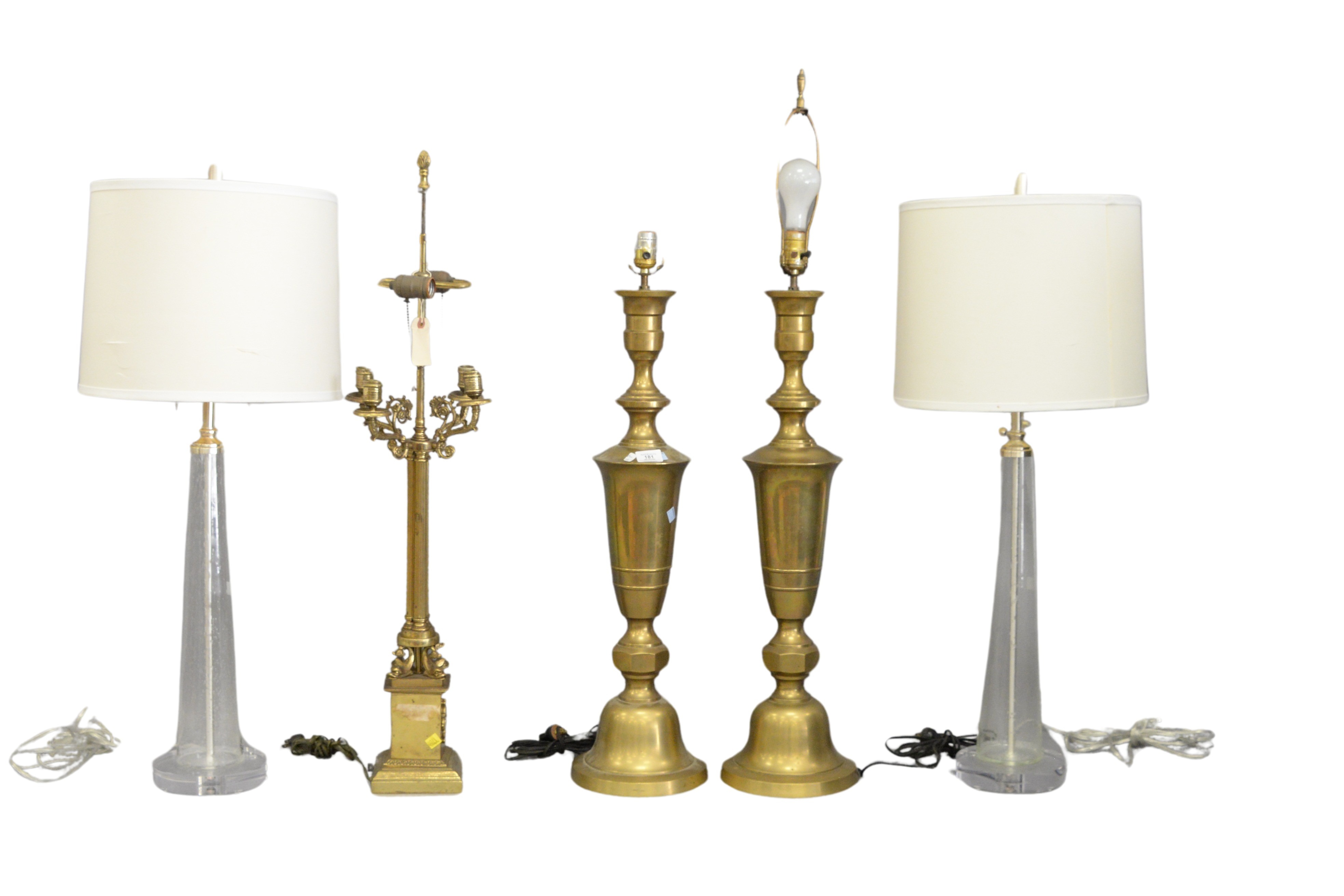 Lot of Five Lamps, to include, pair of brass urn form lamps, pair of glass on lucite base lamps, along with brass lamp having four candelabra arms, tallest lamp 42 inches