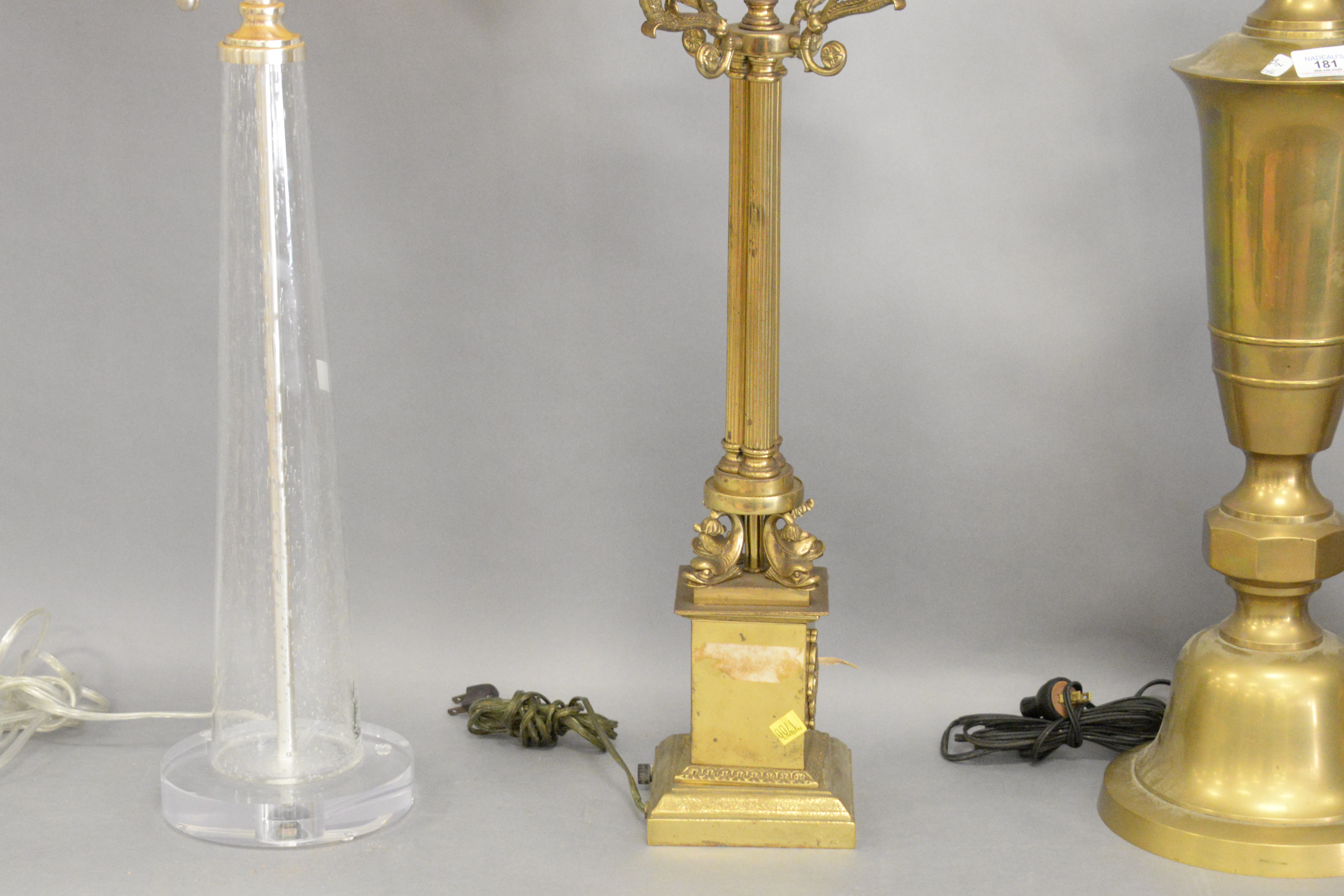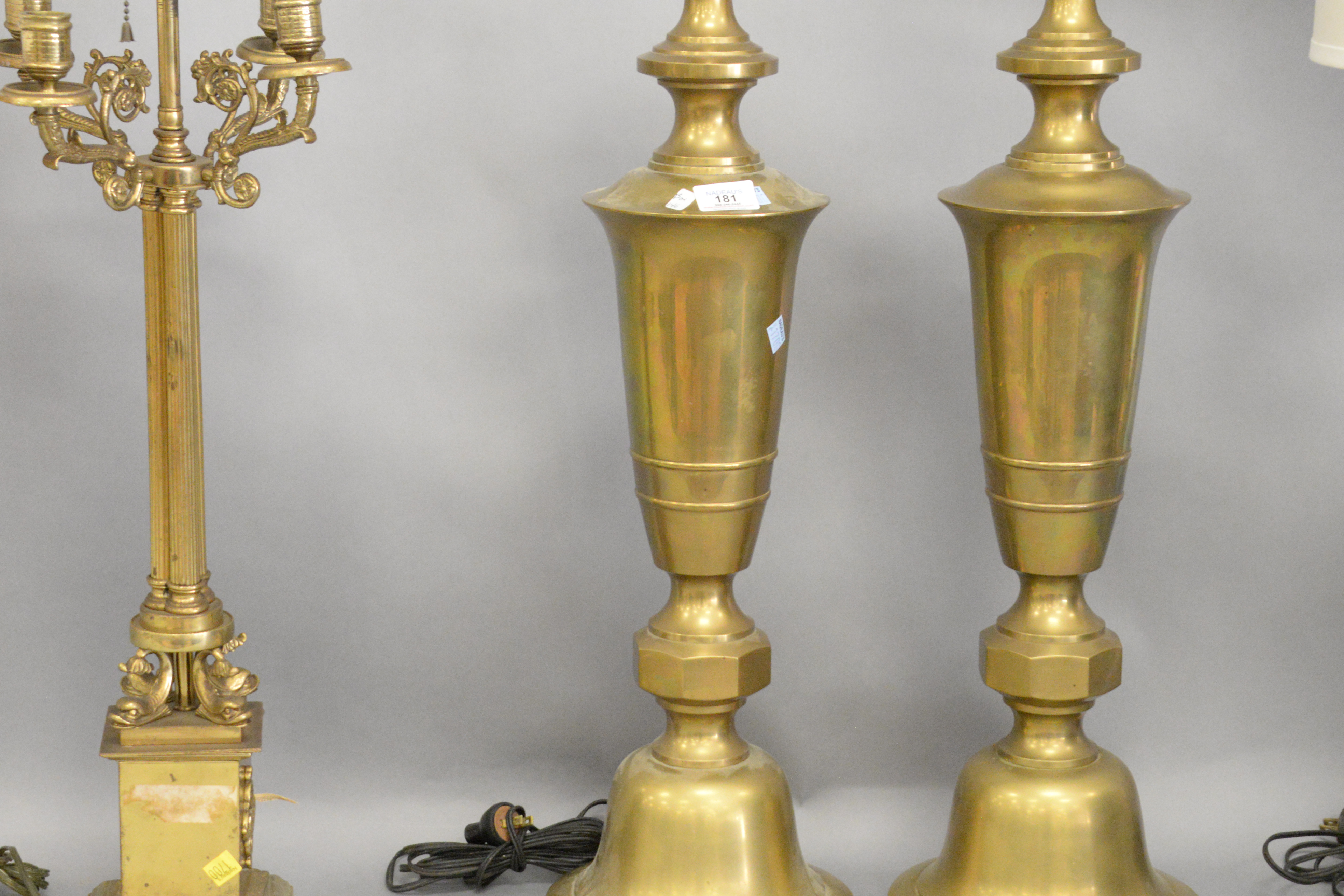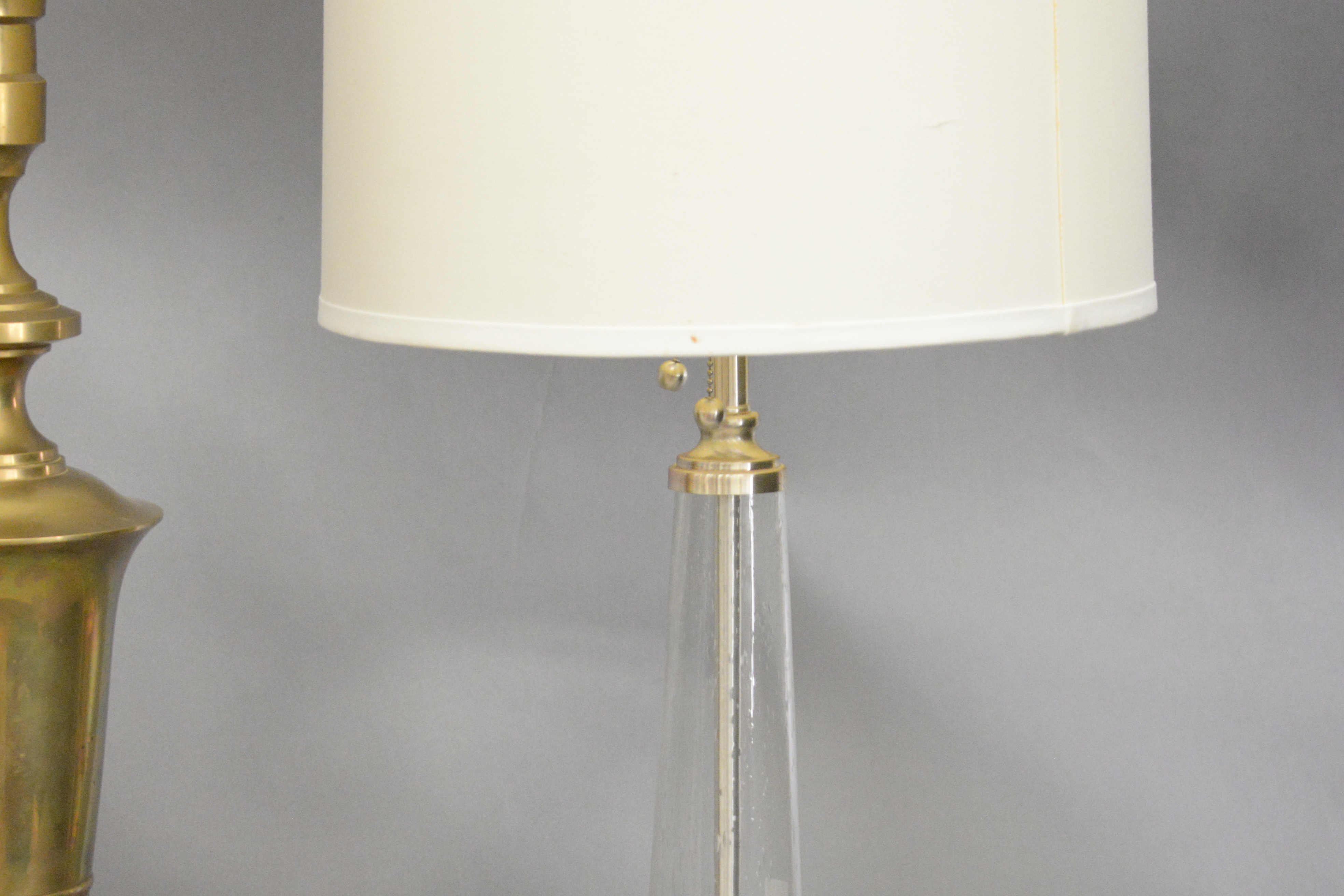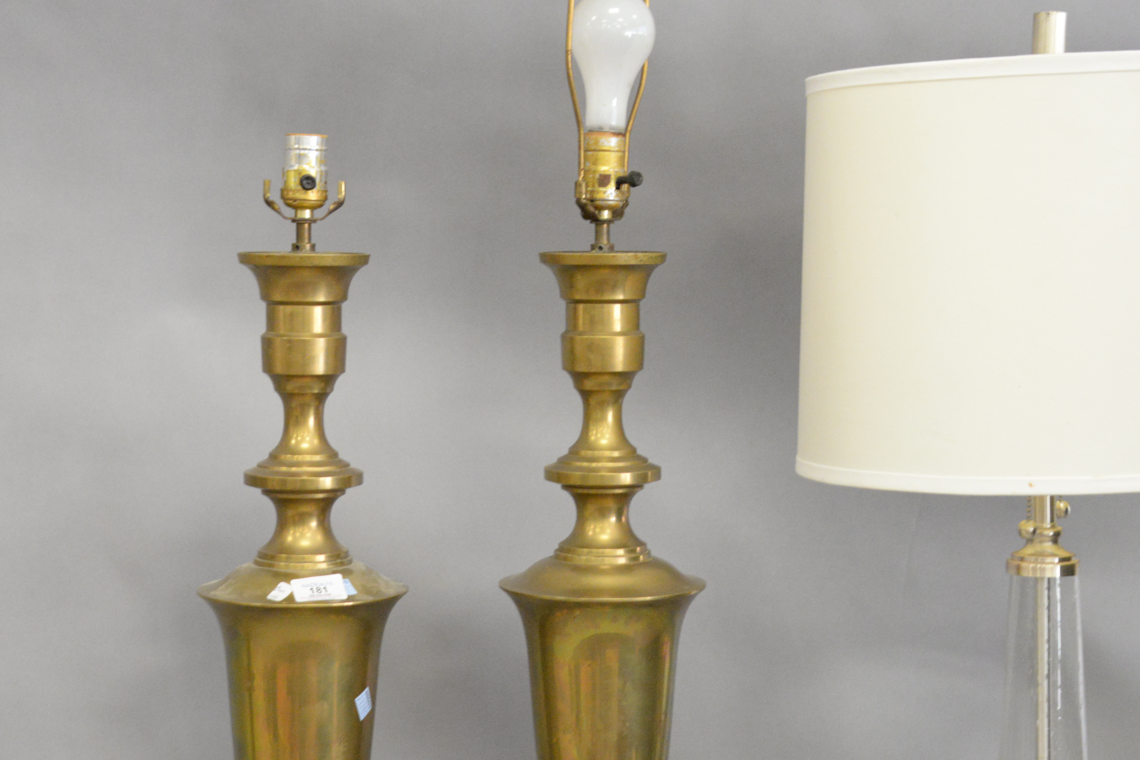 Lot of Five Lamps, to include, pair of brass urn form lamps, pair of glass on lucite base lamps, along with brass lamp having four candelabra arms, tallest lamp 42 inches