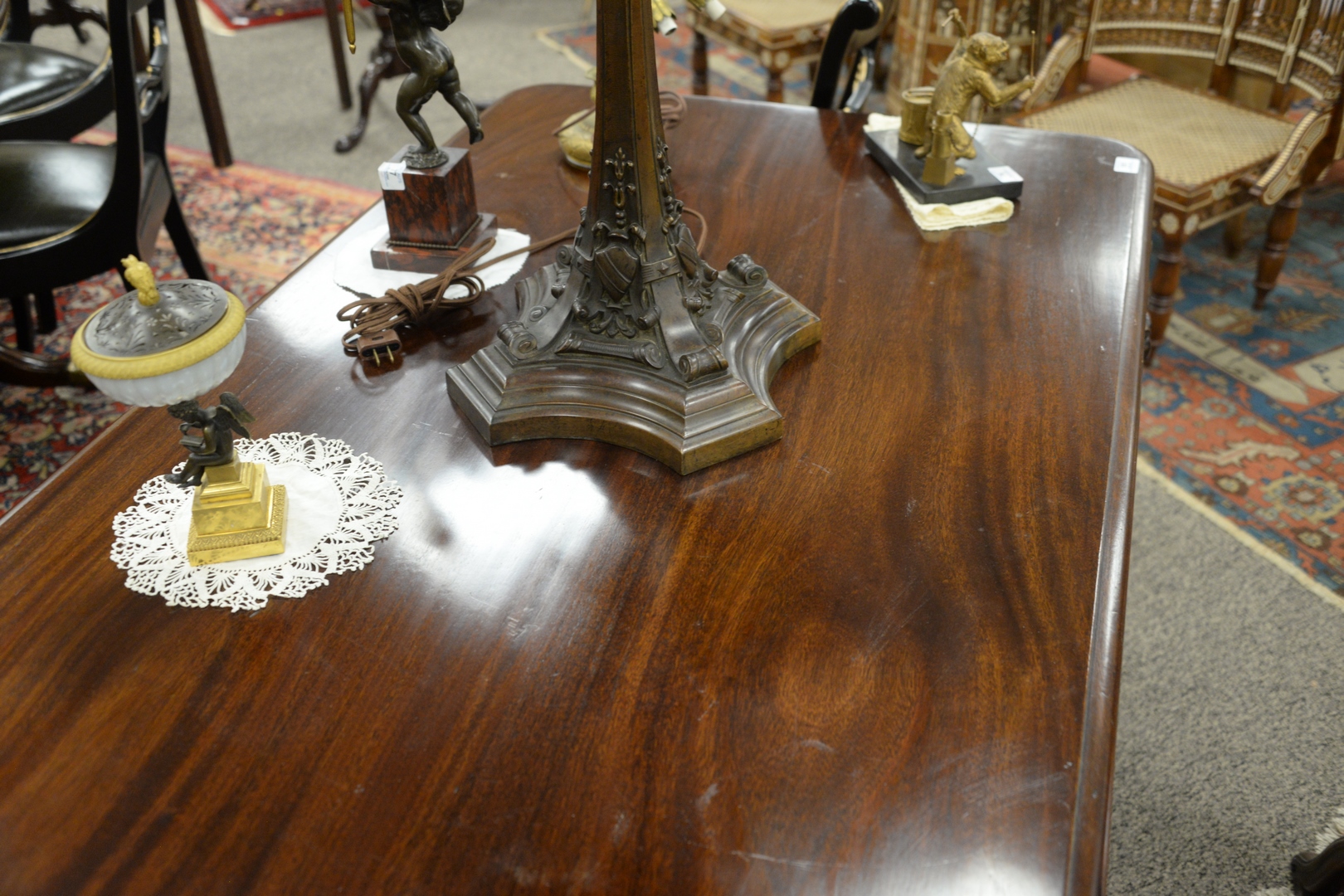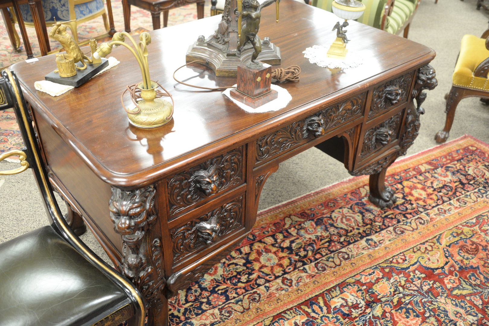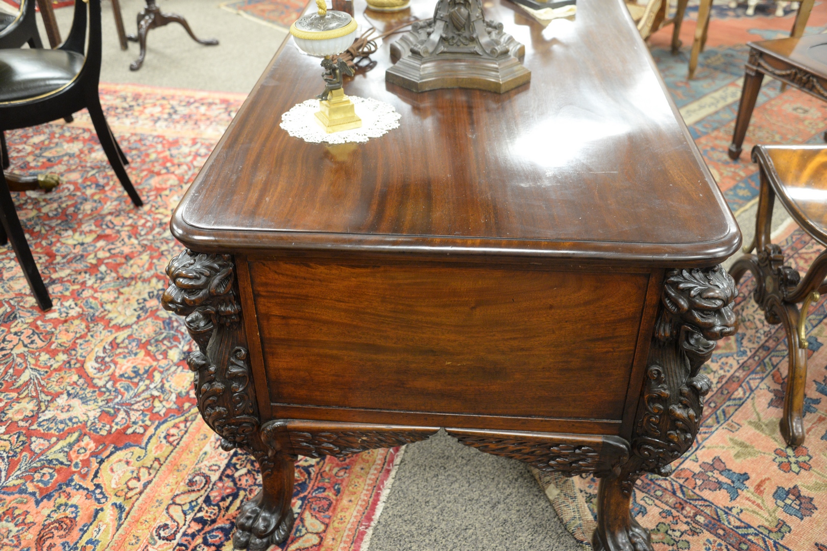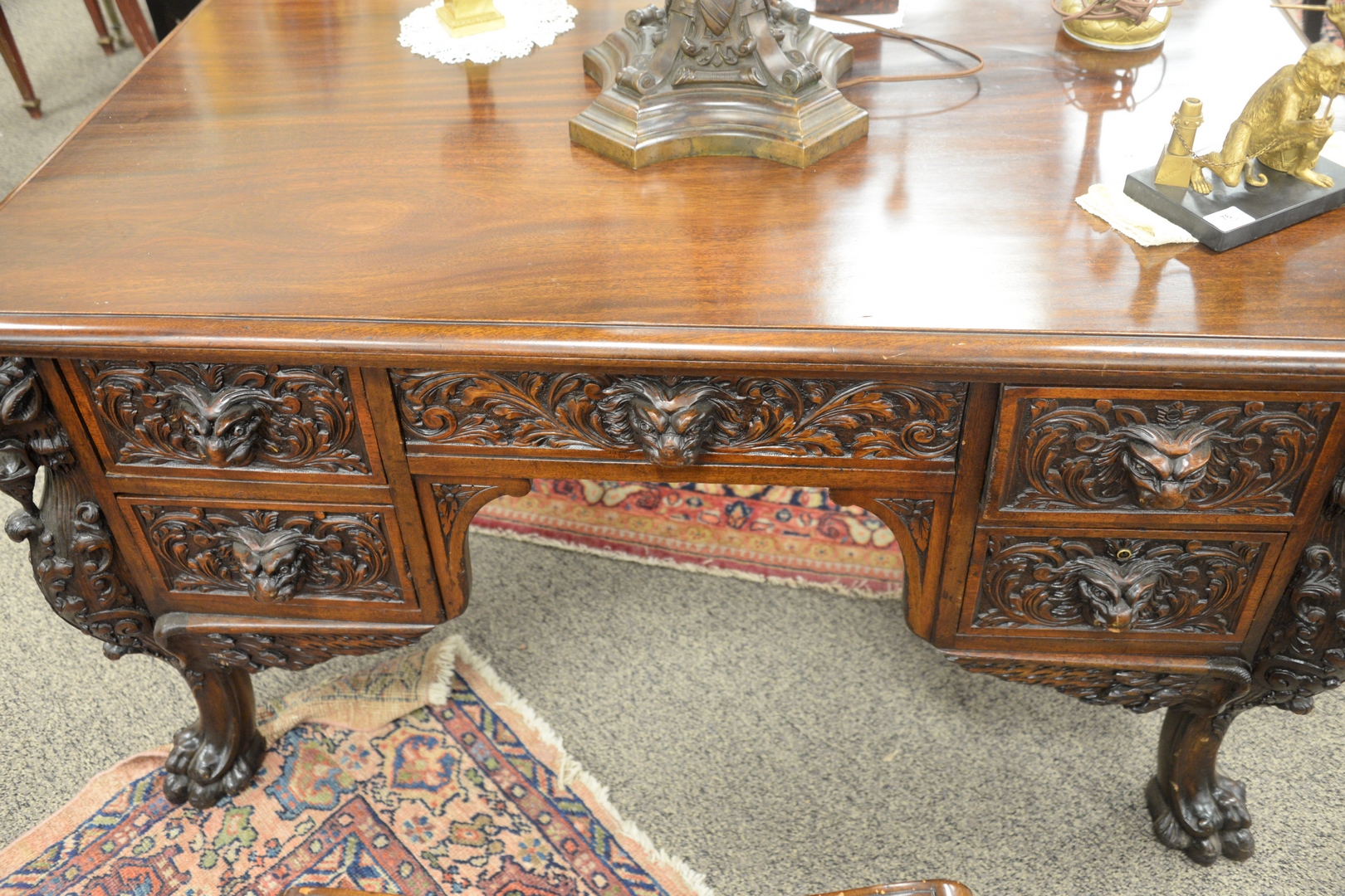 Lot 181: R.J. Horner Mahogany Winged Griffin Carved Desk, having lion face drawers and faux drawer on reverse, all set on large claw feet, height 30 inches, top 33 x 55.