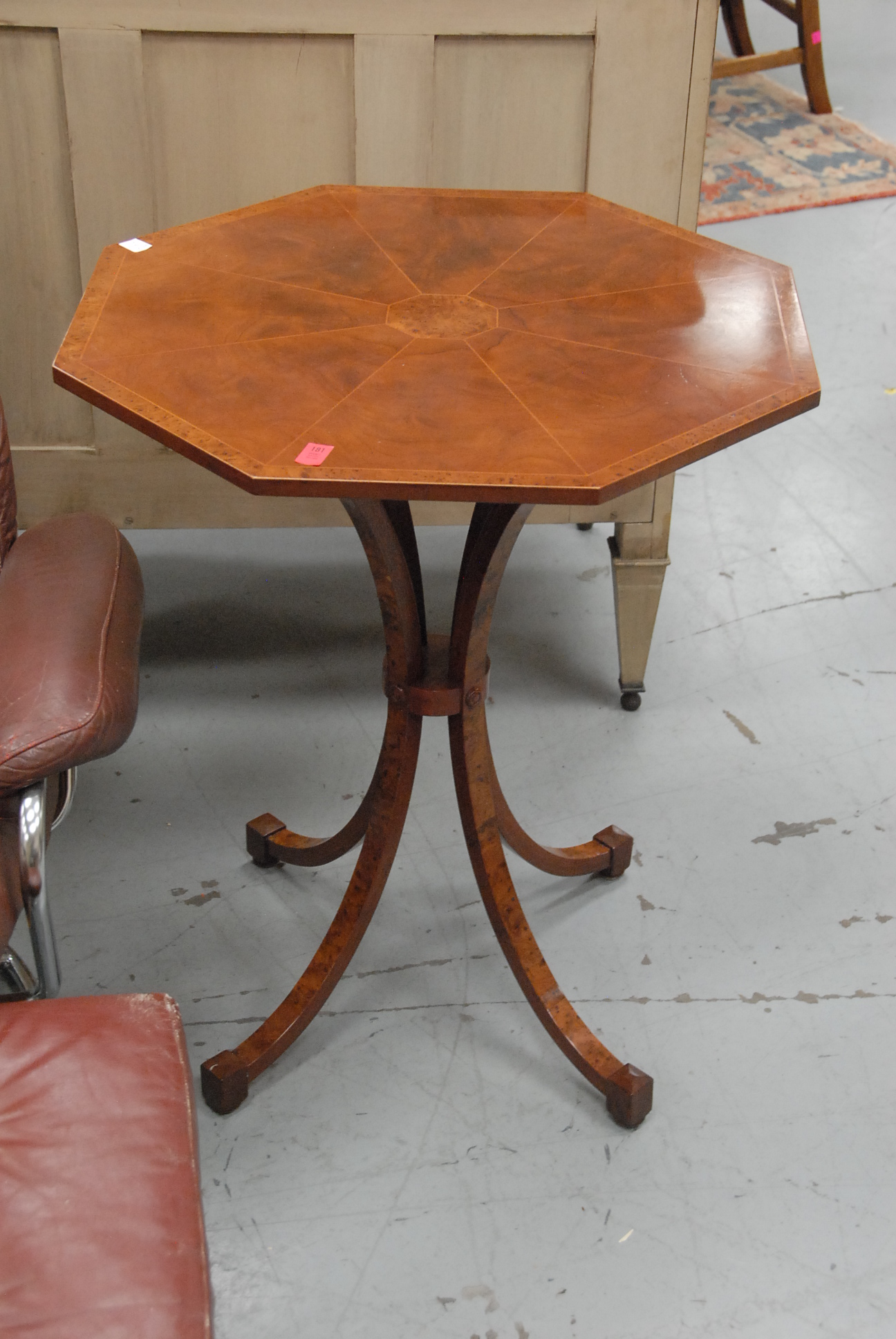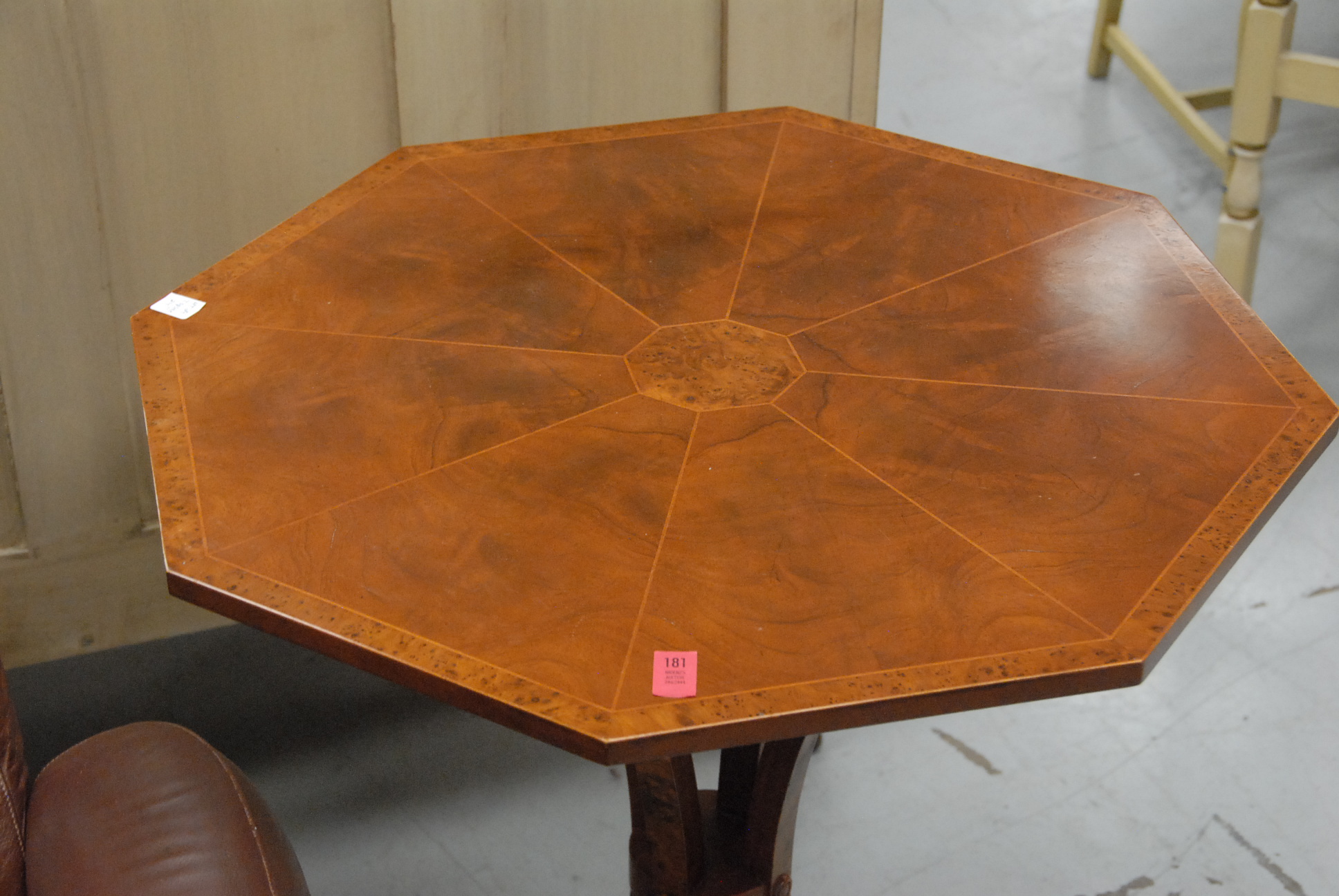 Lot 181: Regency style side table with a richly veneered octagon top of walnut and olive burl set on four curved burl legs.