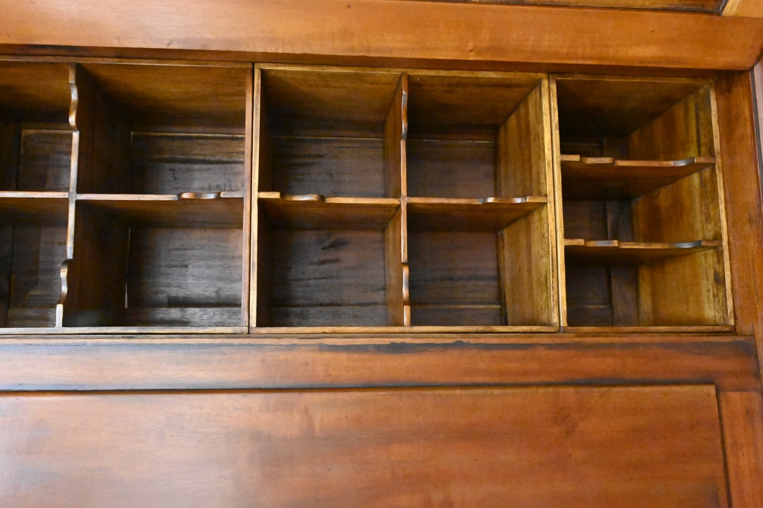 Reproduction Mahogany Chippendale Style Block Front Secretary Desk, in three parts, having shell carved front, top with fully pigeon holed interior, height 104 inches, width 43 1/2 inches.