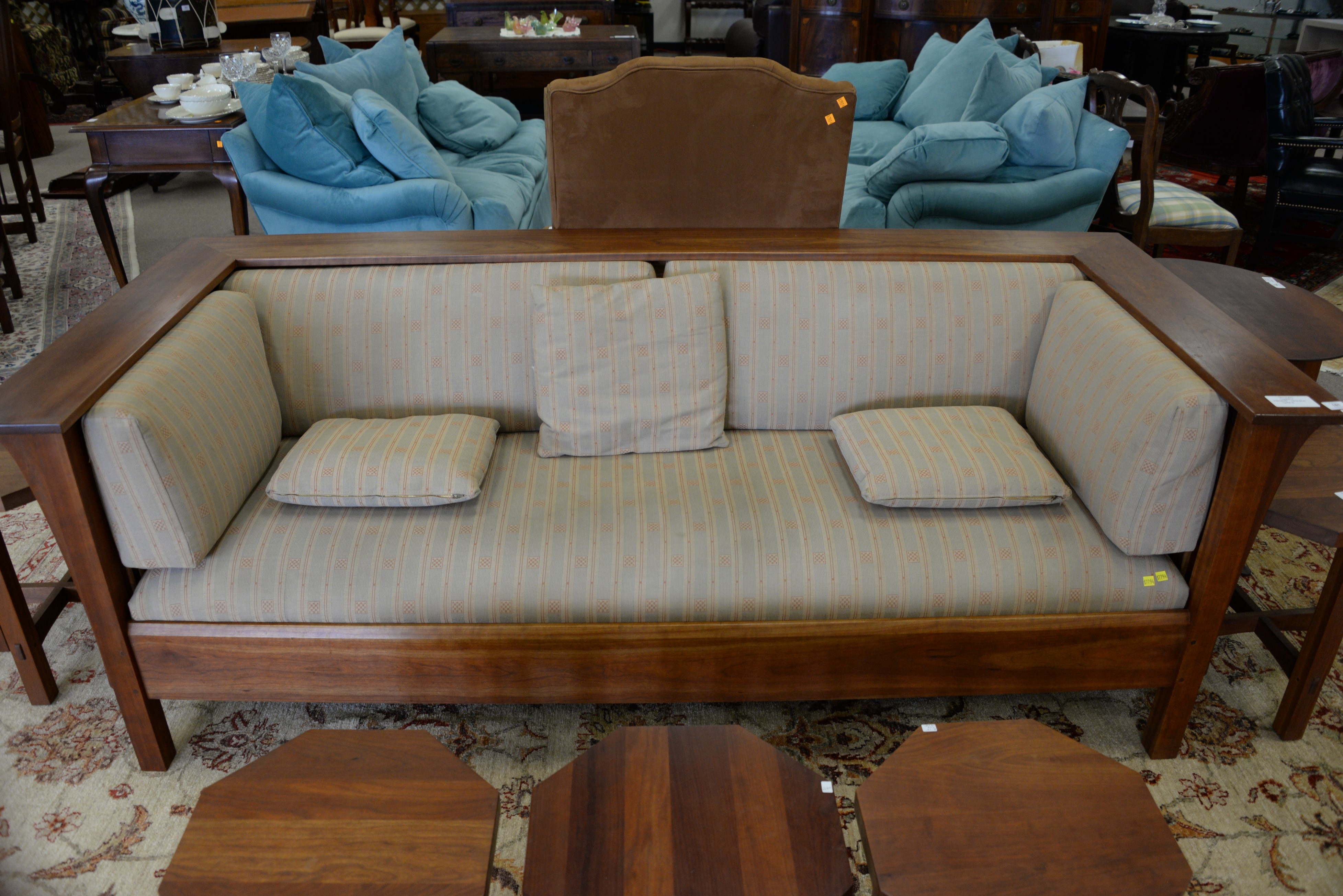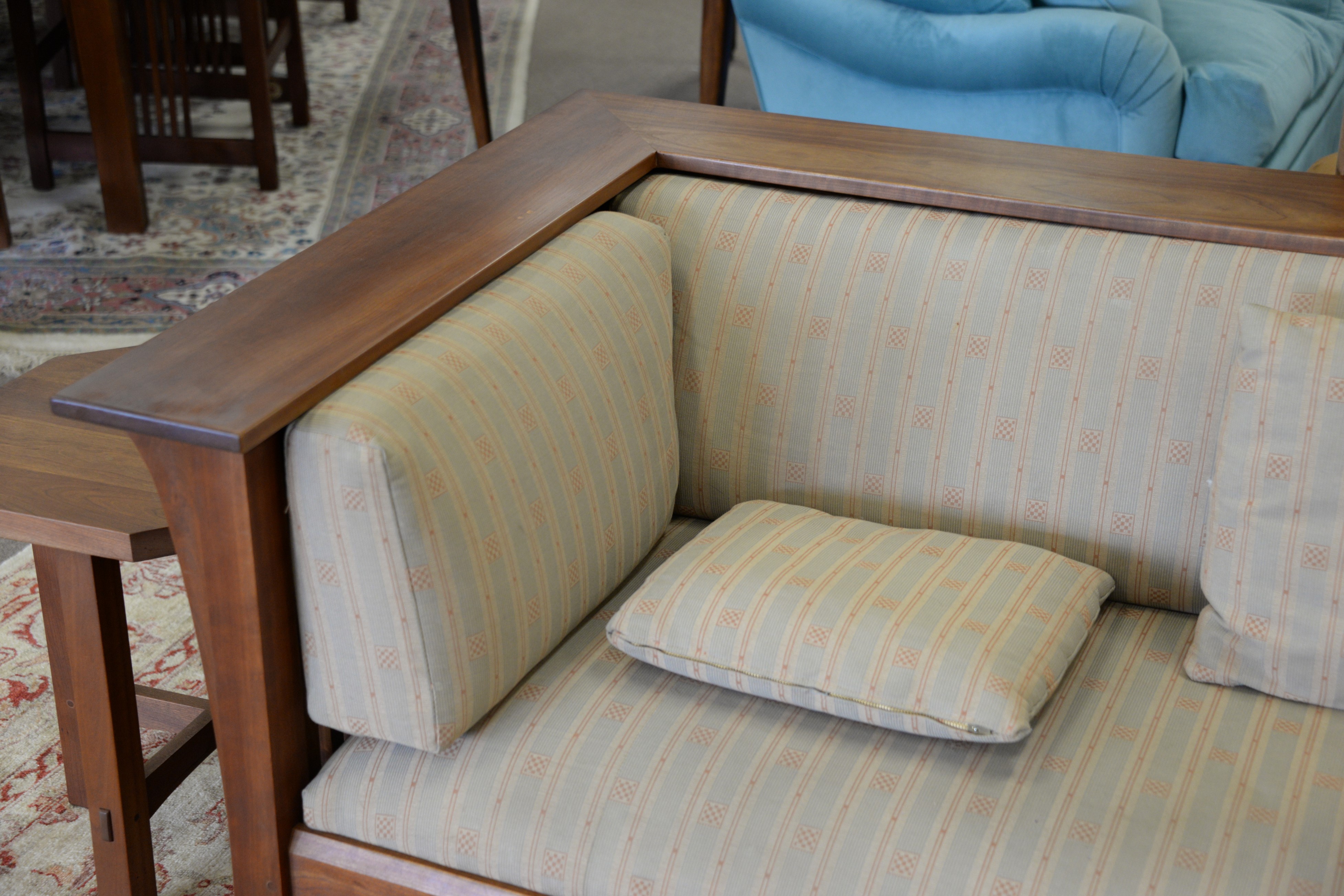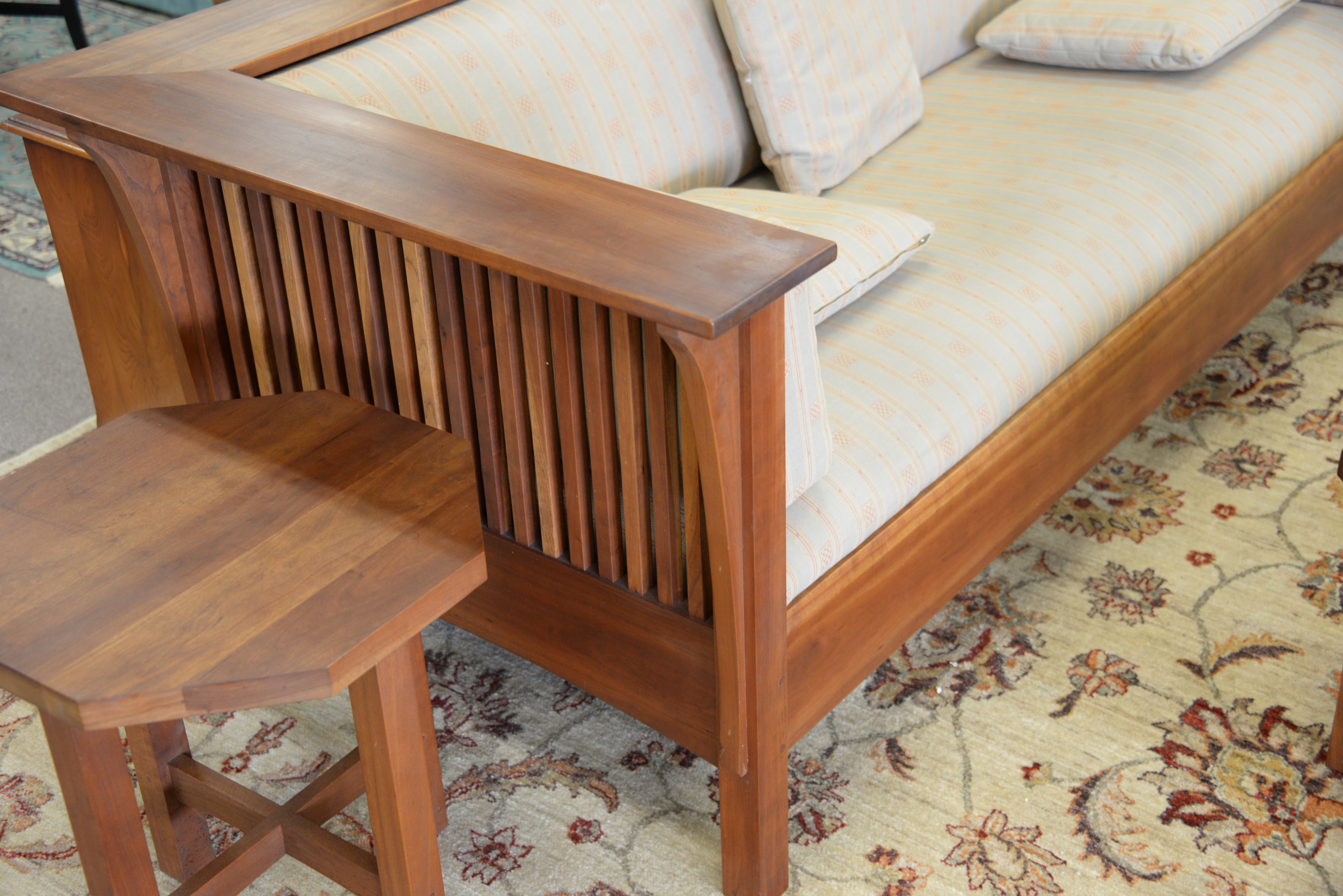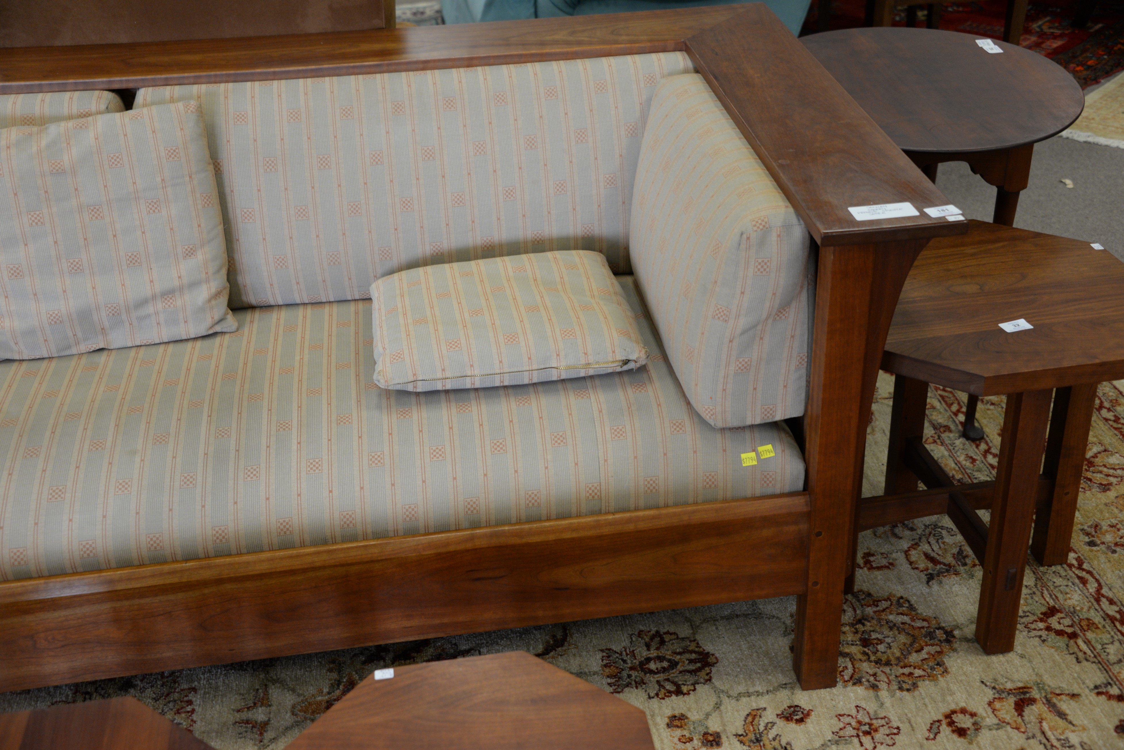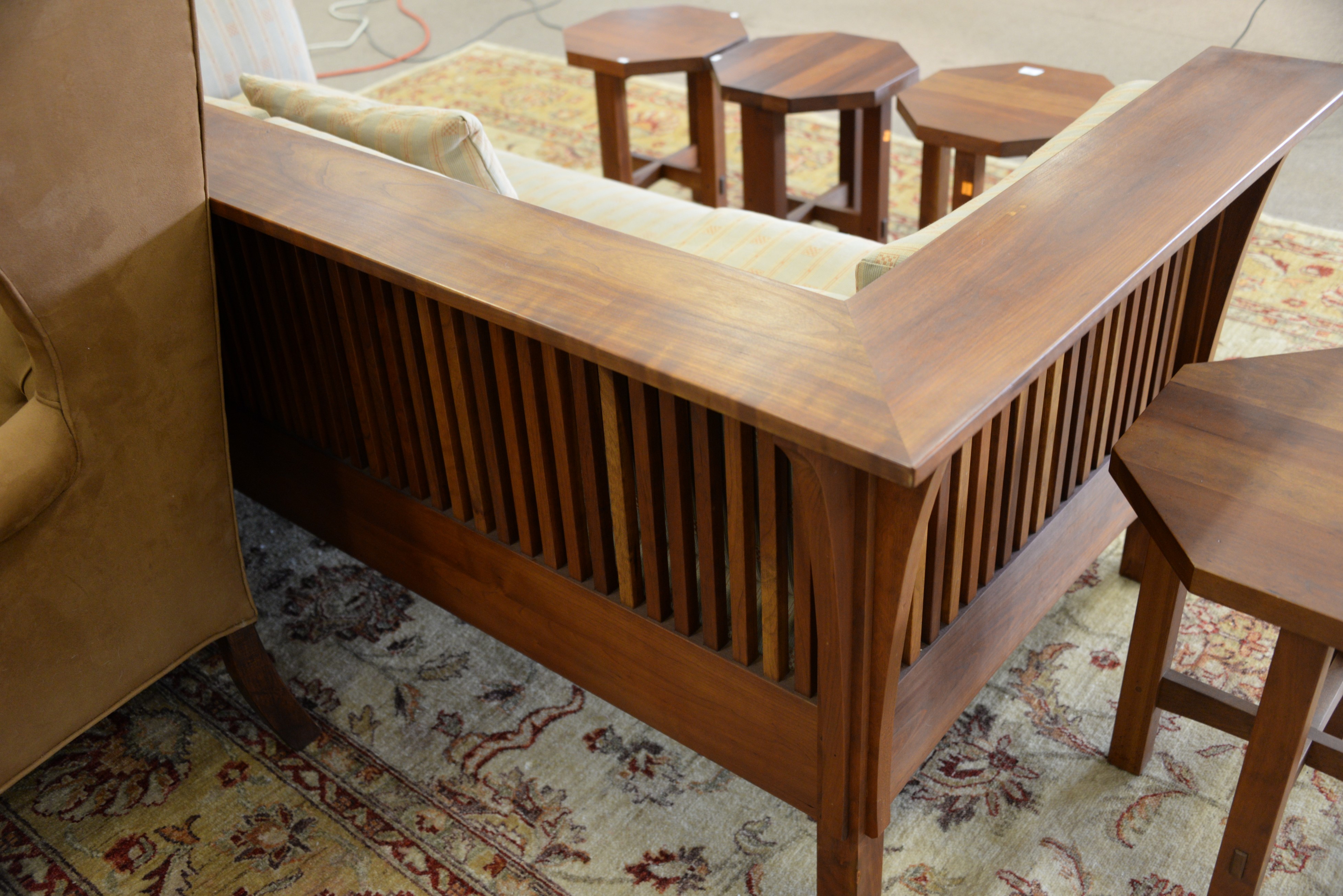 Stickley cherry prairie spindle settle. wd. 84 in.