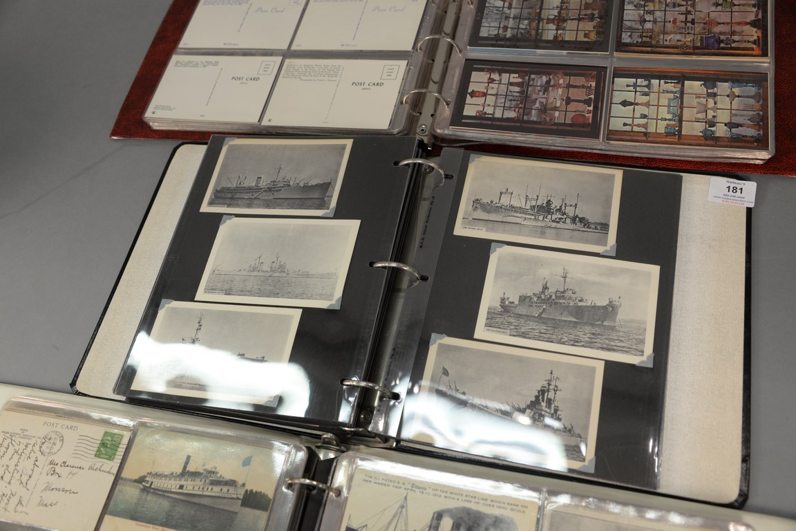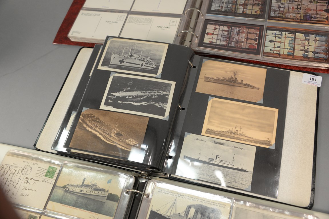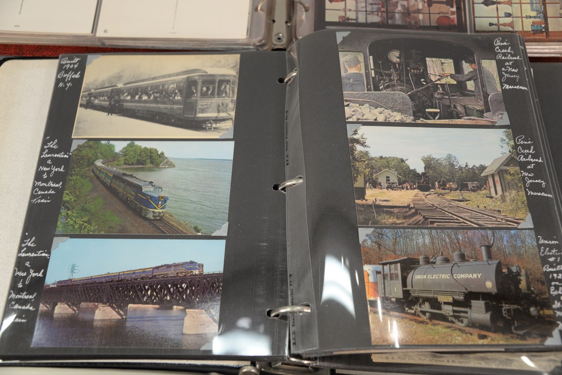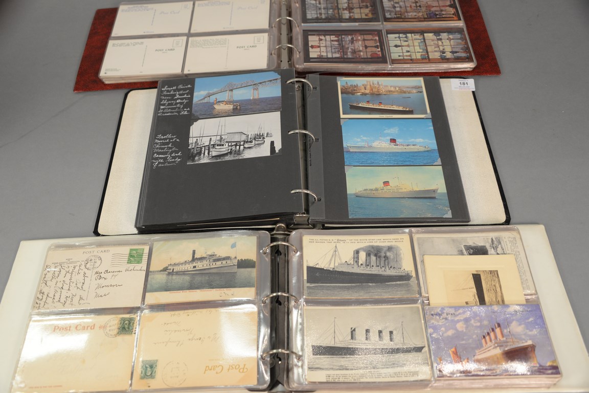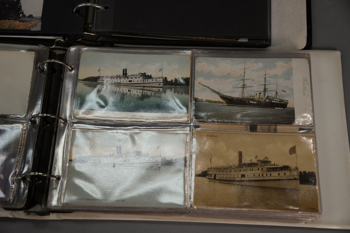 Three postcard albums of cars, antiques, steam ships, trains, etc.