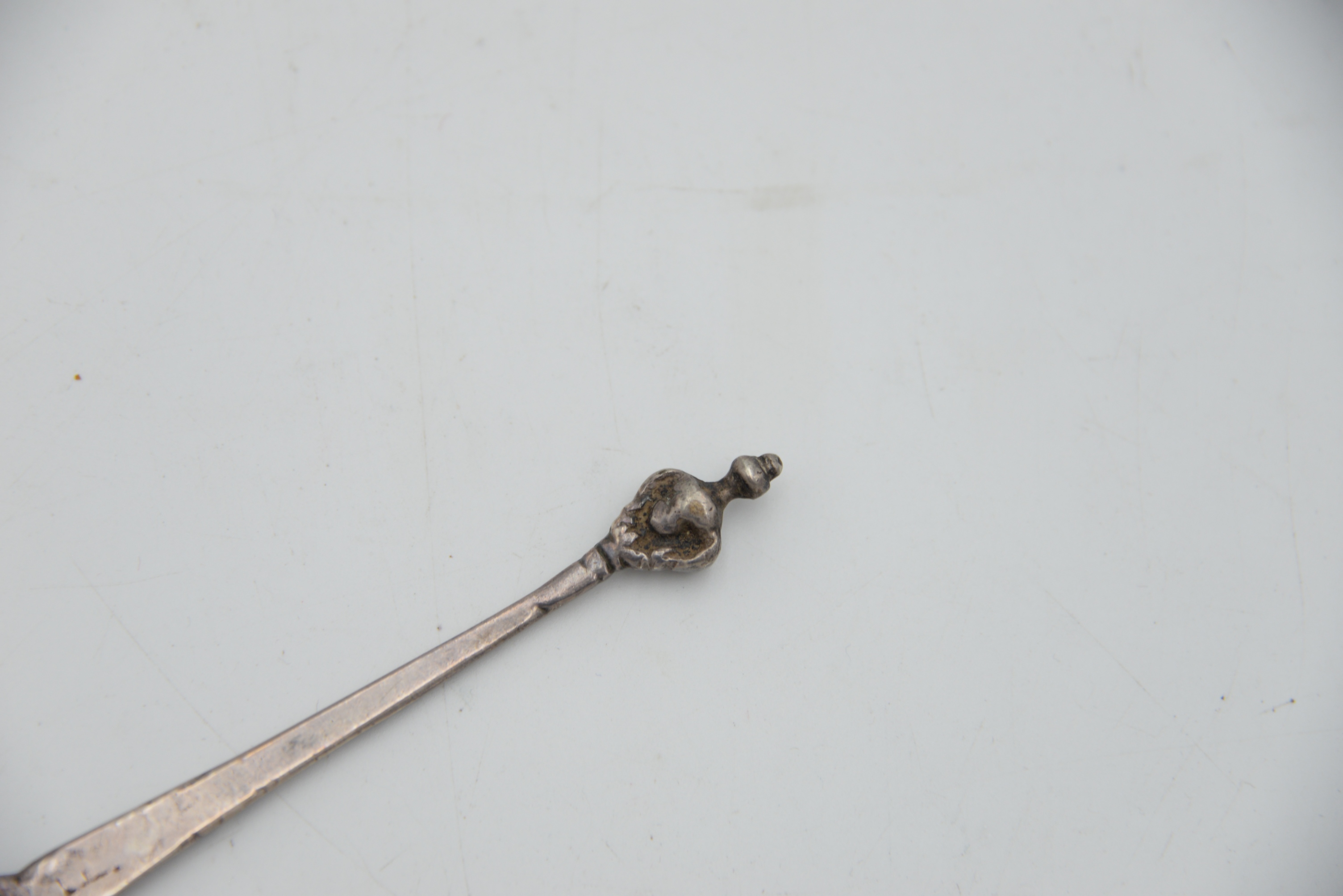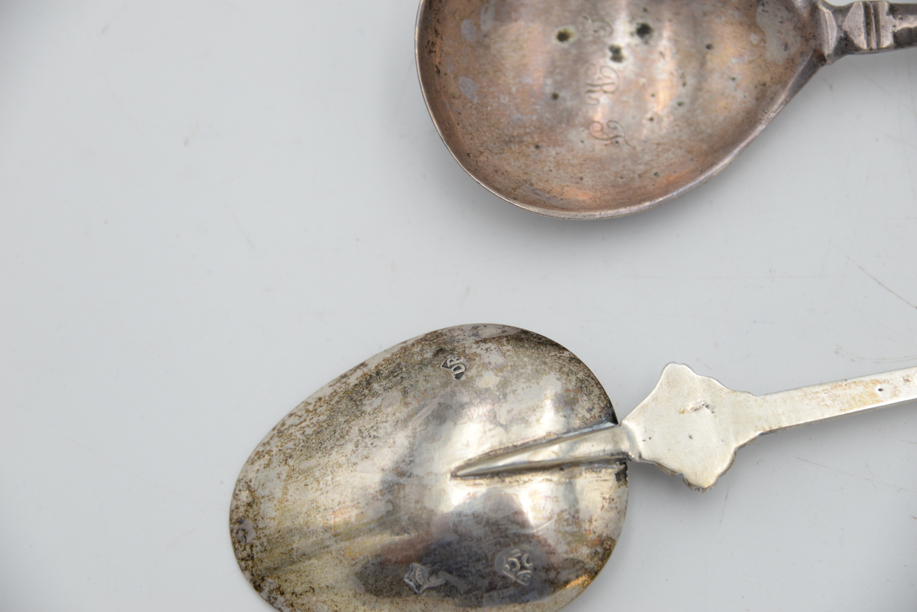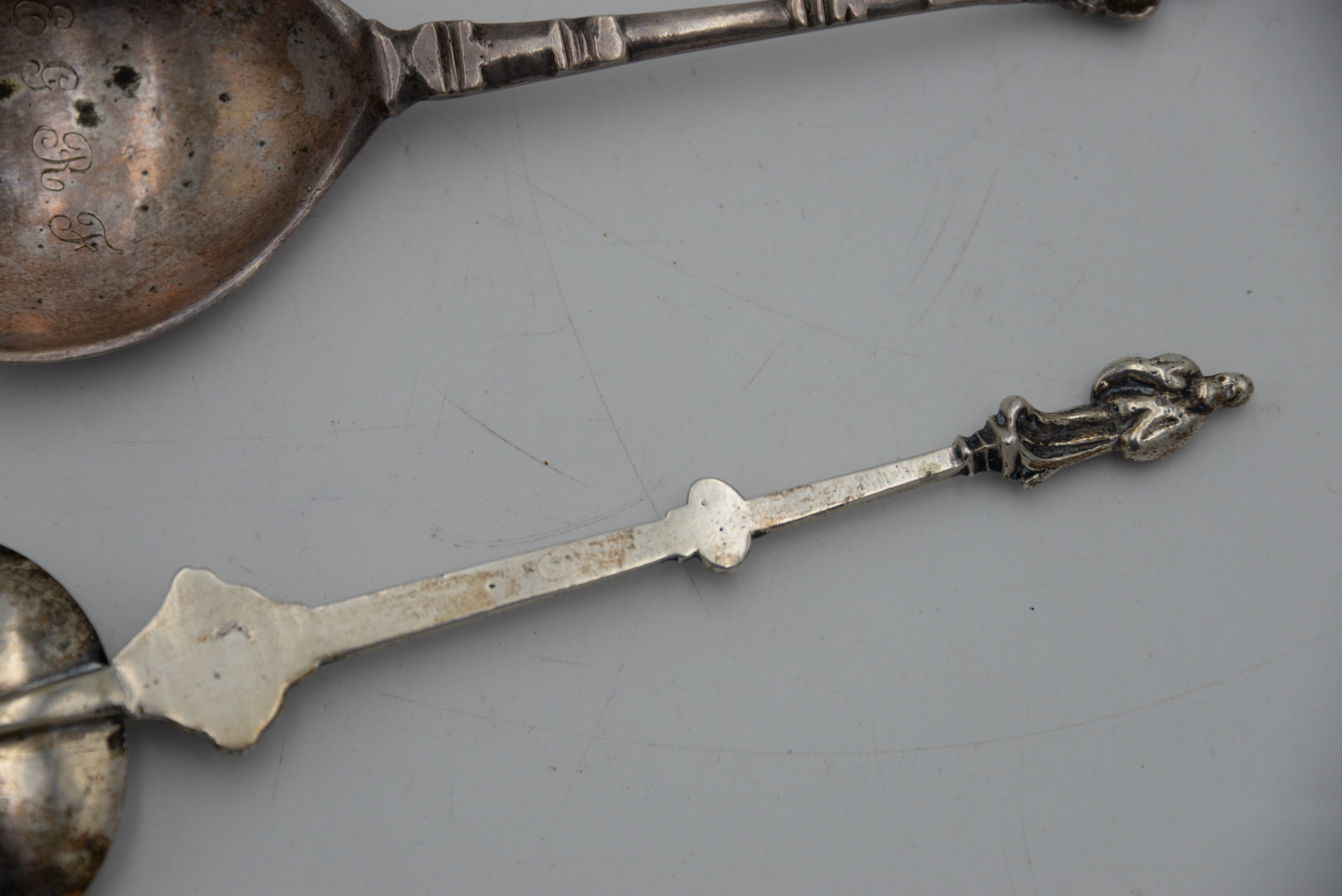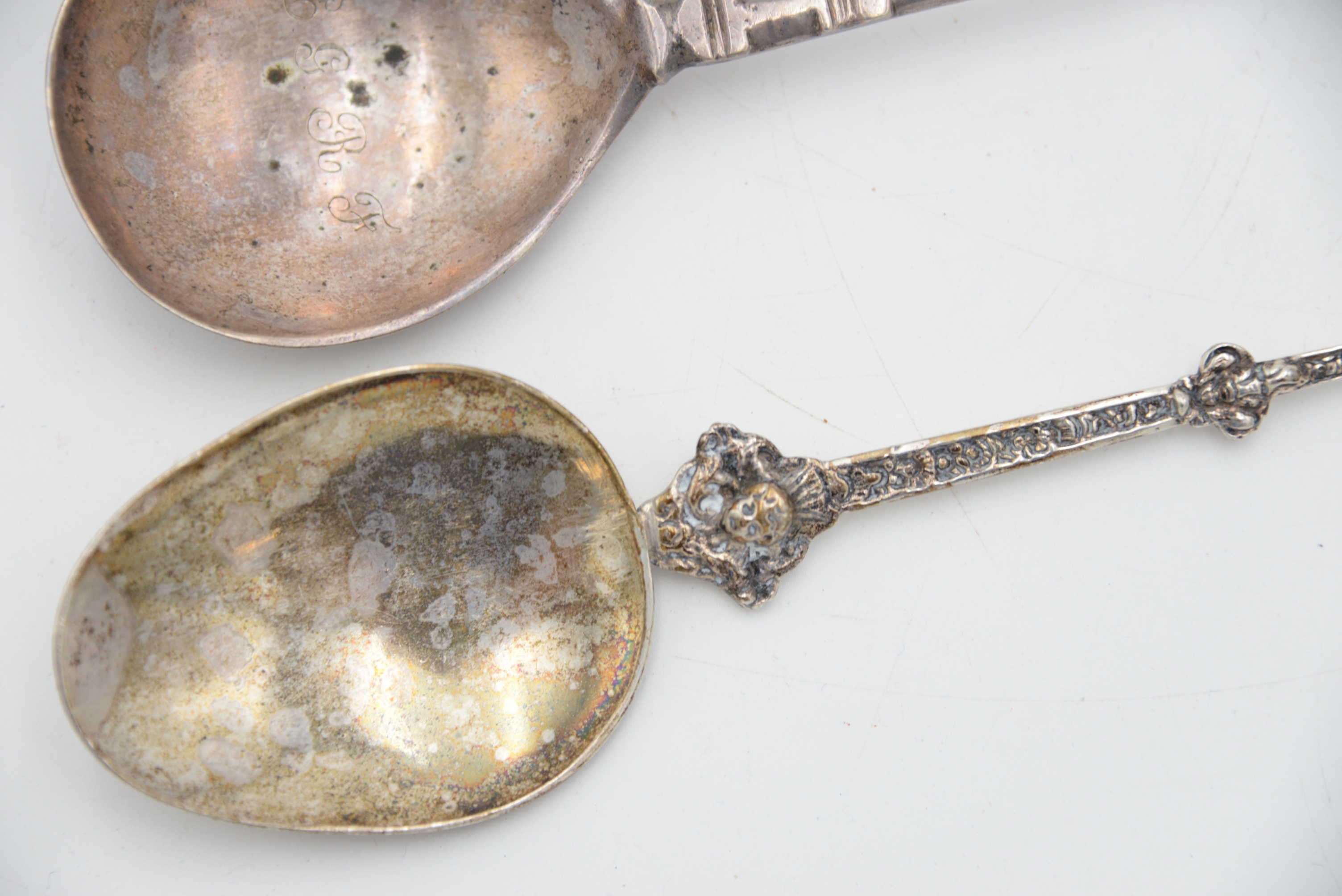 Two Apostle Silver Spoons, having figural end and putti face, one having crown end, possibly Dutch, length 7 1/2 inches, width 2 inches, 2.9 t.oz.