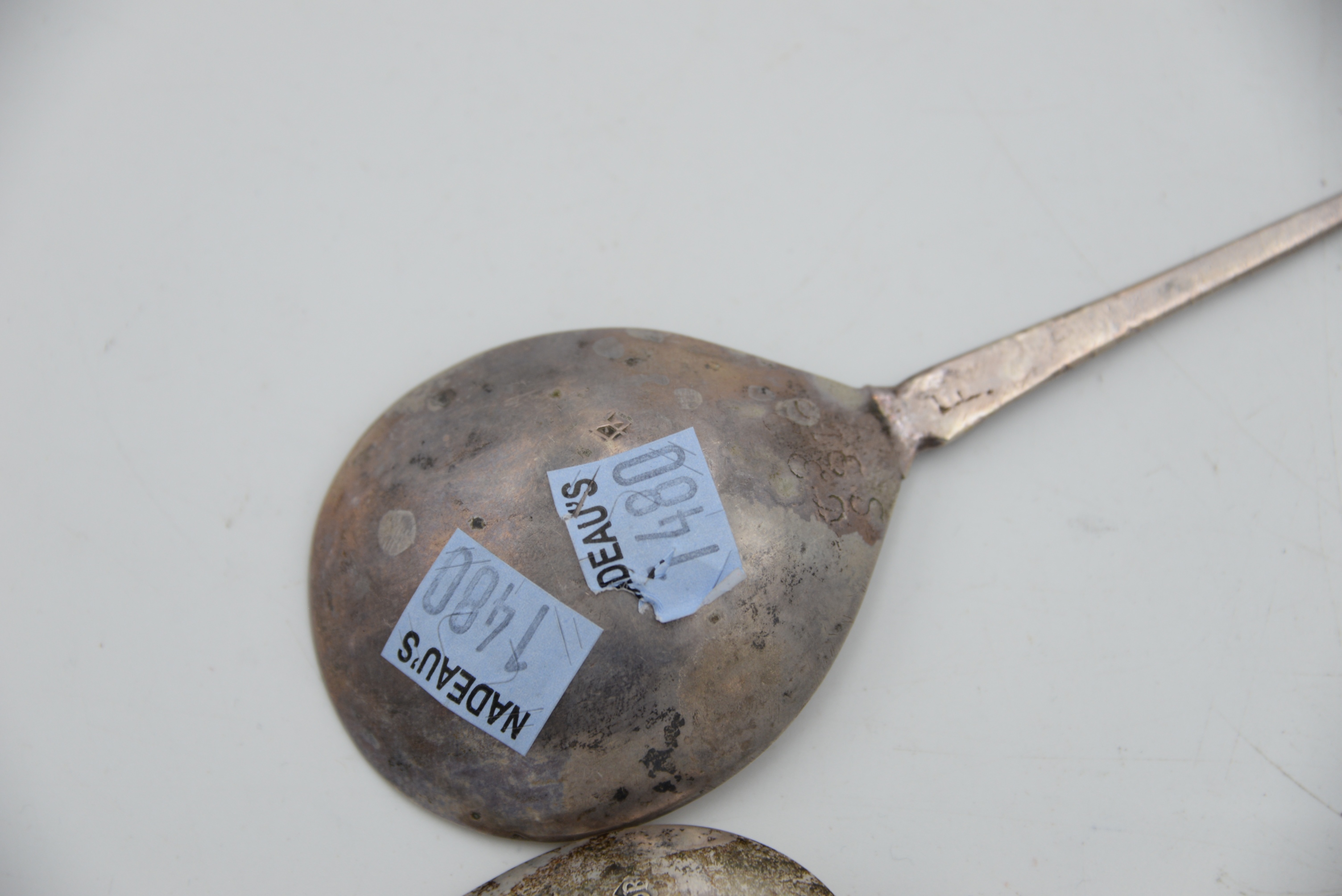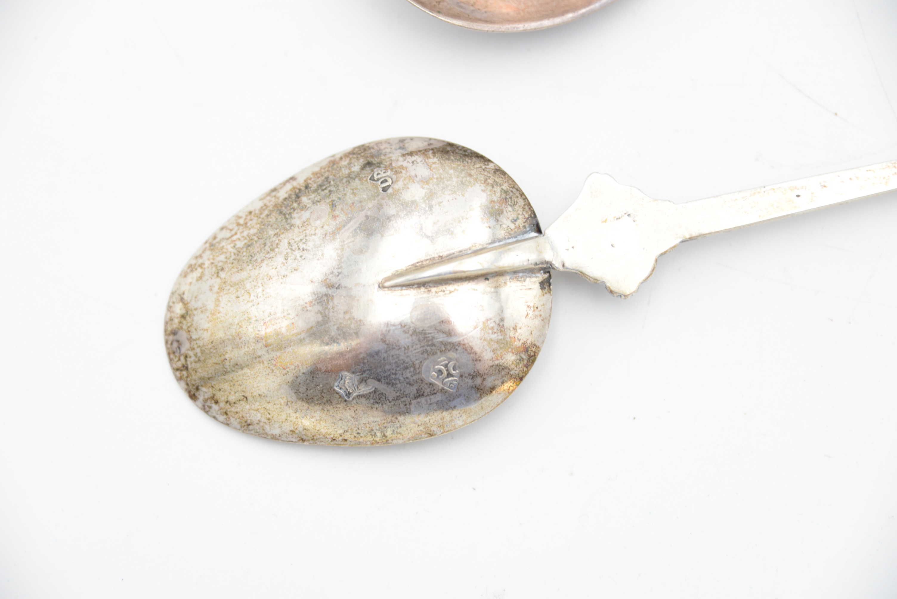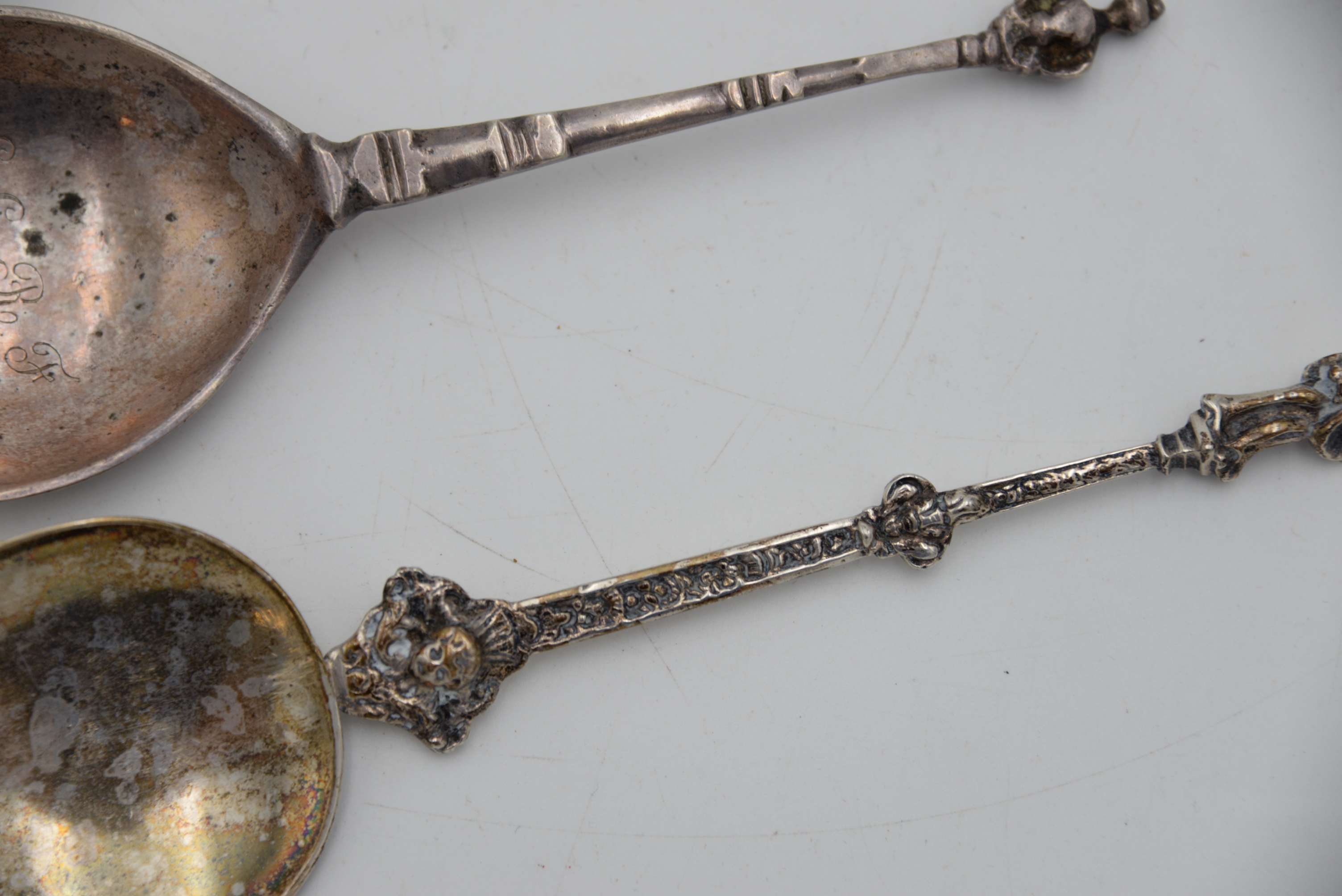 Two Apostle Silver Spoons, having figural end and putti face, one having crown end, possibly Dutch, length 7 1/2 inches, width 2 inches, 2.9 t.oz.