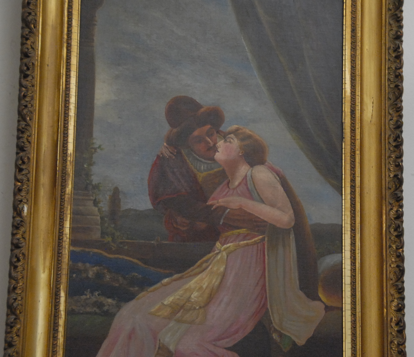 Lot 181: Two paintings to include Josephine Stever 19th/20th century Romantic Scene signed lower right Josephine Stever 1901 25 x 14 and…