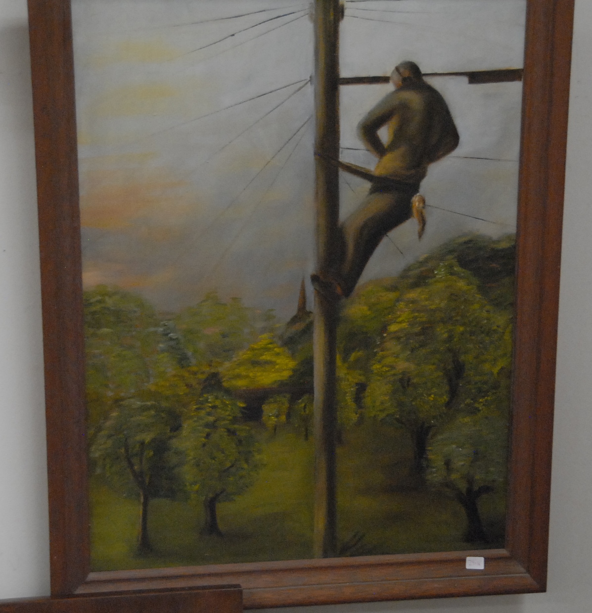 Two paintings to include Josephine Stever 19th/20th century Romantic Scene signed lower right Josephine Stever 1901 25 x 14 and Renie Evants oil on canvas Man on Pole