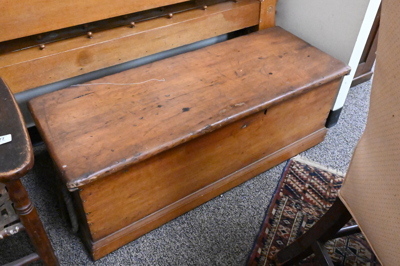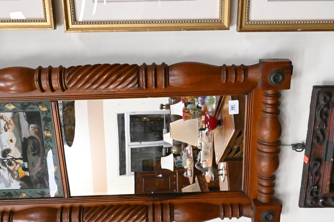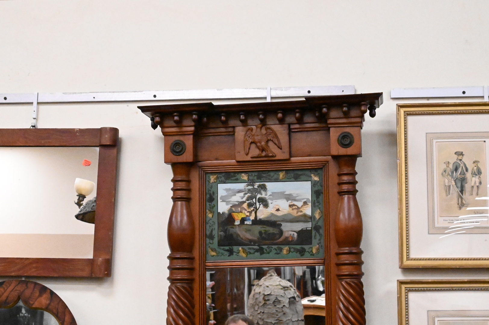Two Piece Lot, to include a two part mirror, along with a lift top floor chest, circa 1840, damage in paint, height 40 inches, mirror 19″ x 37″.