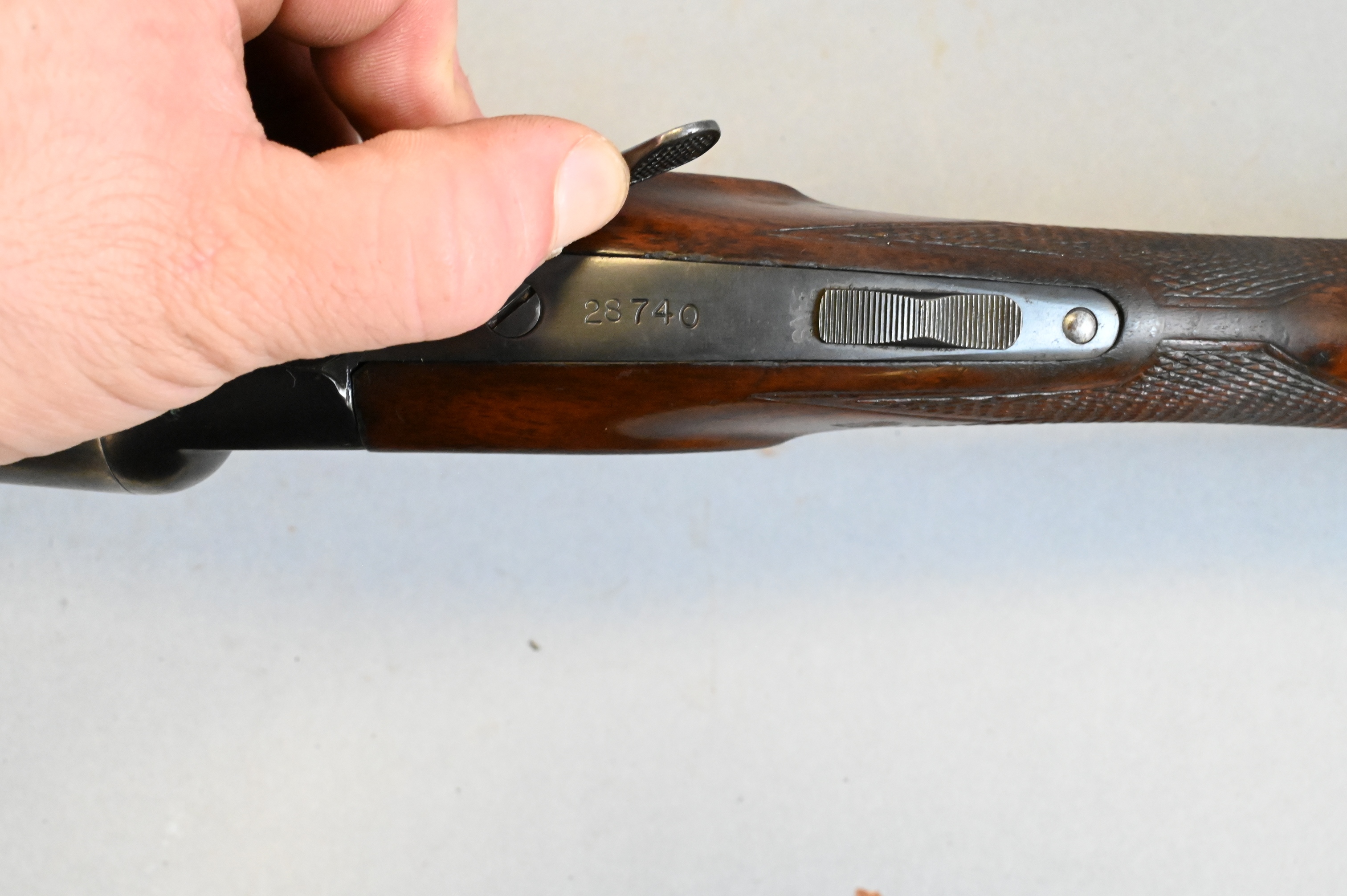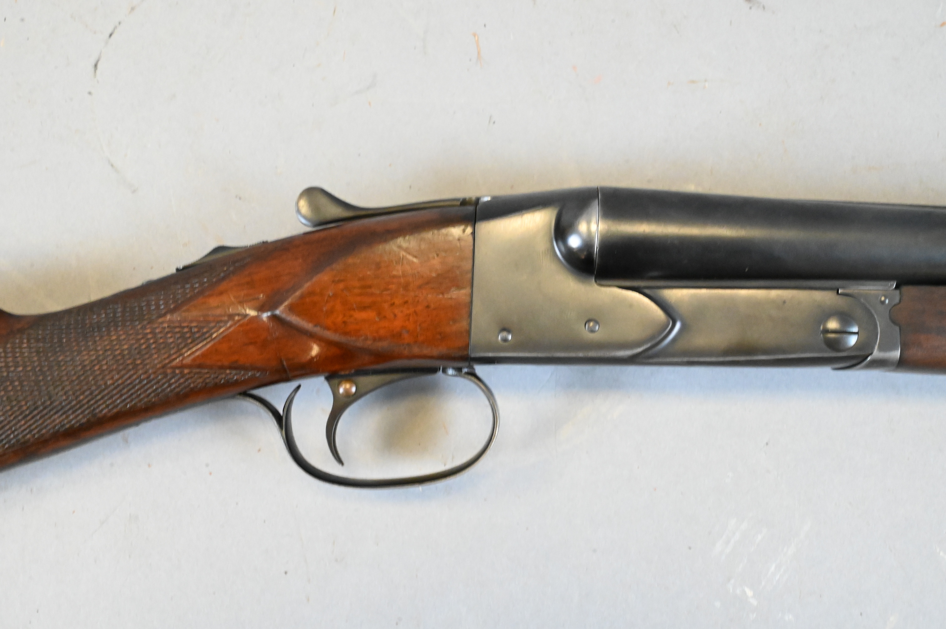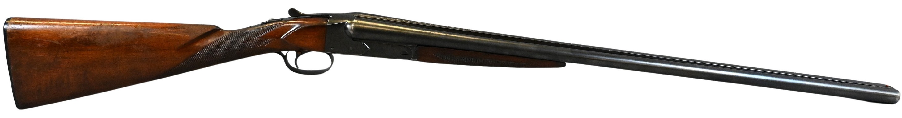 having checkered English stock, single trigger and two barrels,
