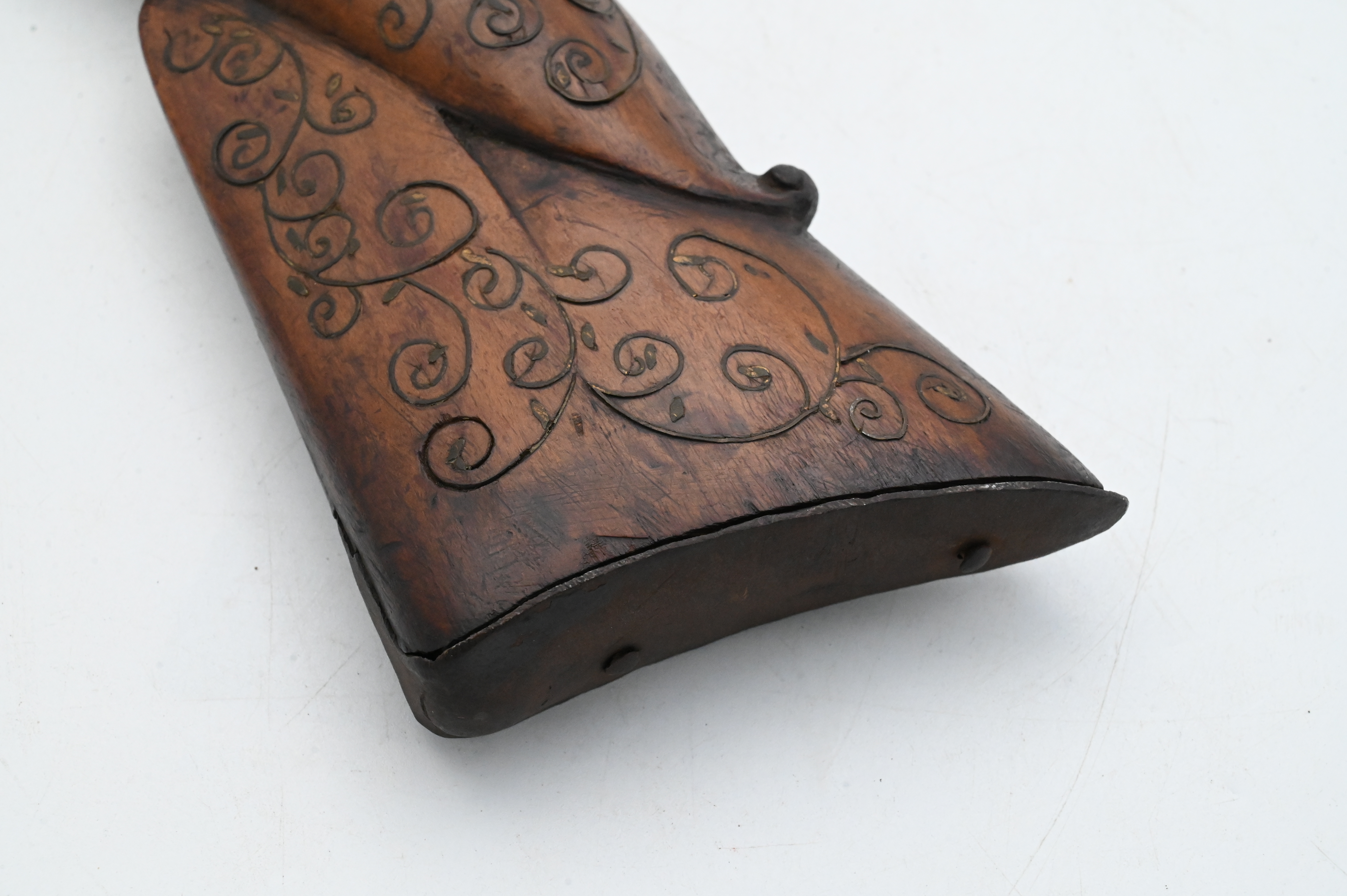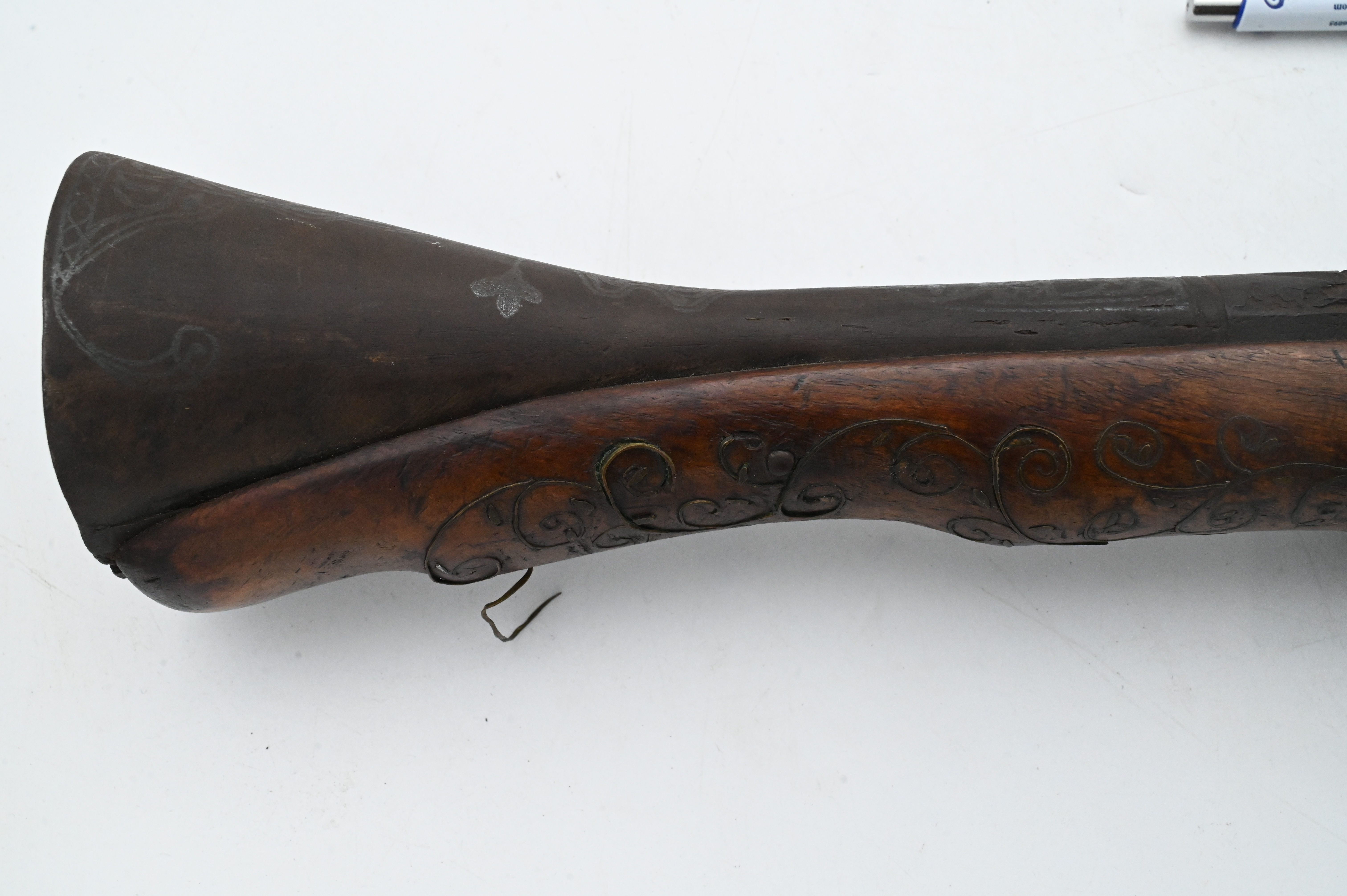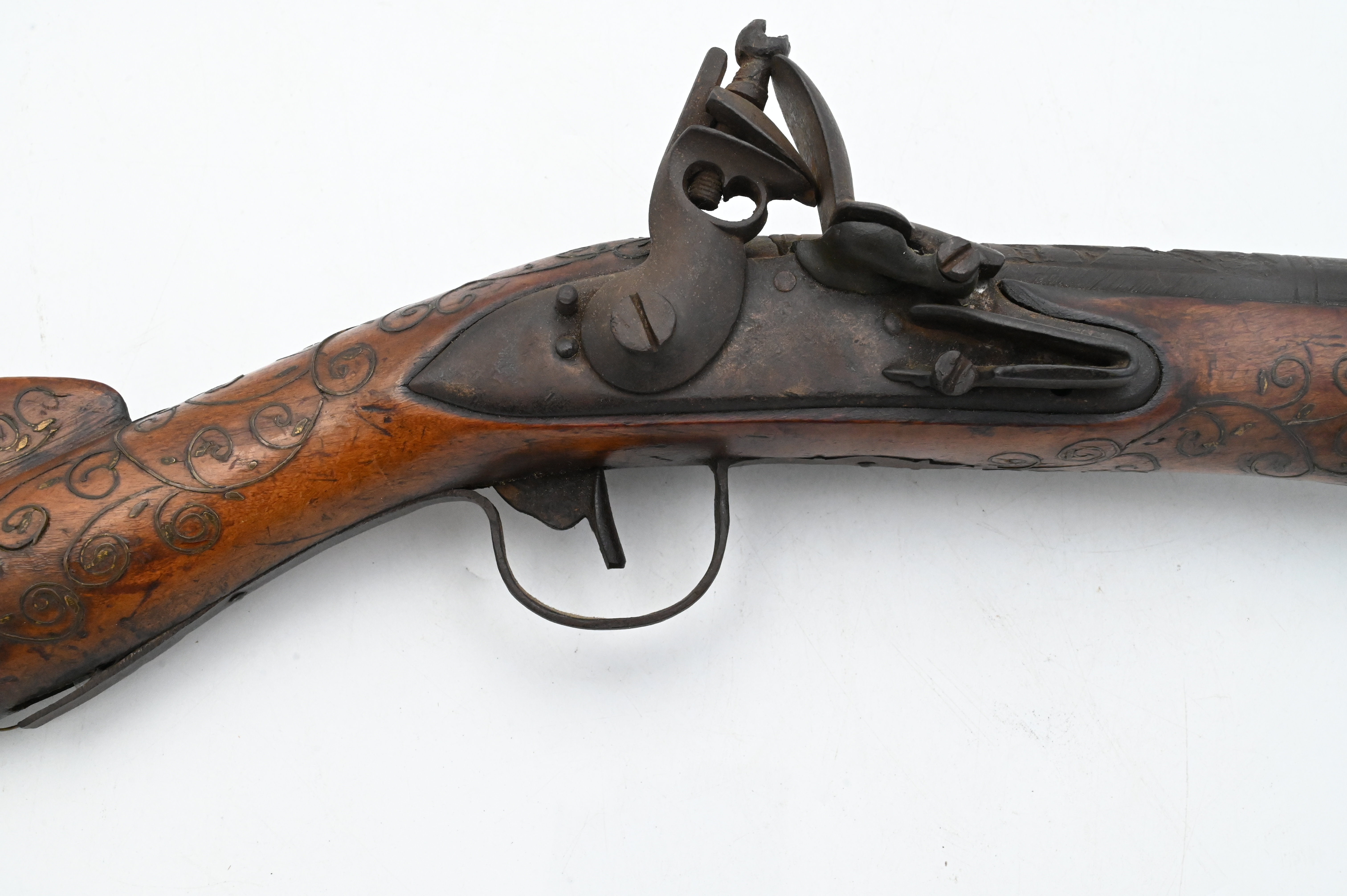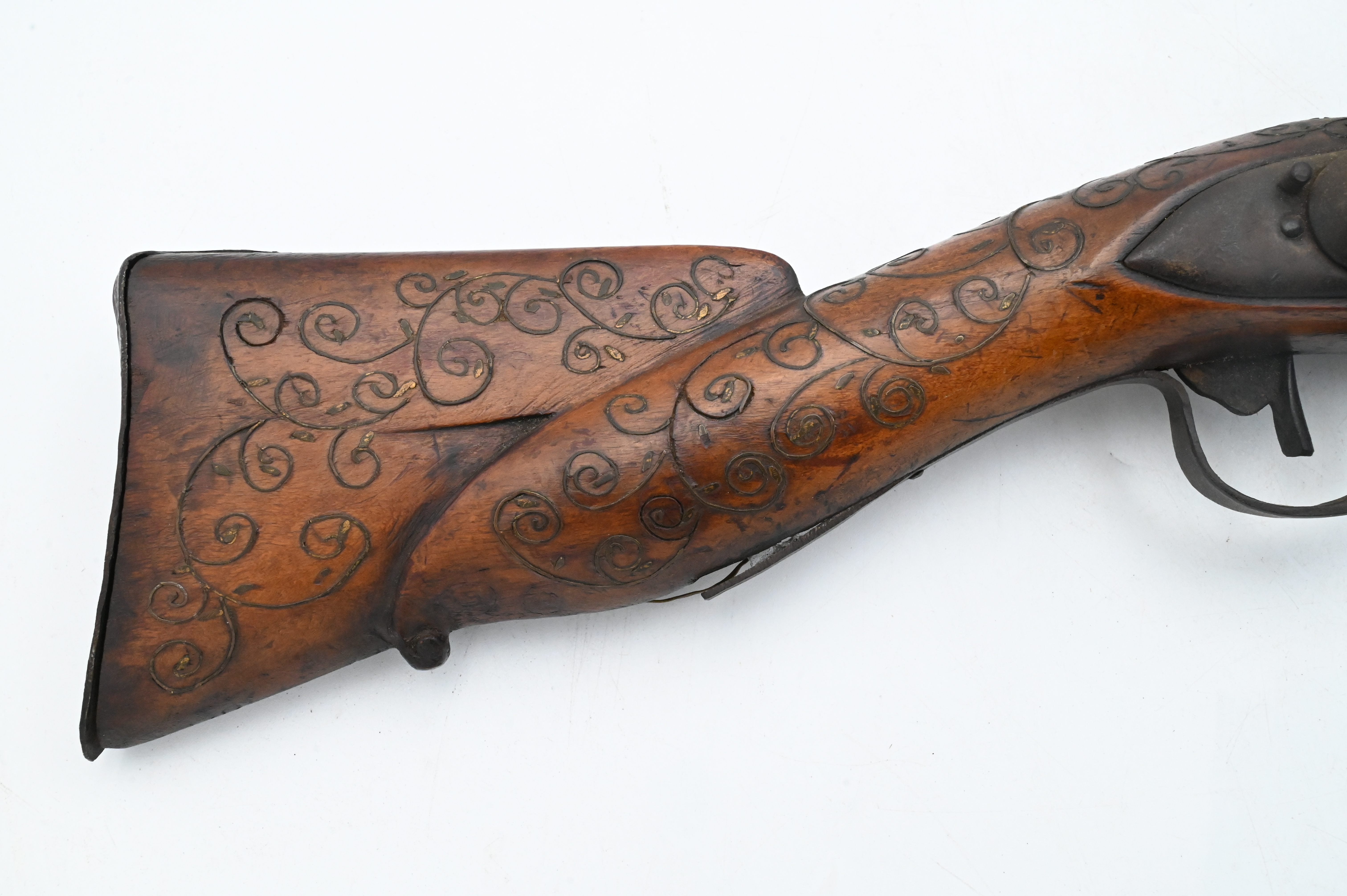 The walnut stock extensively decorated with brass inlay throughout the butt and forestock, the barrel with decorative motifs to the top flat, iron lock and trigger guard, and flaring muzzle. A well-made and attractively embellished example retaining dark patina and period character.