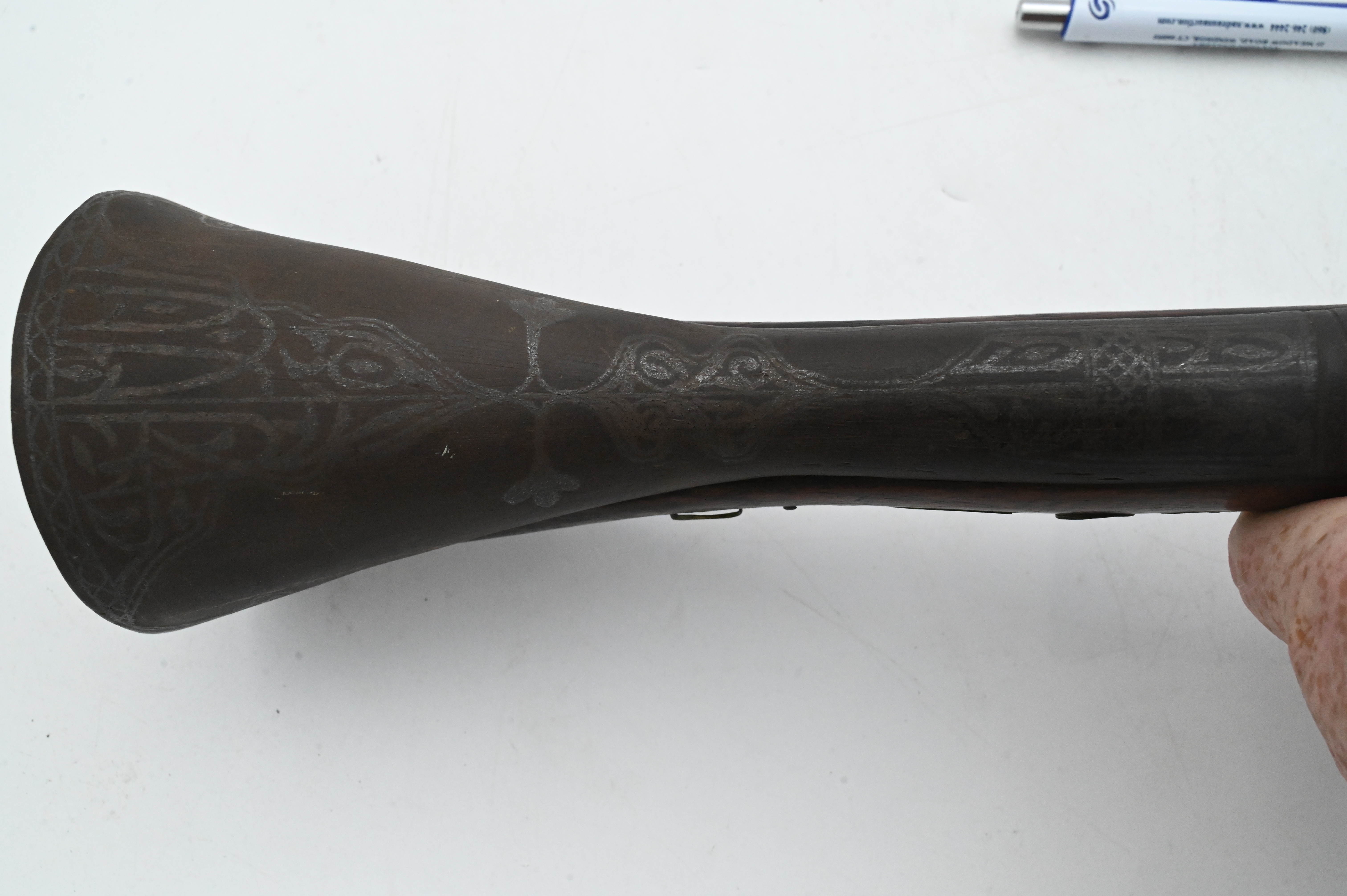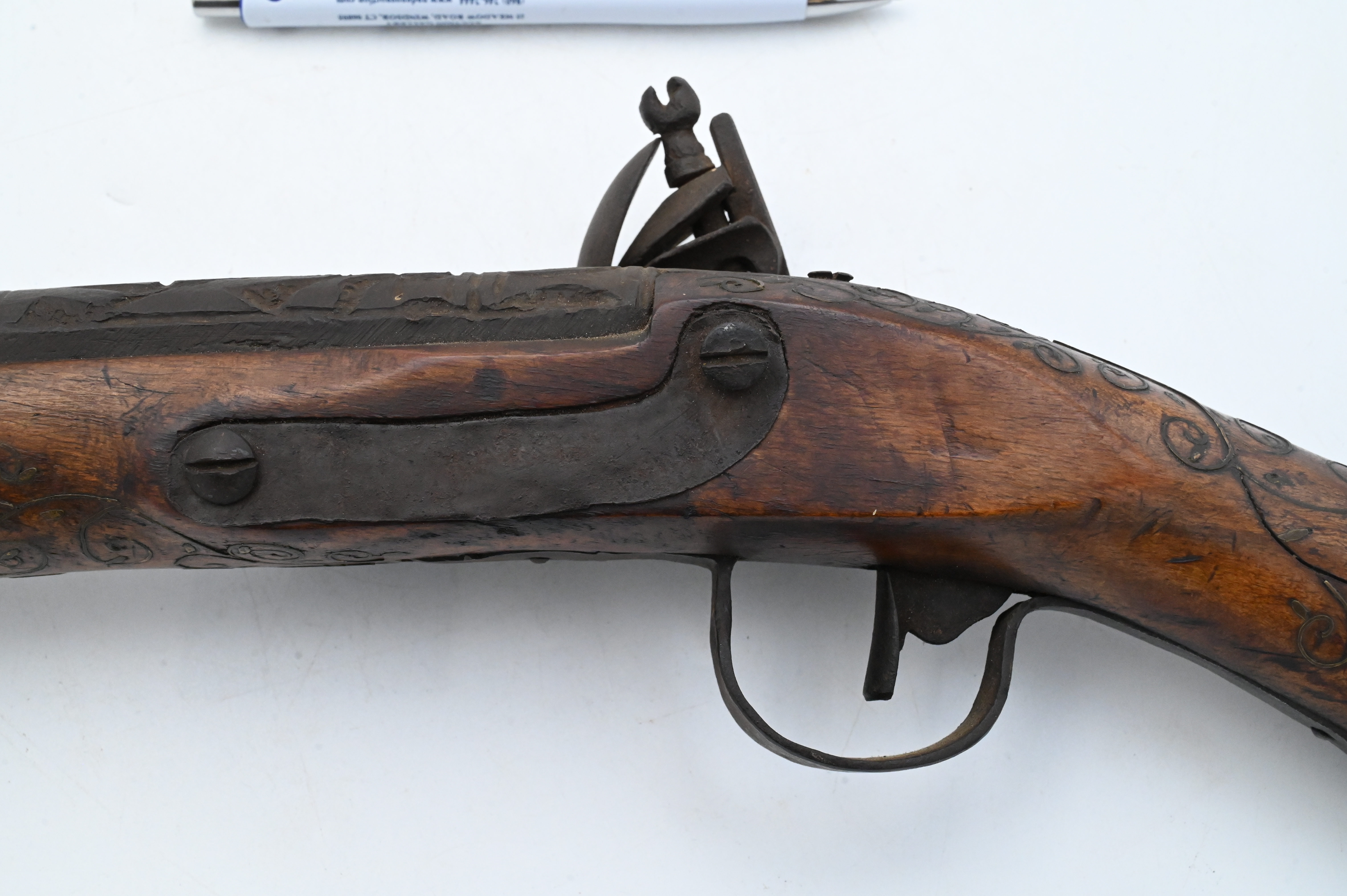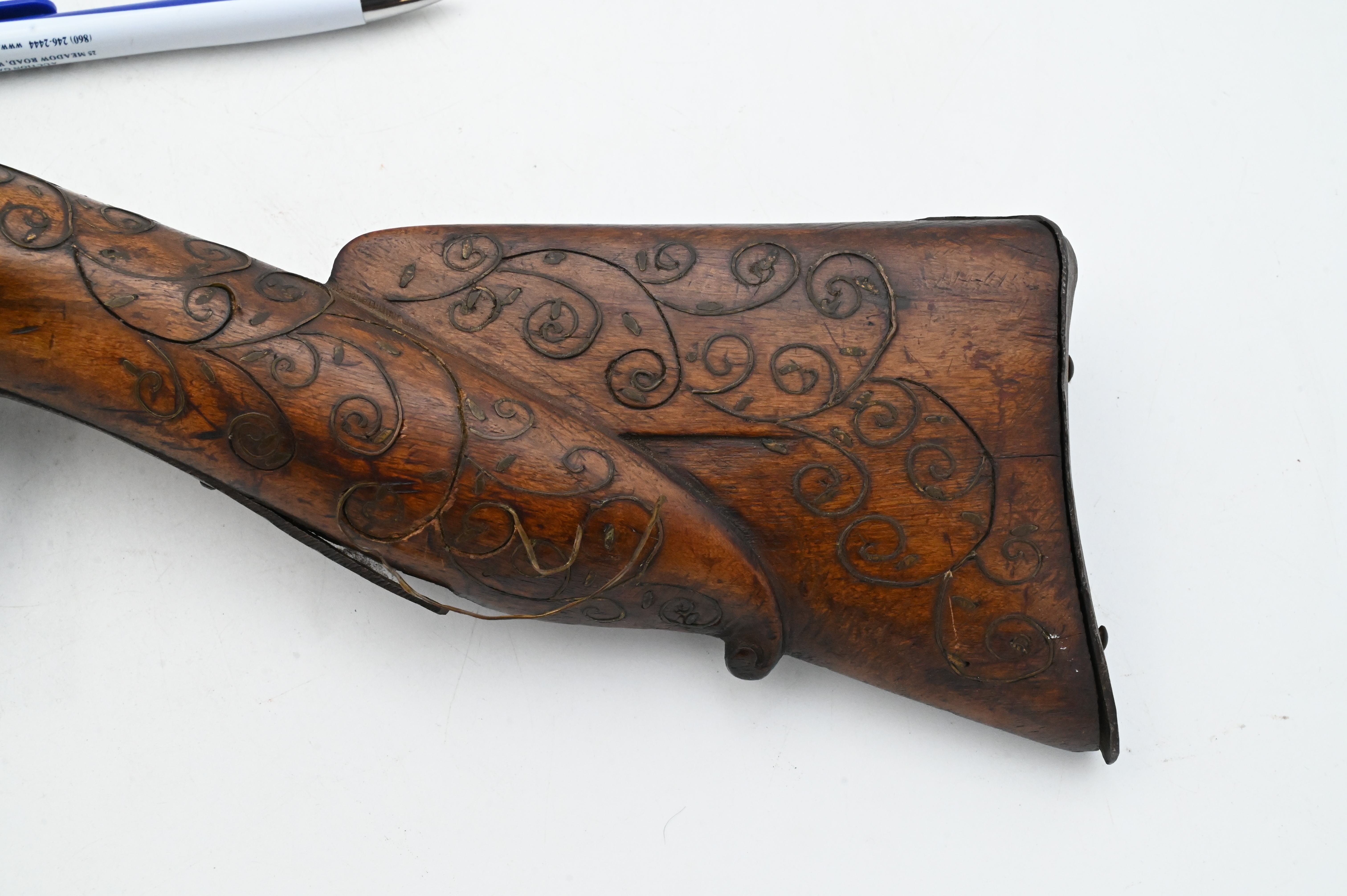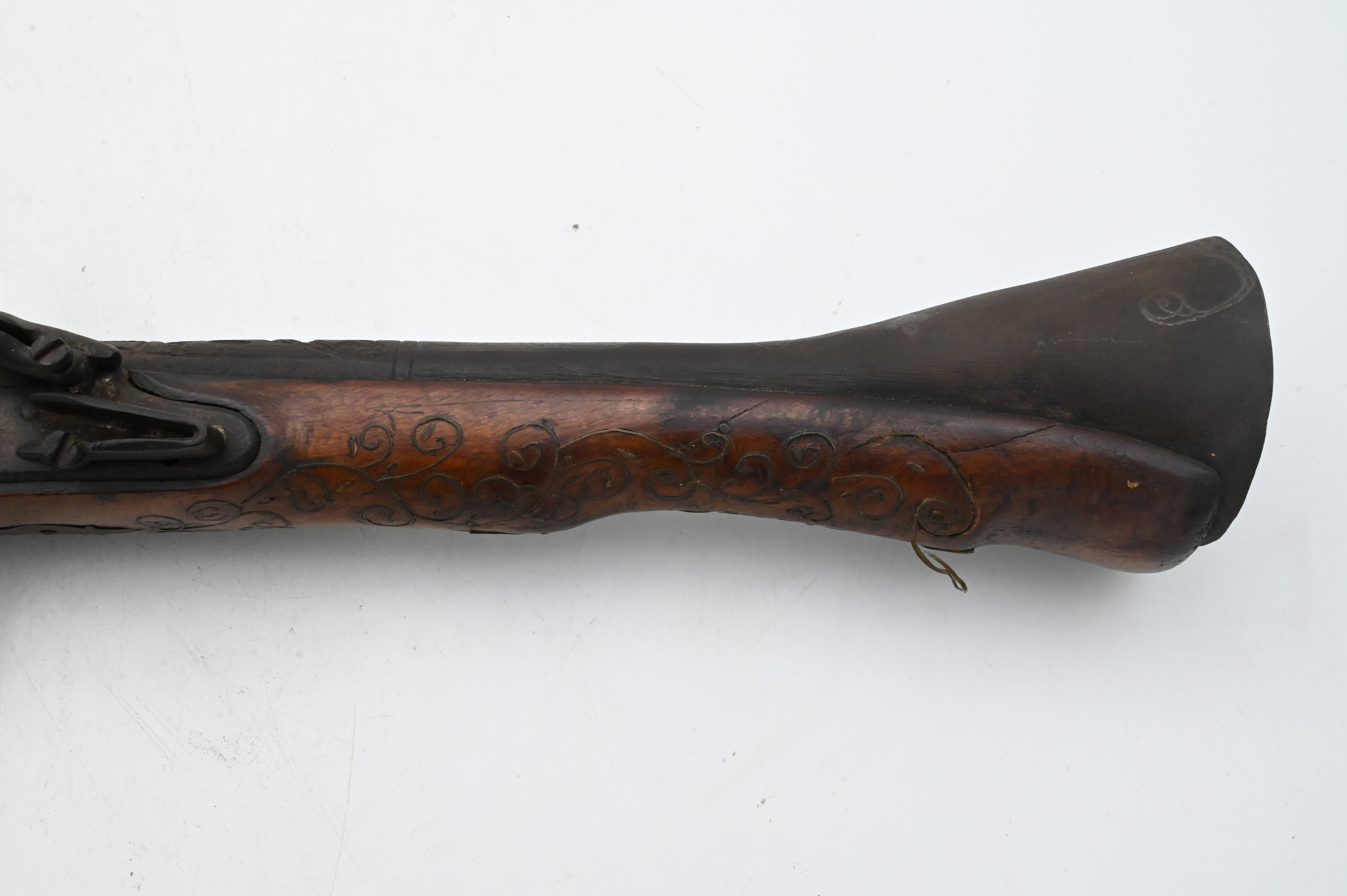 The walnut stock extensively decorated with brass inlay throughout the butt and forestock, the barrel with decorative motifs to the top flat, iron lock and trigger guard, and flaring muzzle. A well-made and attractively embellished example retaining dark patina and period character.