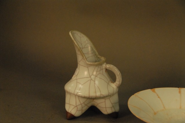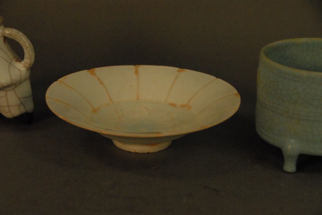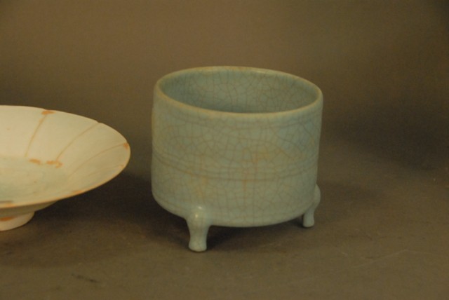 3 glazed pieces to include a white glazed porcelain bowl having incised decoration in center, a white crackled glazed 3 footed vessel and a crackle glazed 3 footed pot