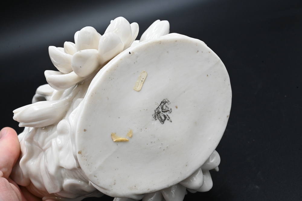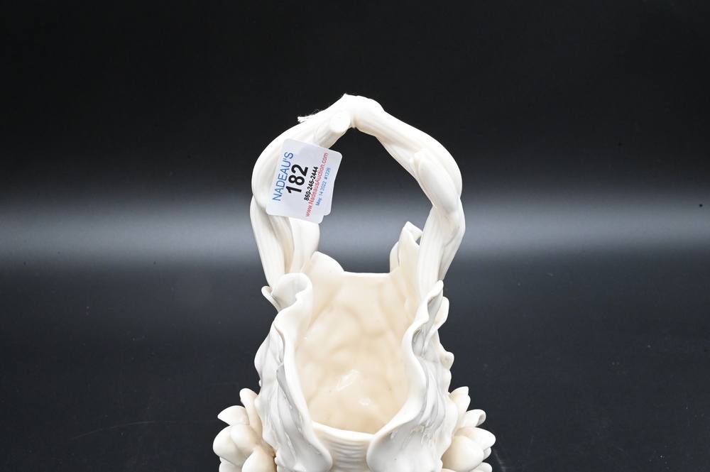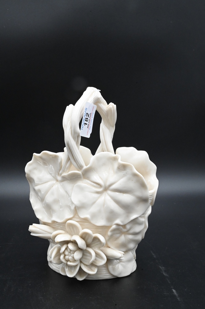 Lot 182: Belleek Lily Pad and Lotus Handled Basket, early black mark on bottom, height 9 inches. Provenance: Collections of Norma Reilly, New Jersey.