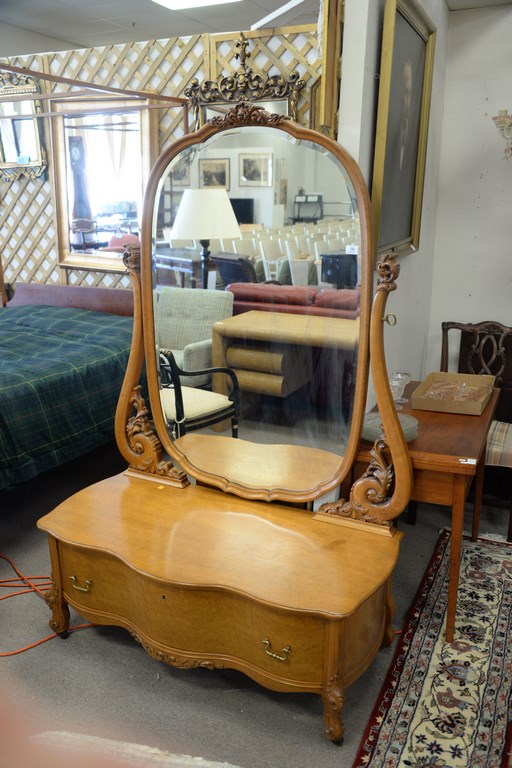 Birdseye maple princess dresser and shaped mirror attributed to Horner. ht. 72 1/2 in. wd. 48 in.