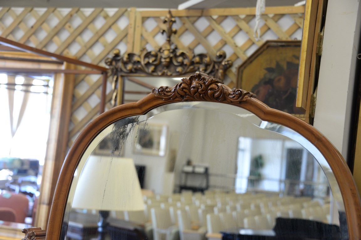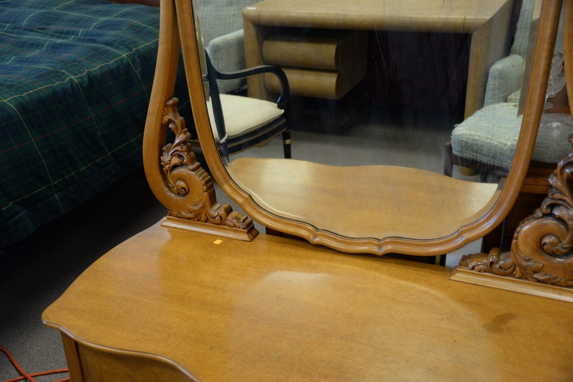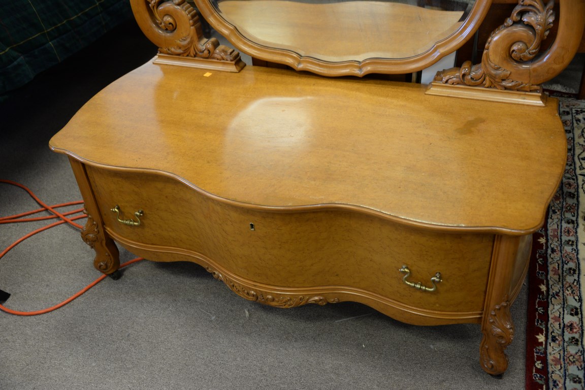 Lot 182: Birdseye maple princess dresser and shaped mirror attributed to Horner. ht. 72 1/2 in. wd. 48 in.