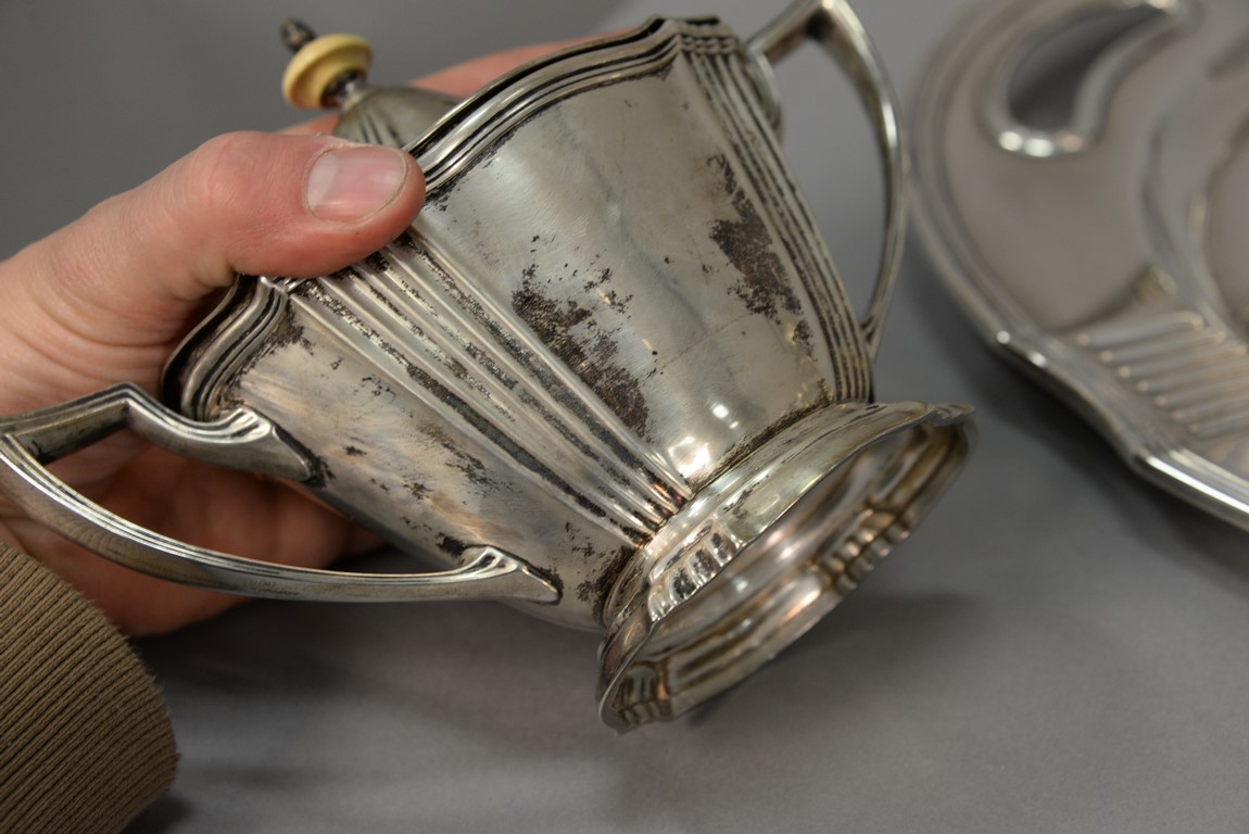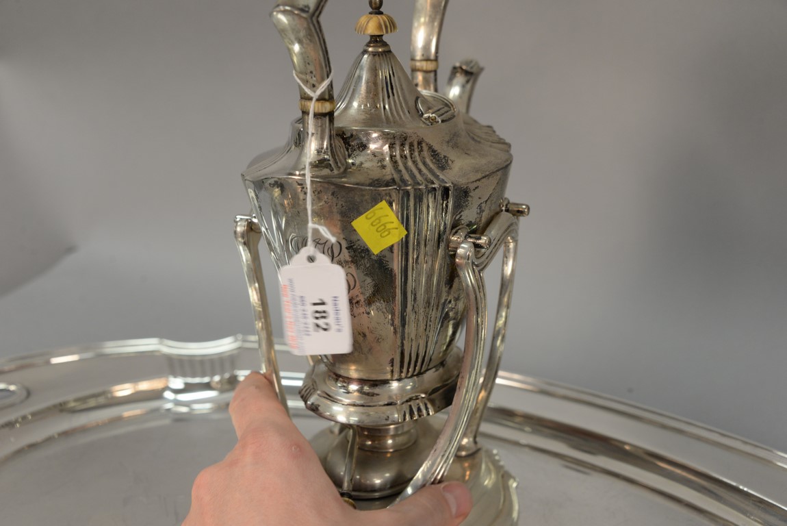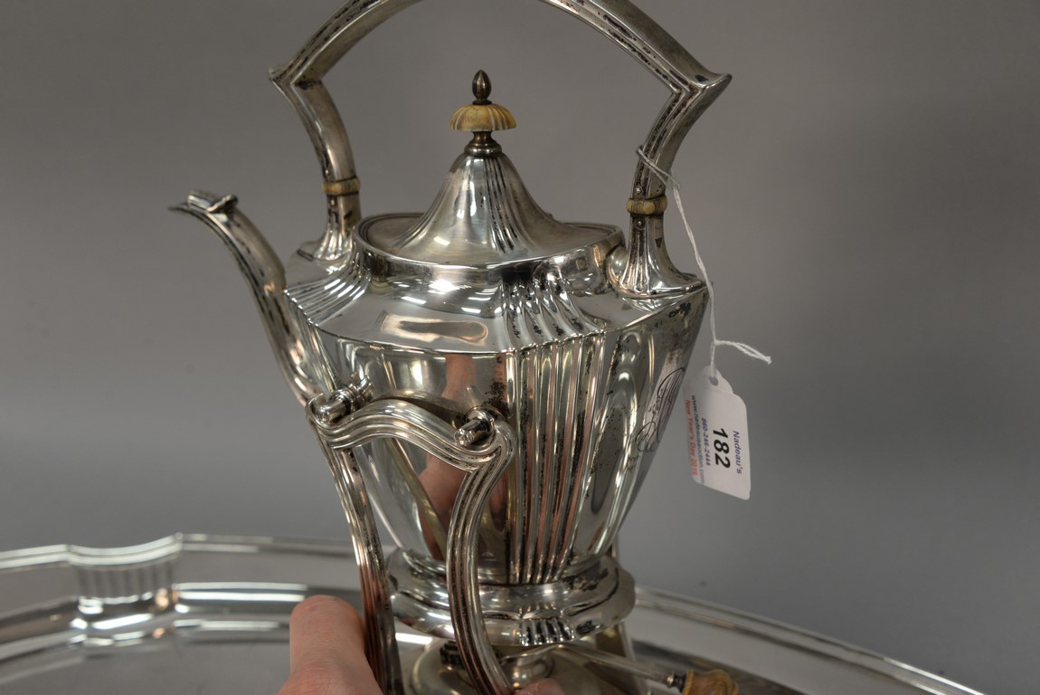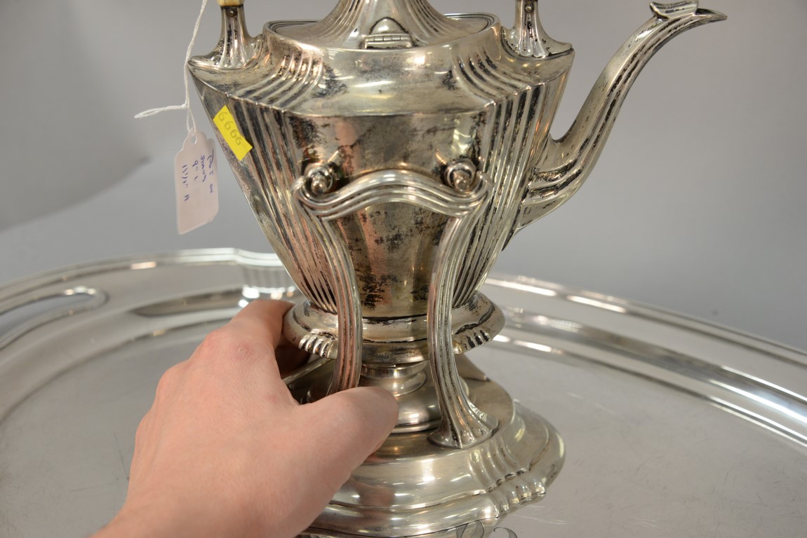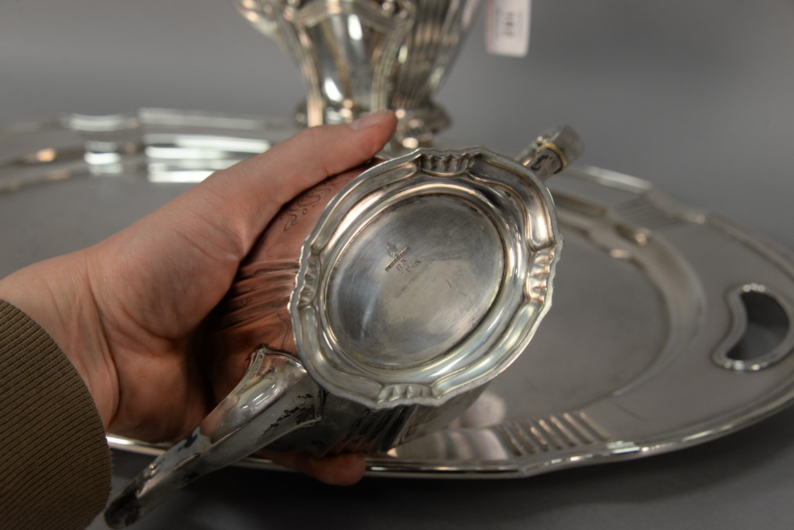 Lot 182: Brand-Chatillon & Co. seven piece sterling silver tea and coffee set including large tray, tilting pot on stand, coffee pot, teapot,…
