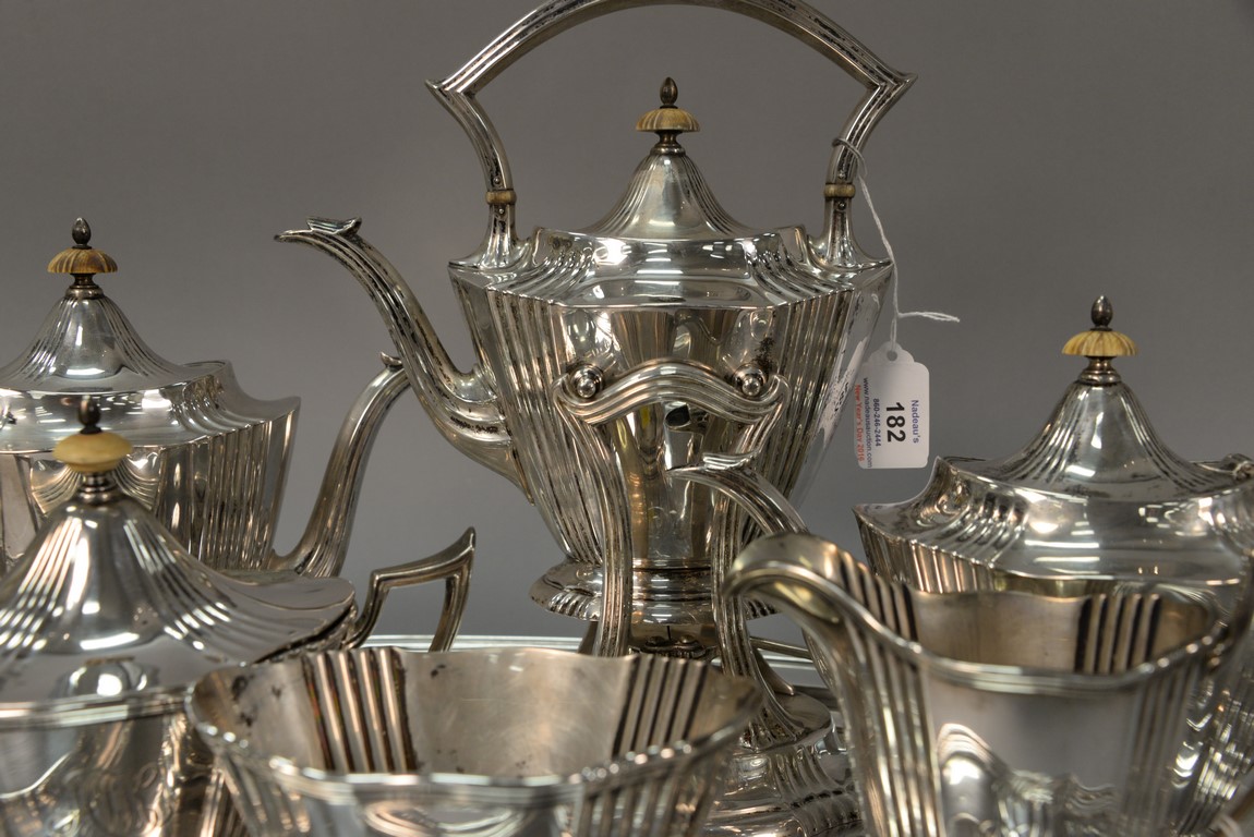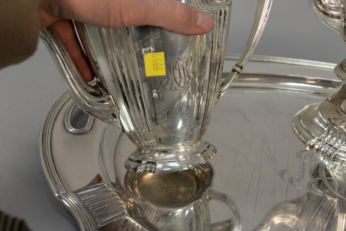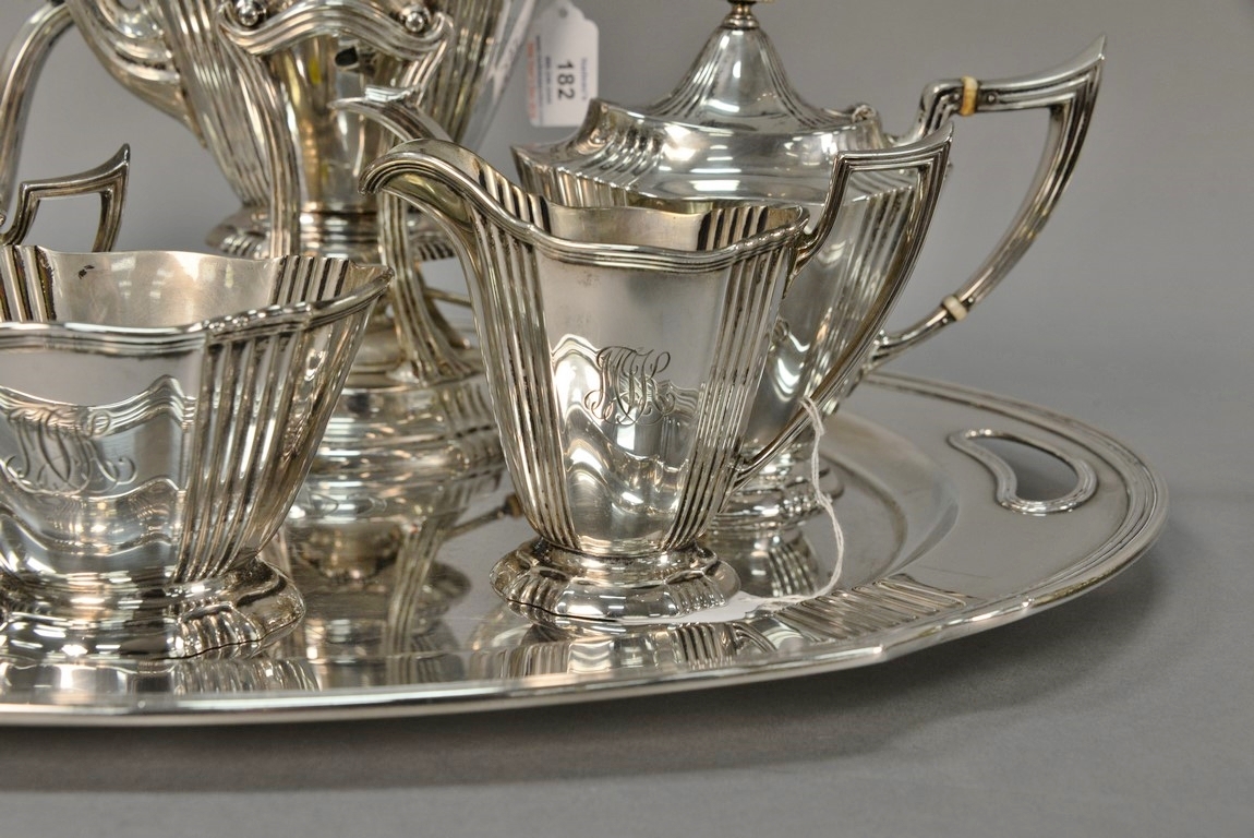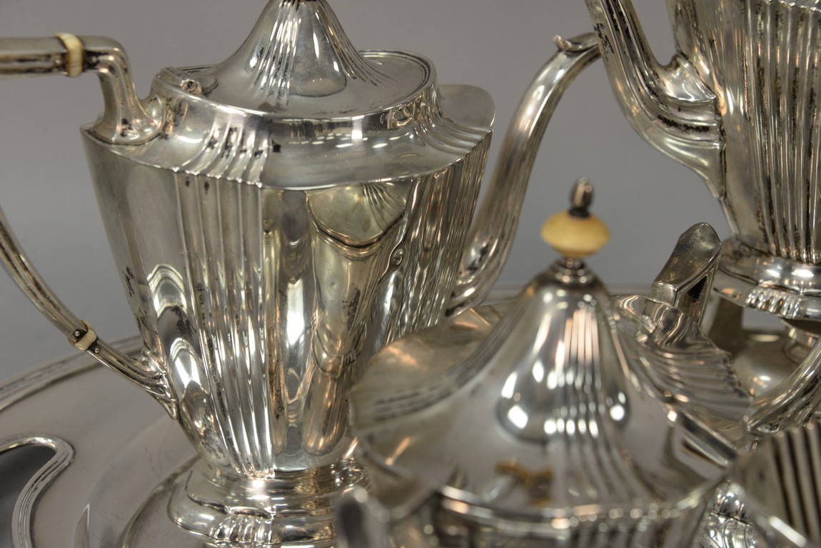 Brand-Chatillon & Co. seven piece sterling silver tea and coffee set including large tray, tilting pot on stand, coffee pot, teapot, sugar, creamer, and waste bowl.