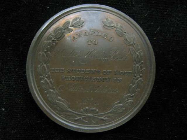 Bronze medal marked Awarded to Walter H. Potter, Student of the Most Proficiency in Natural Science, 1871