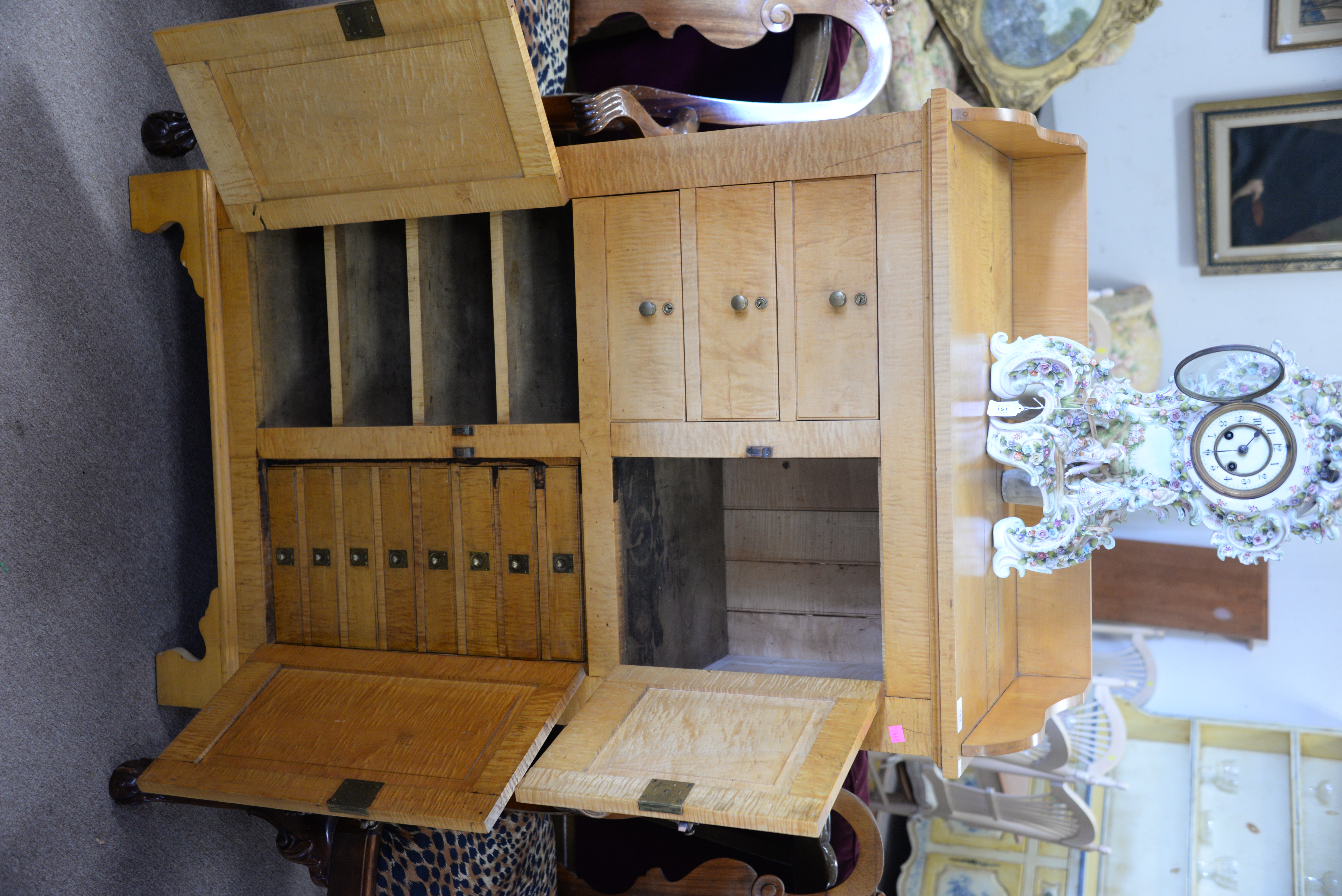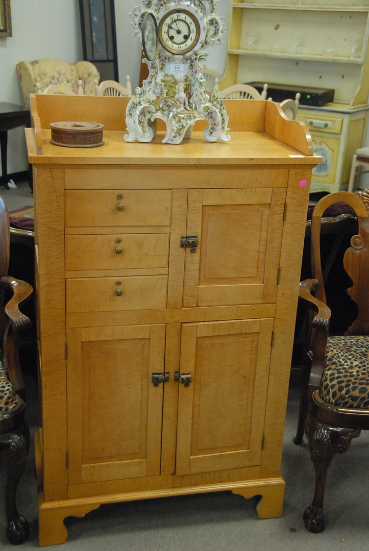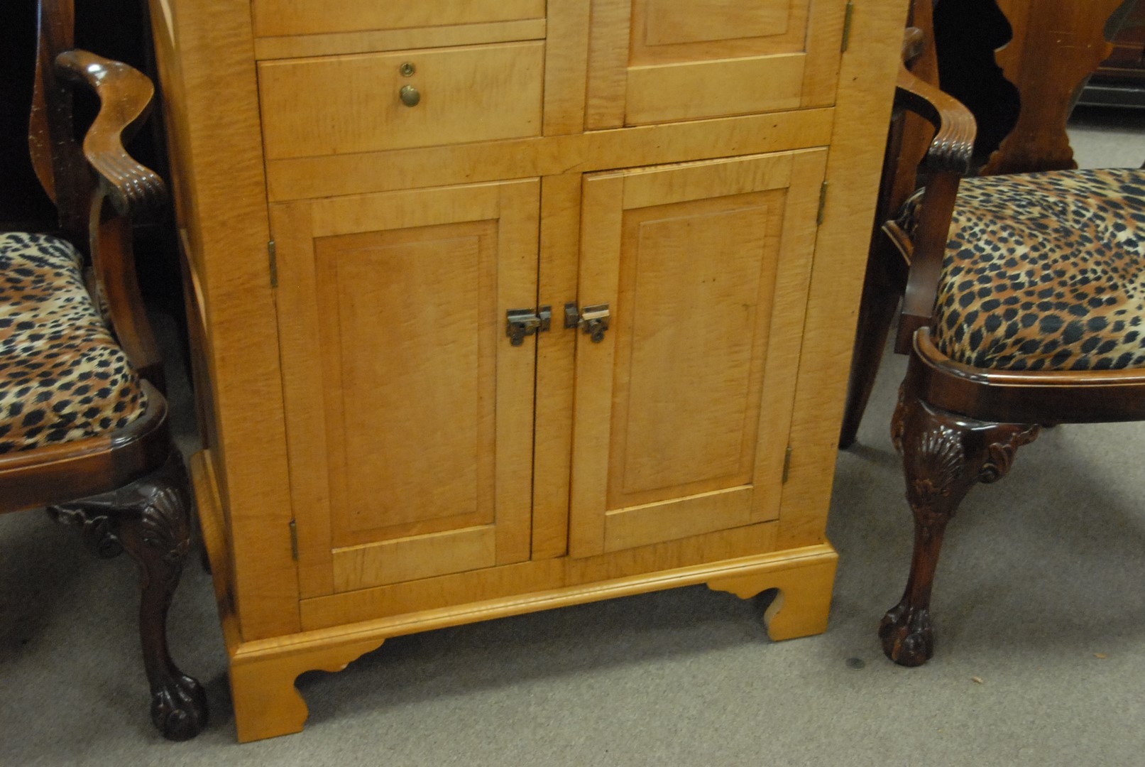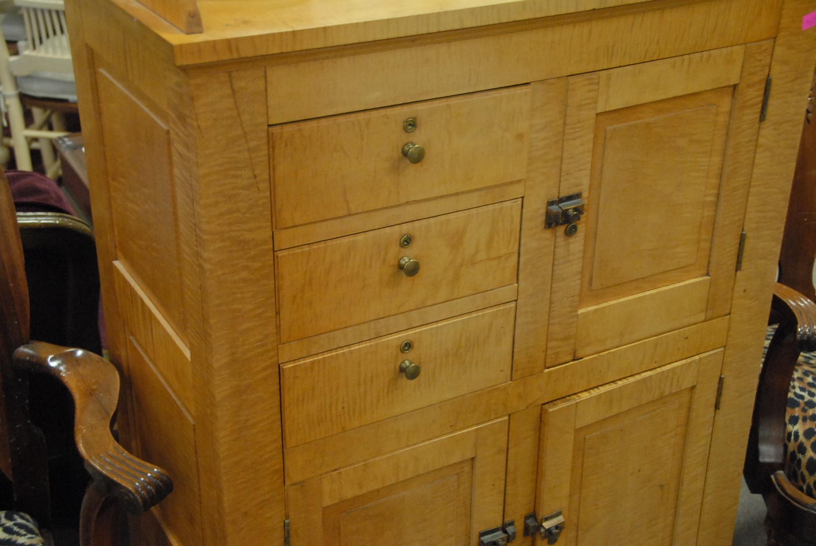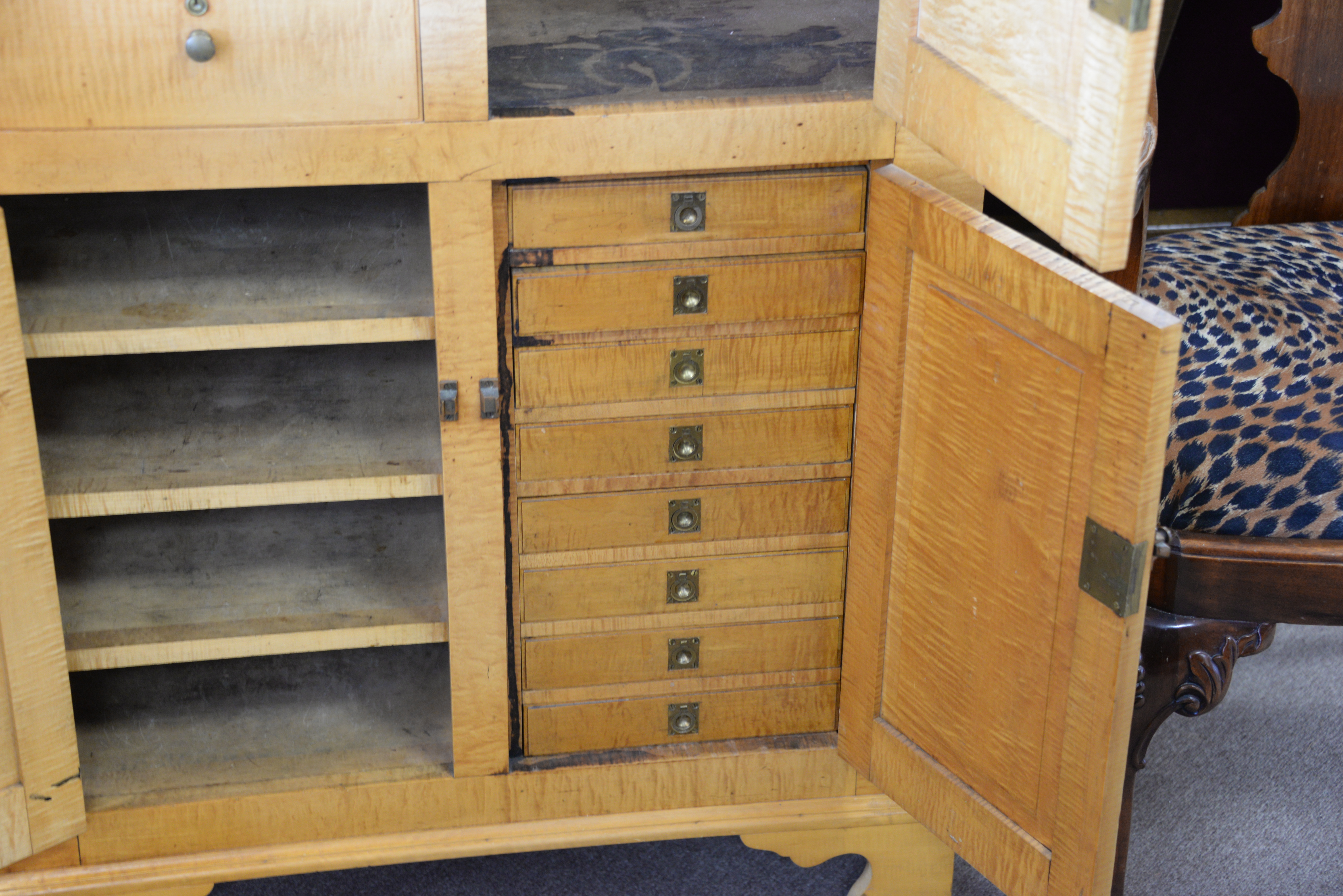 Lot 182: Custom figured maple dental chest/cabinet with eight fitted drawers behind one door. ht. 52 in. wd. 31 1/2 in. dp. 16 1/2 in.