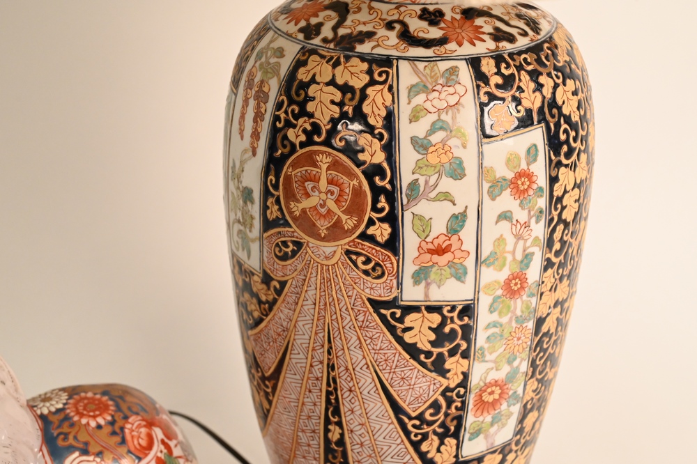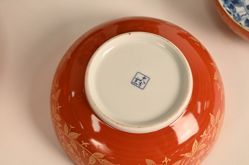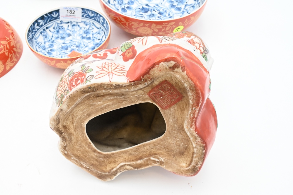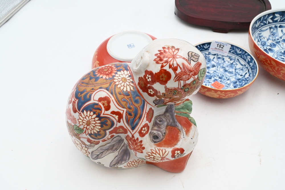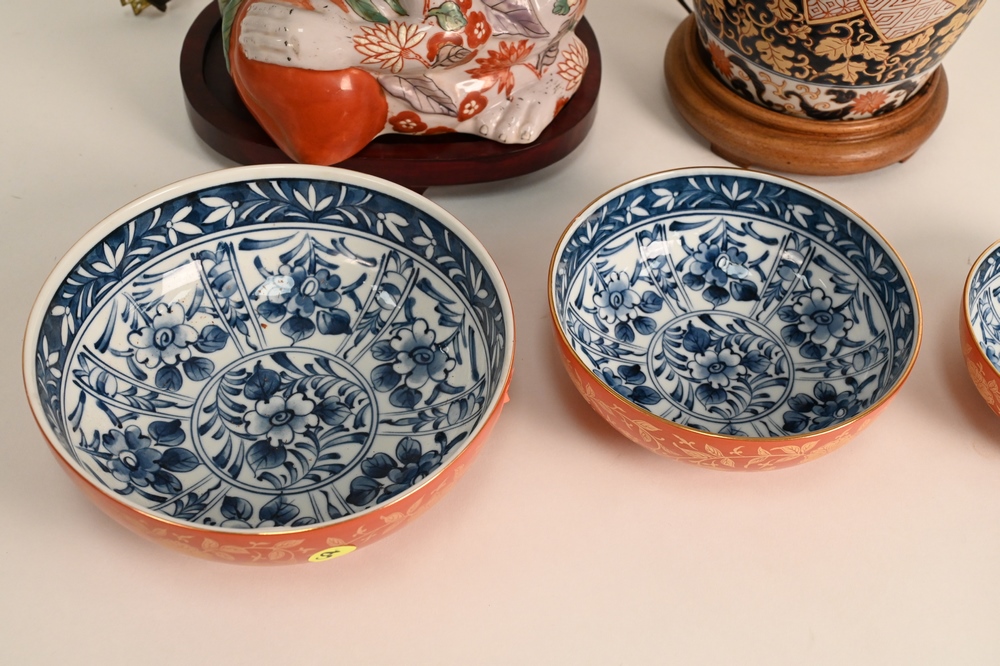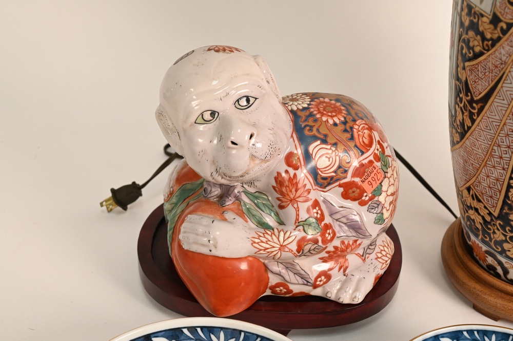 Five Piece Lot, to include Chinese ceramic painted monkey figure, set on wood stand, figure height 7 1/4 inches; three Japanese porcelain stacking bowls, having blue and white interior with orange and gold exterior, each on wood stands, largest 2 3/4 inches, diameter 8 inches; along with a Chinese porcelain lamp, along with shade, vase height 16 inches, total height 34 inches, Provenance: From a private New York City collection.