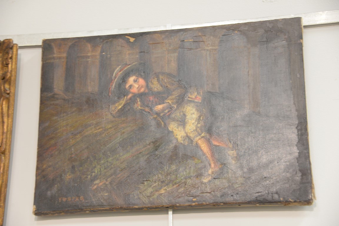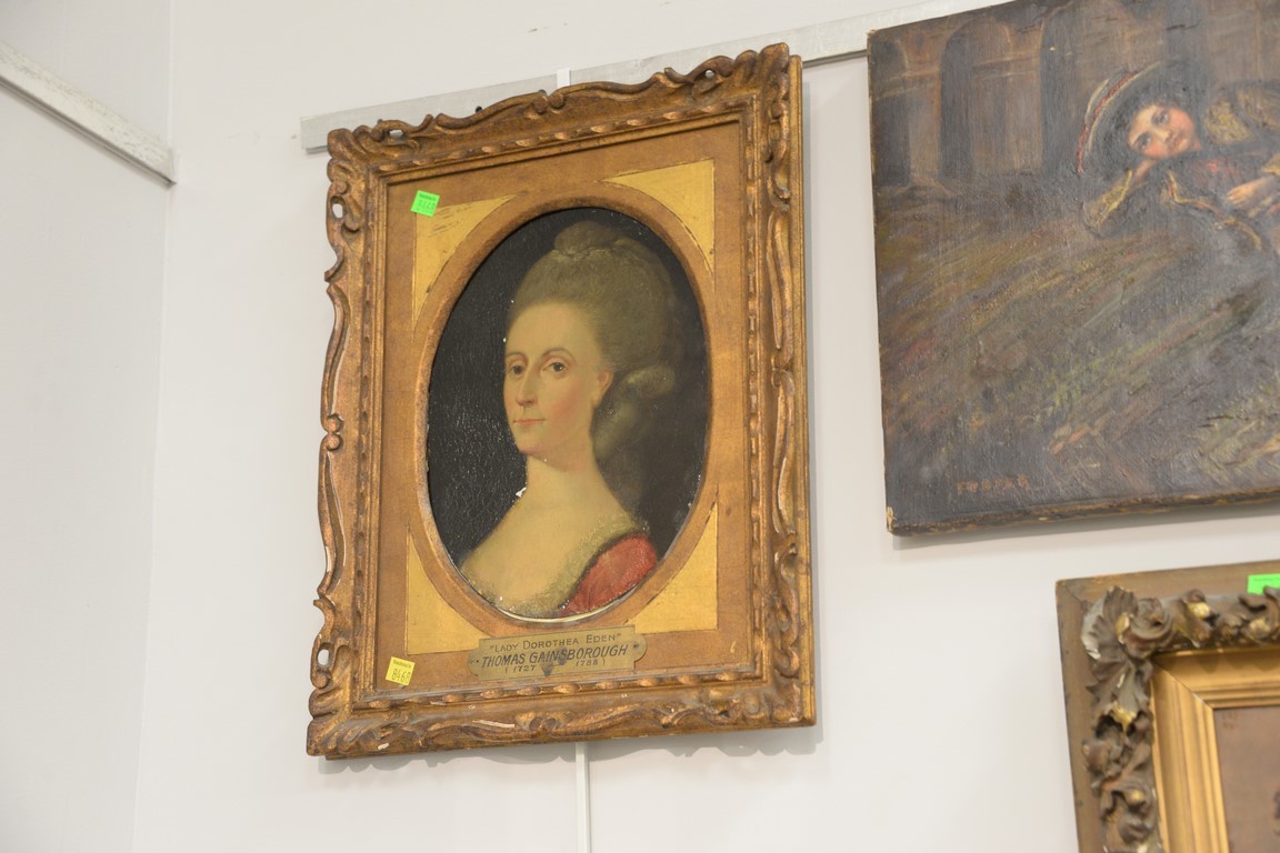 Five portrait paintings including oil on board of a soldier signed lower right V. Pratheroe 1895 a portrait of Lady Dorothea Eden, oil on tin marked Thomas Gainsborough on plaque a pastel bust of a woman signed illegibly lower right an oil on board Victorian portrait and an oil on canvas of a young boy, signed Foster. 9 x 6 to 14 x 20 Provenance: Estate of Arthur C. Pinto, MD