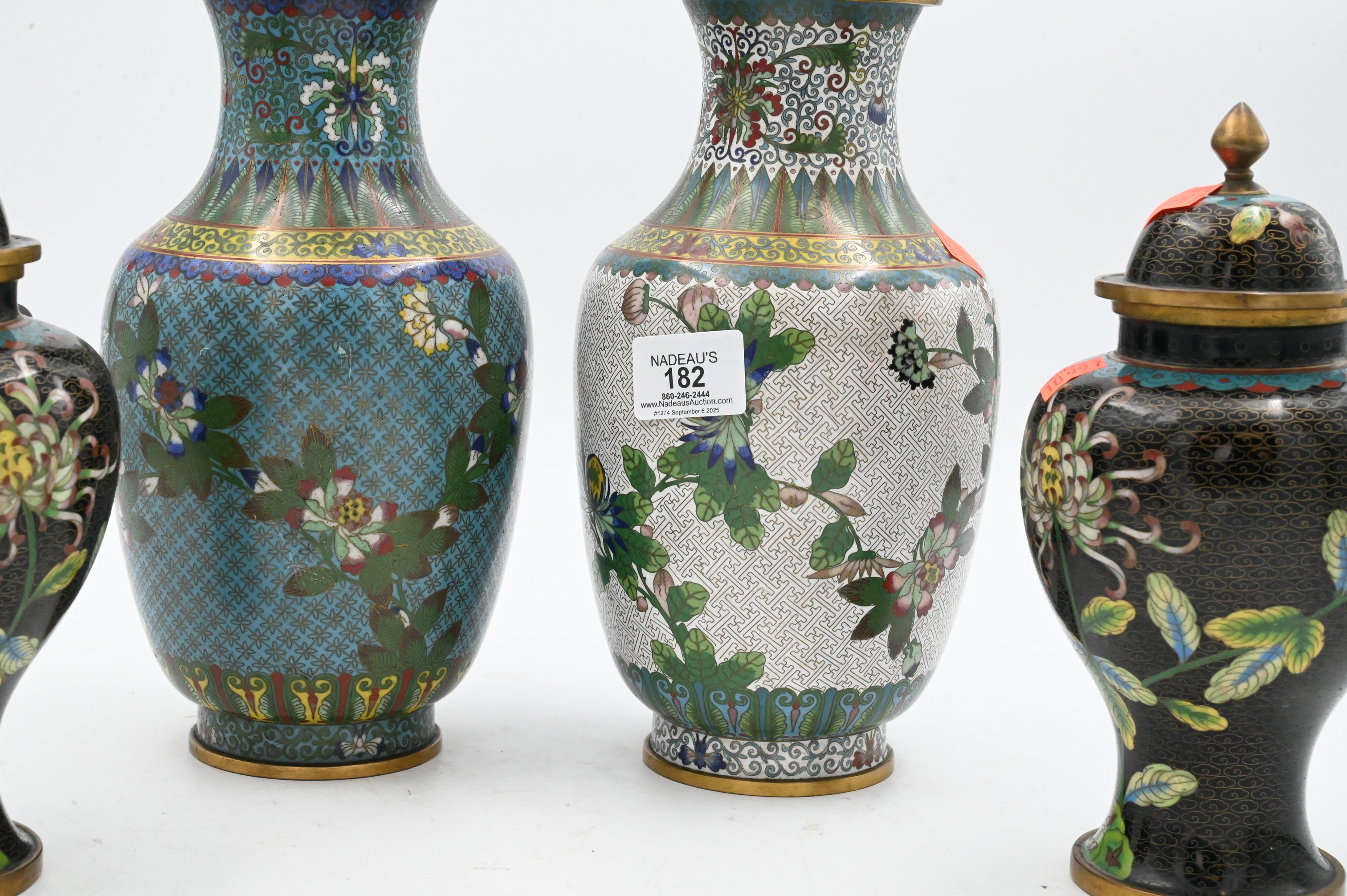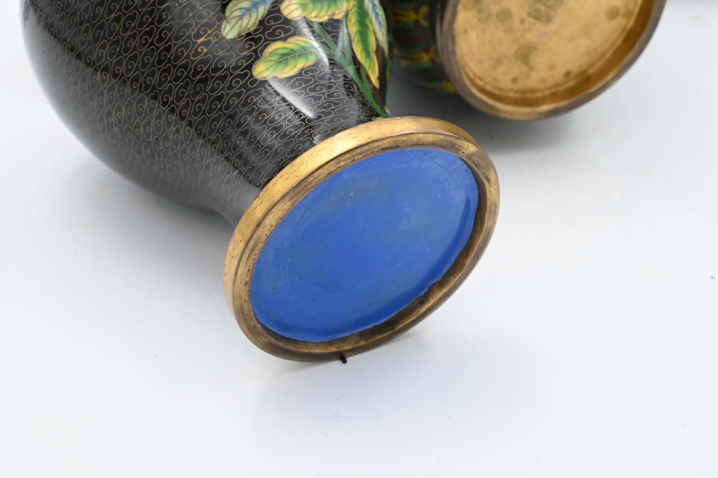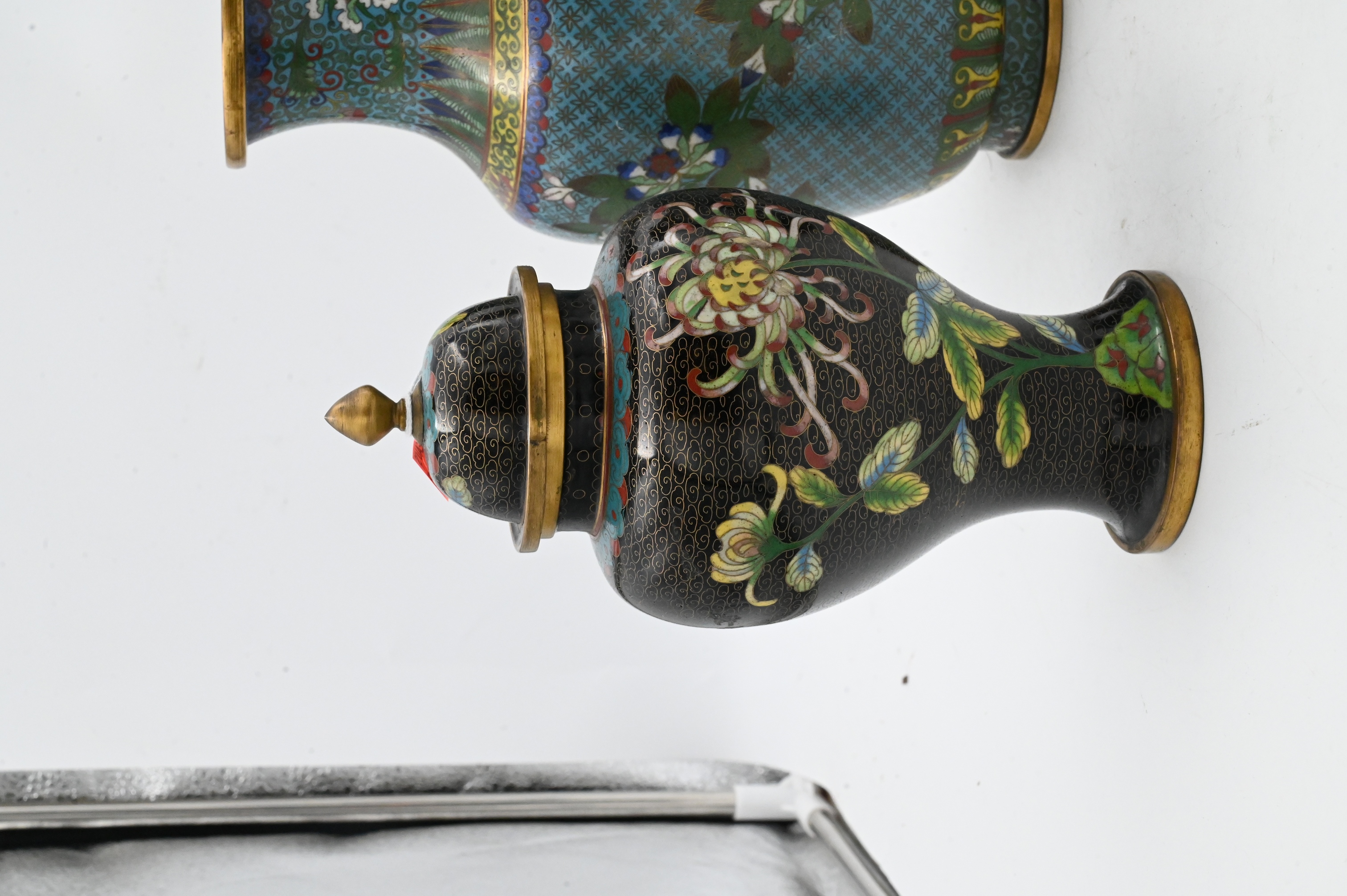 pair of black baluster jars having chrysanthemum flower motif and gilt finial lids, along with a near pair of vases, one in turquoise and the other in white enamel