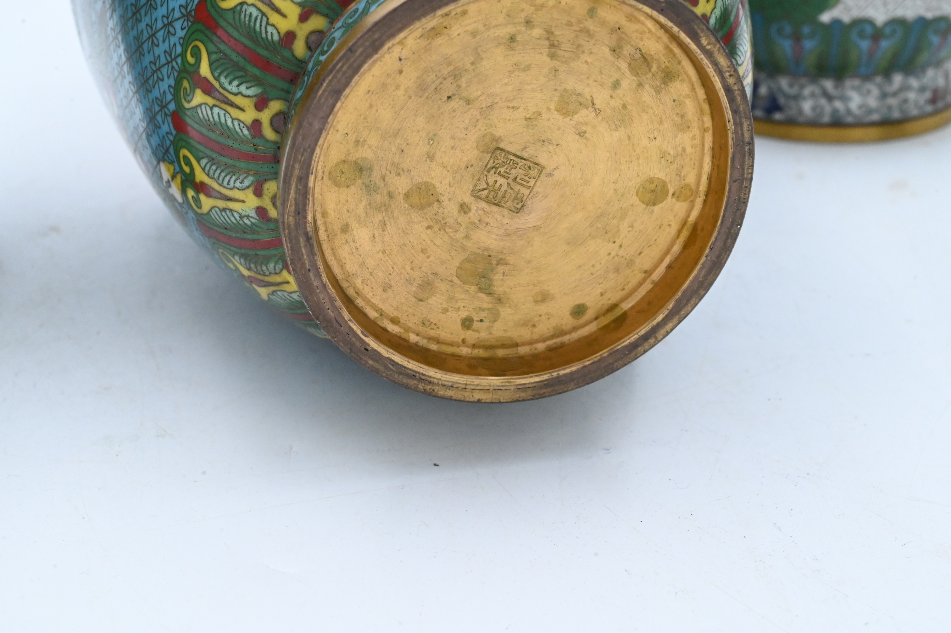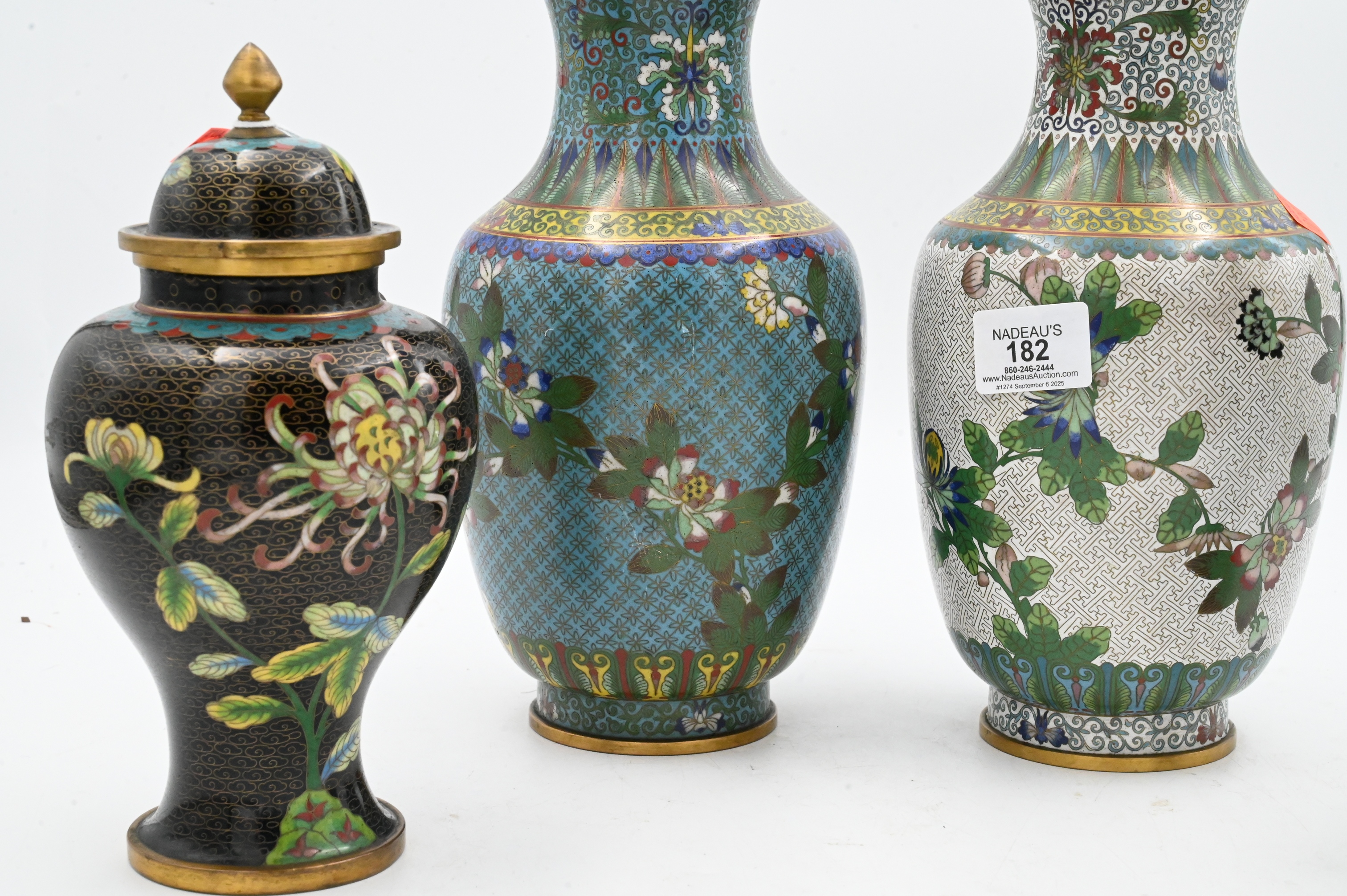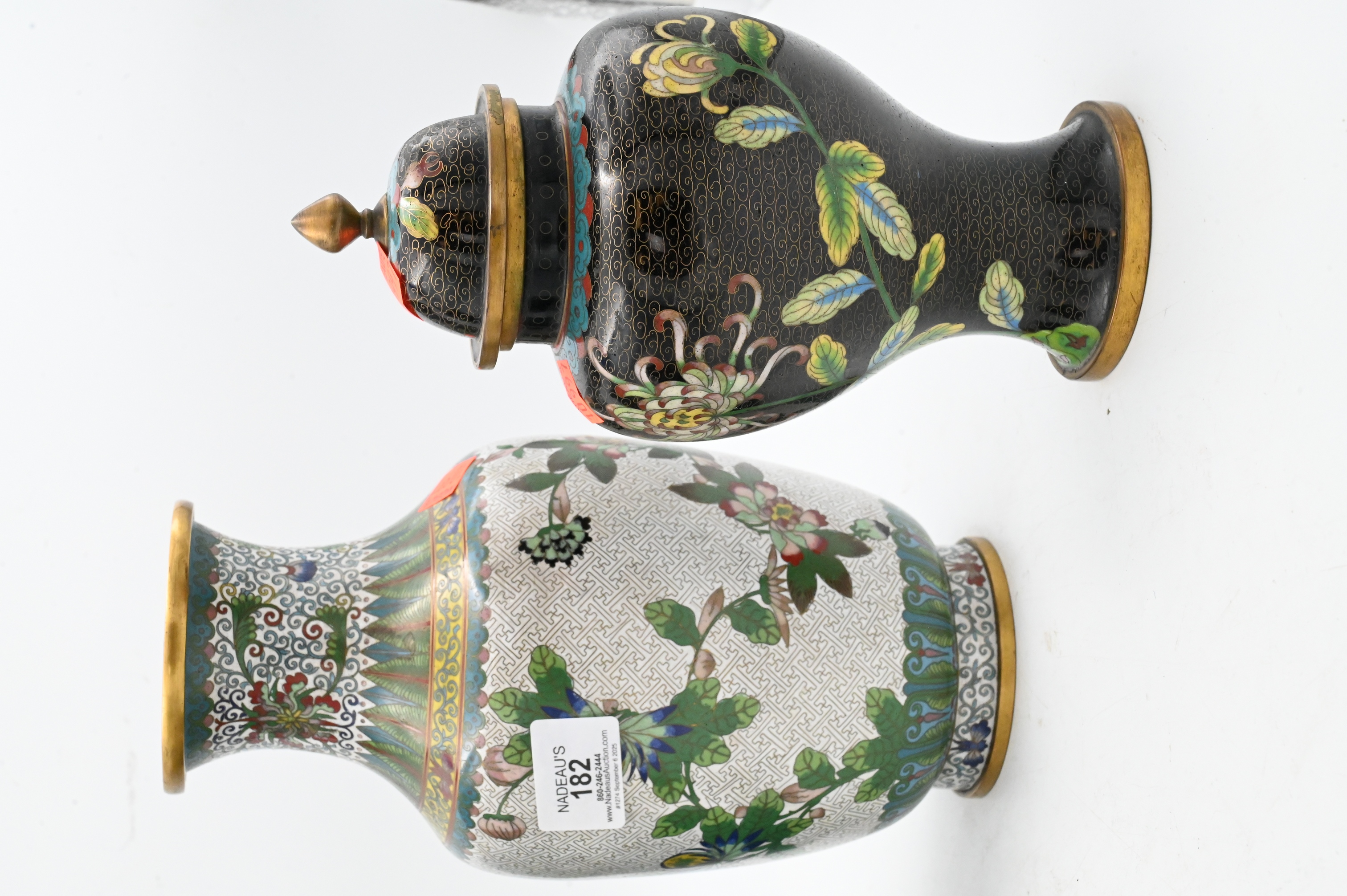 pair of black baluster jars having chrysanthemum flower motif and gilt finial lids, along with a near pair of vases, one in turquoise and the other in white enamel