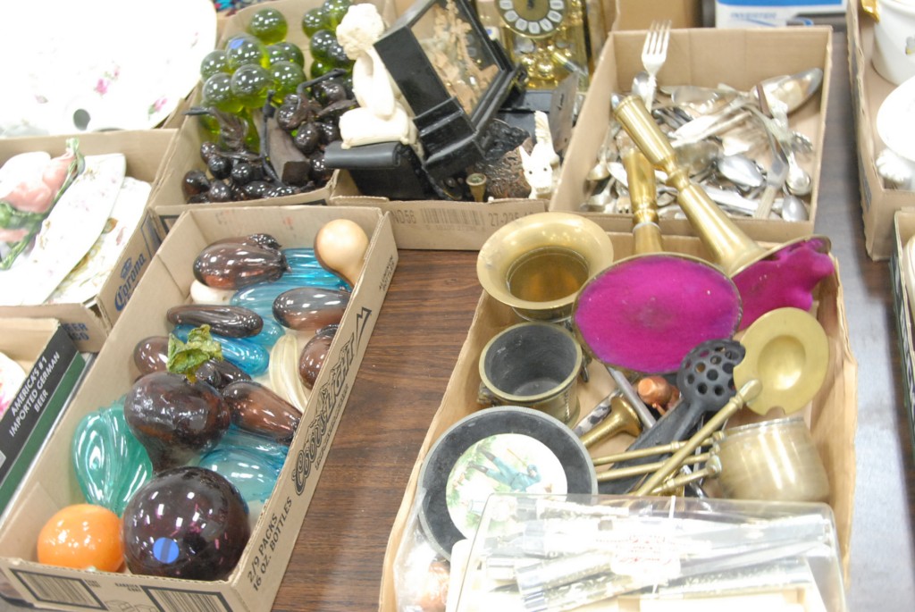 Fourteen box lots Rosenthal, Demitasse cups, saucers, various cups and saucers, china, glassware, platters, Oriental rose jar, brass, glass fruit, and miscellaneous.