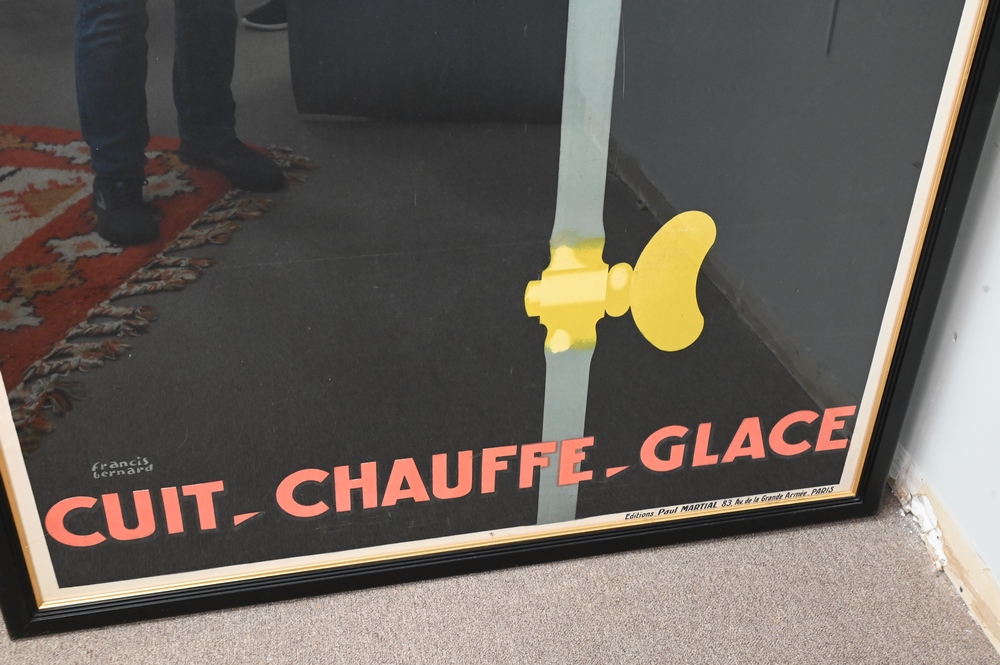 Lot 182: Francis Bernard (1900-1979), Gaz 1928 Editions Paul Martial, Paris, this poster was the focus of the French Exhibit at the 1928 Advertising Art Exhibition in Munich Germany and is one of the masterpieces of French Art Deco Poster styles, 61″ x 45″.