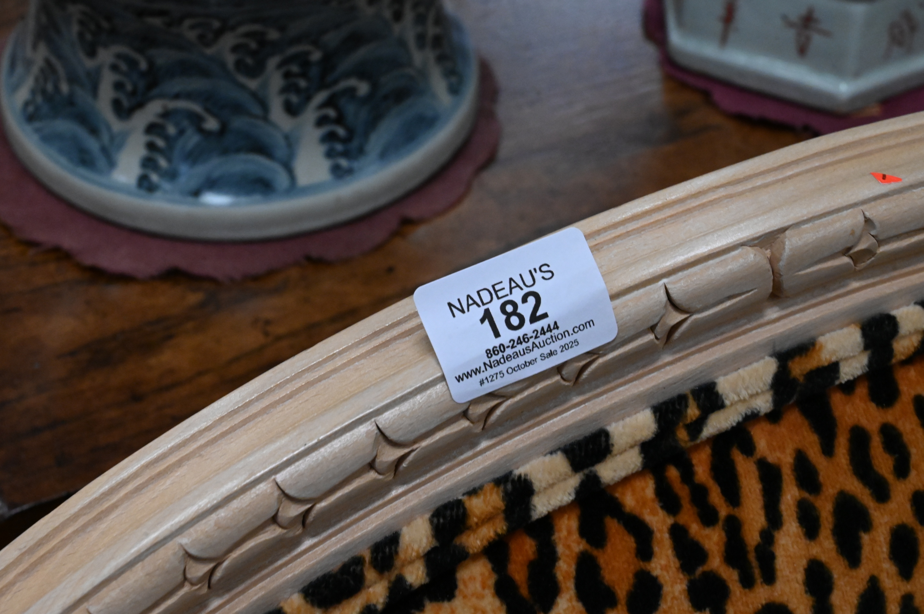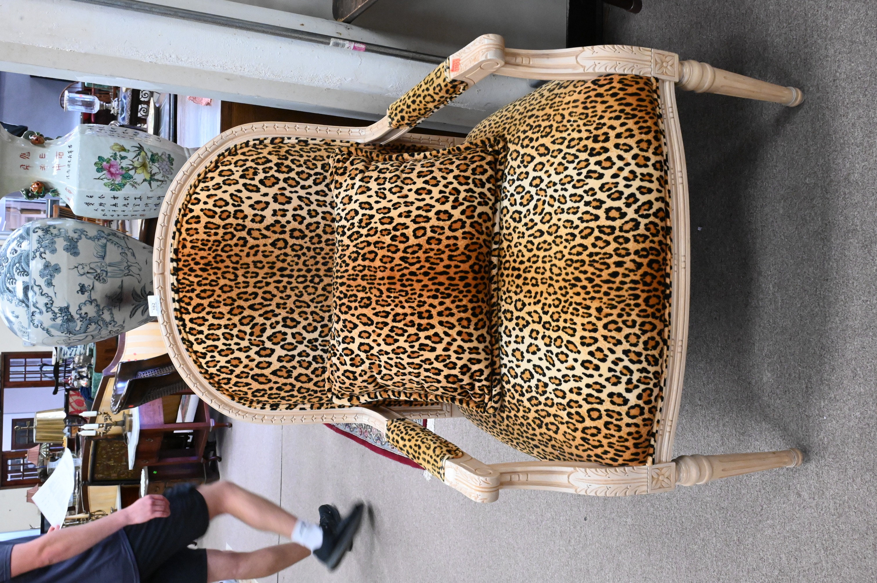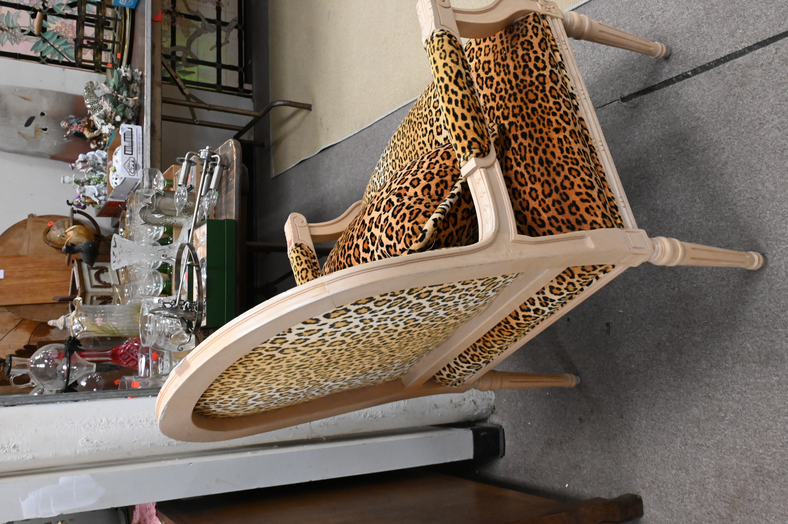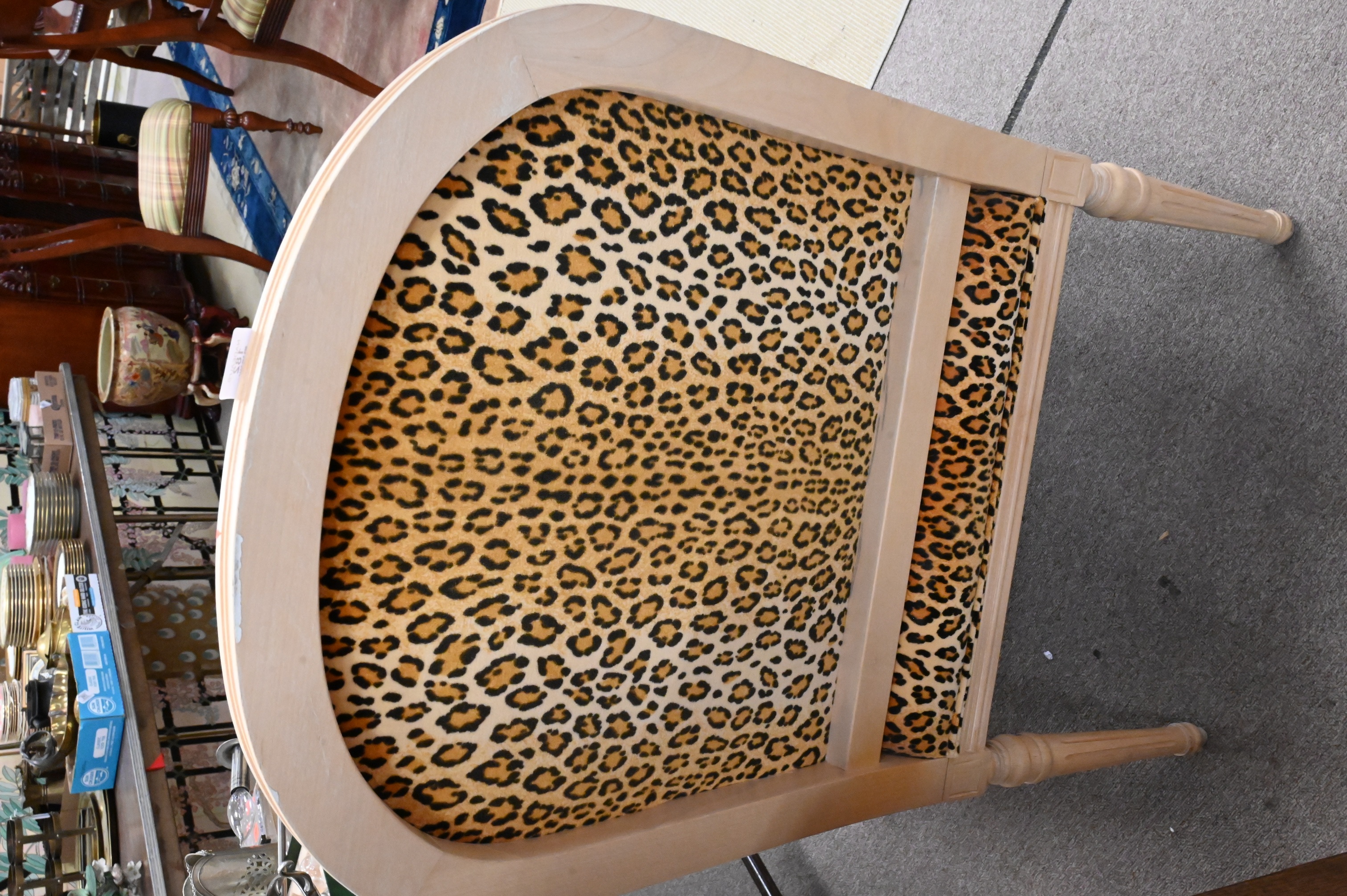 in custom leopard / cheetah upholstery on carved wood body and fluted legs