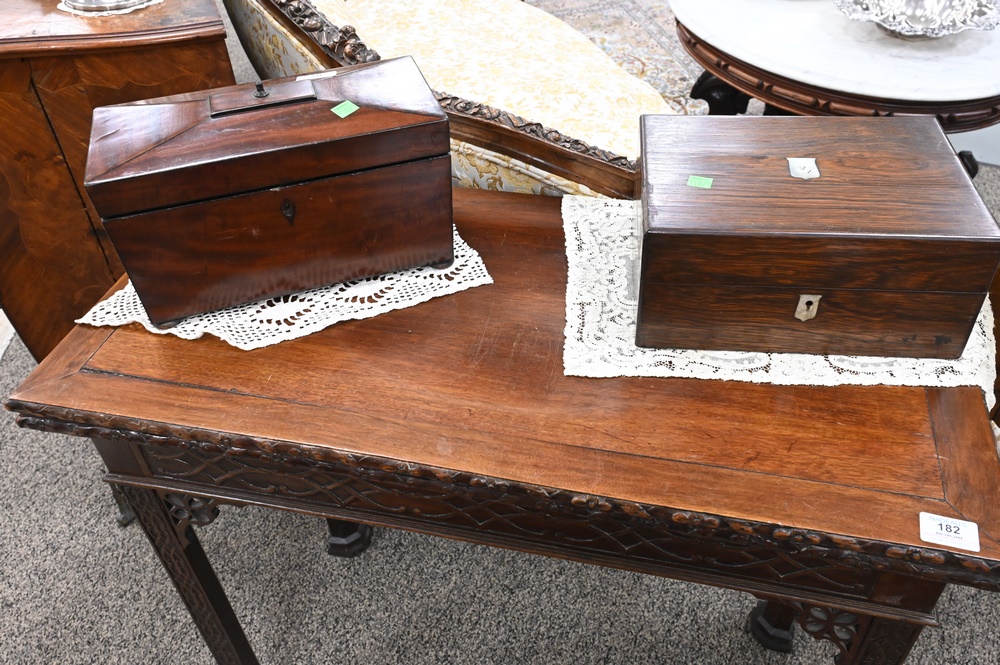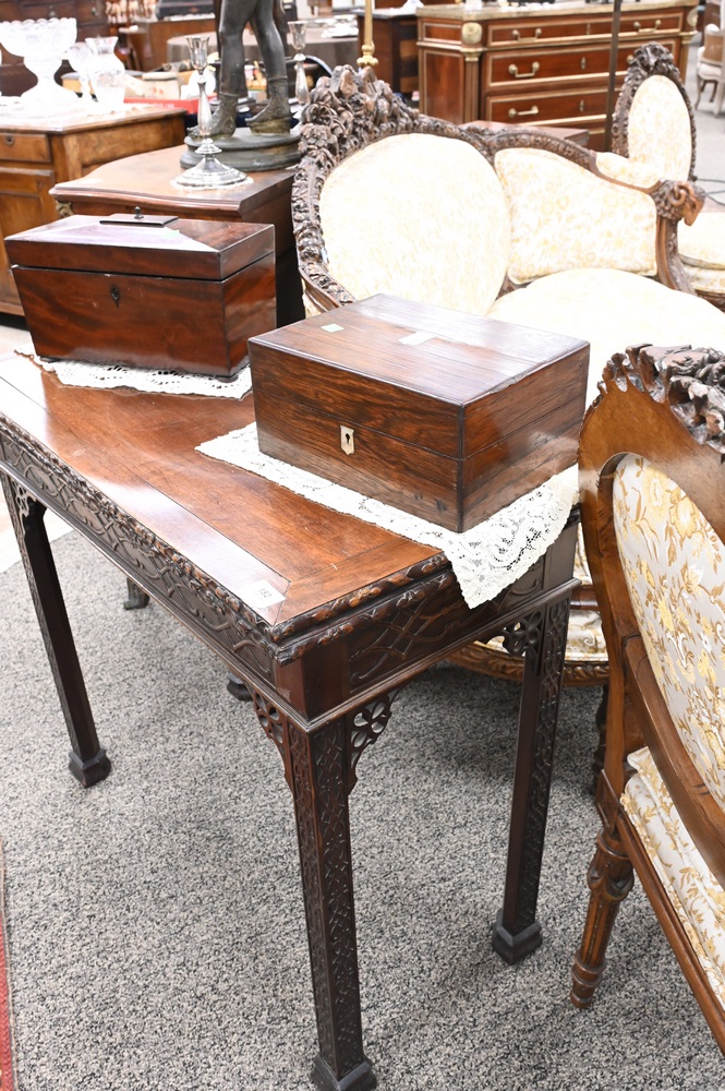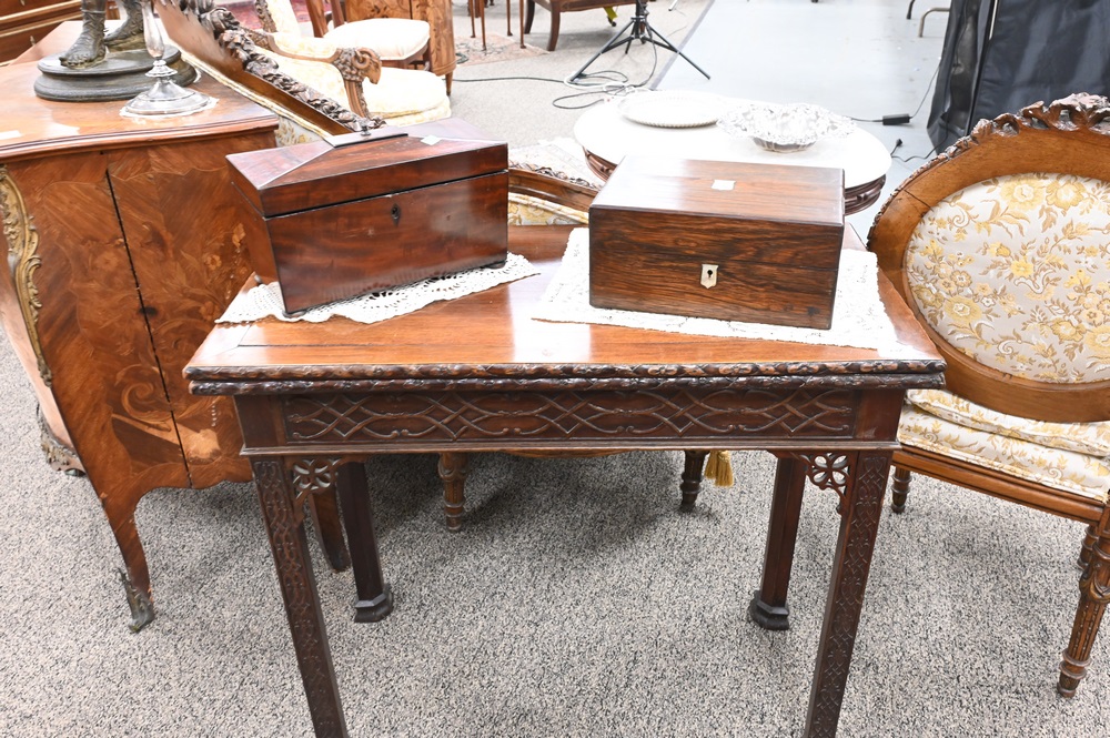 Lot 182: George III Mahogany Game Table, having blind carved frieze and legs, height 29 inches, top 16″ x 32 1/2″.