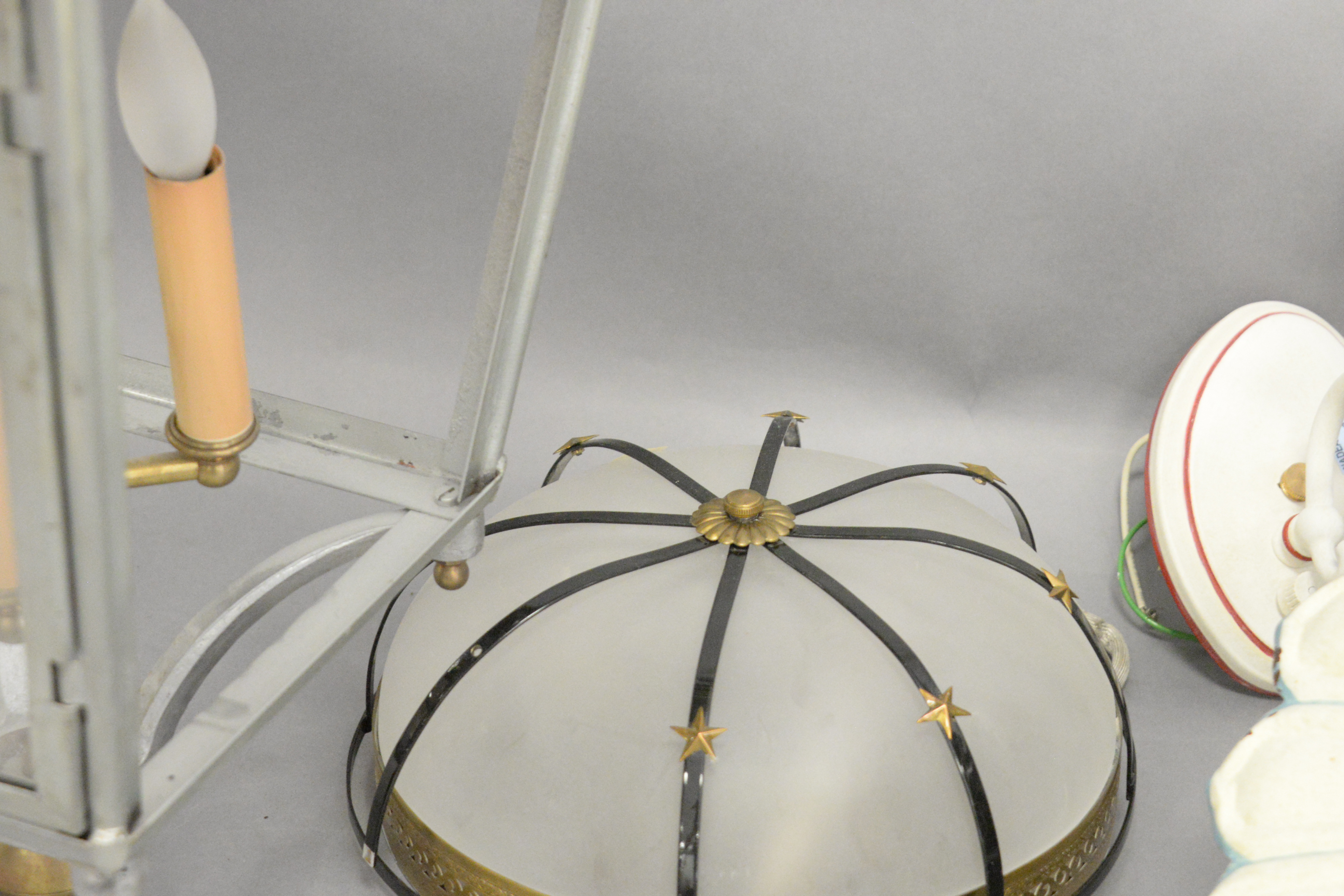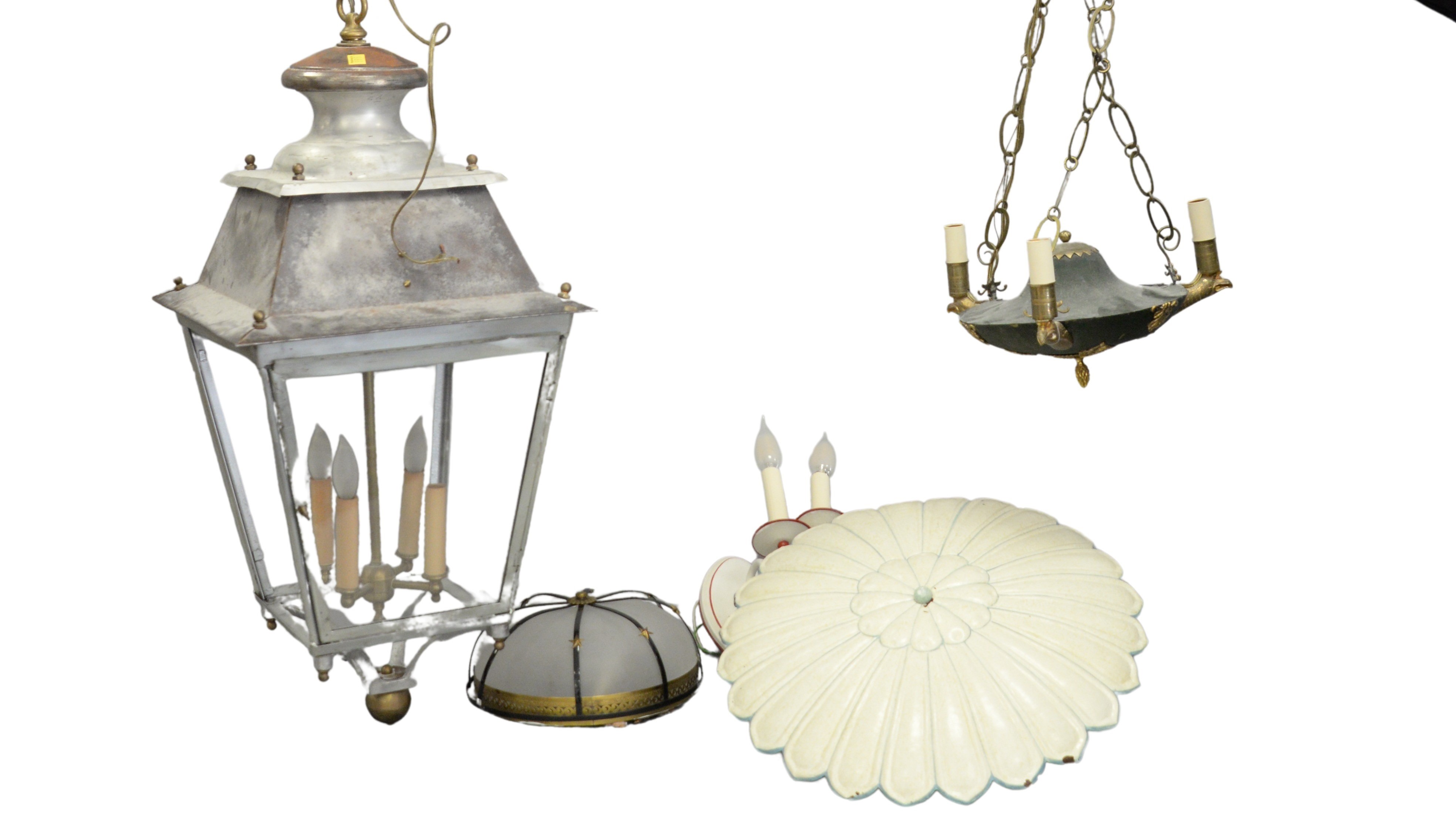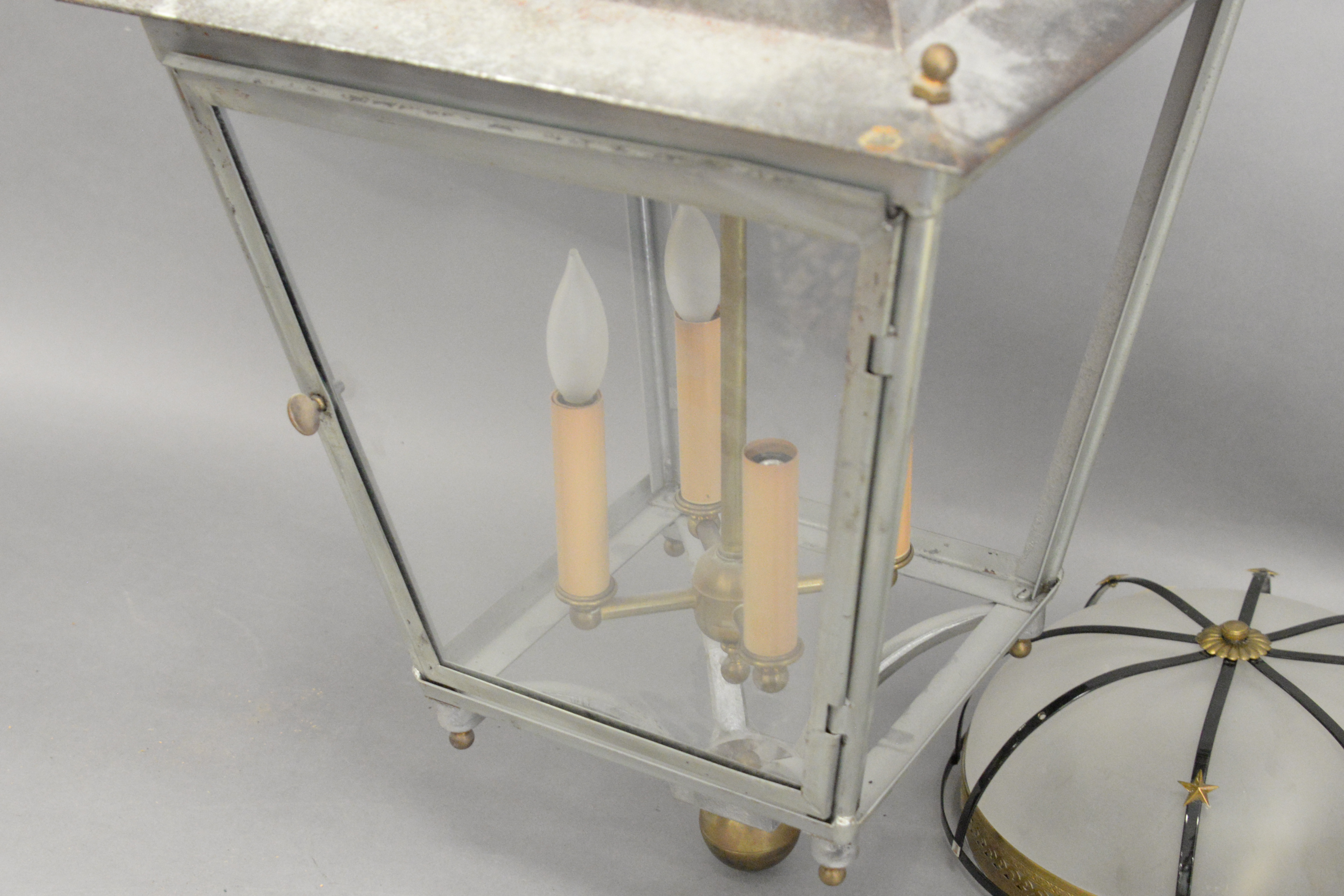 Group of Four Hanging Lights, Empire hanging light having bird head arms, painted towl light, and a ceiling light, with frosted shade, lantern approximately 29 inches