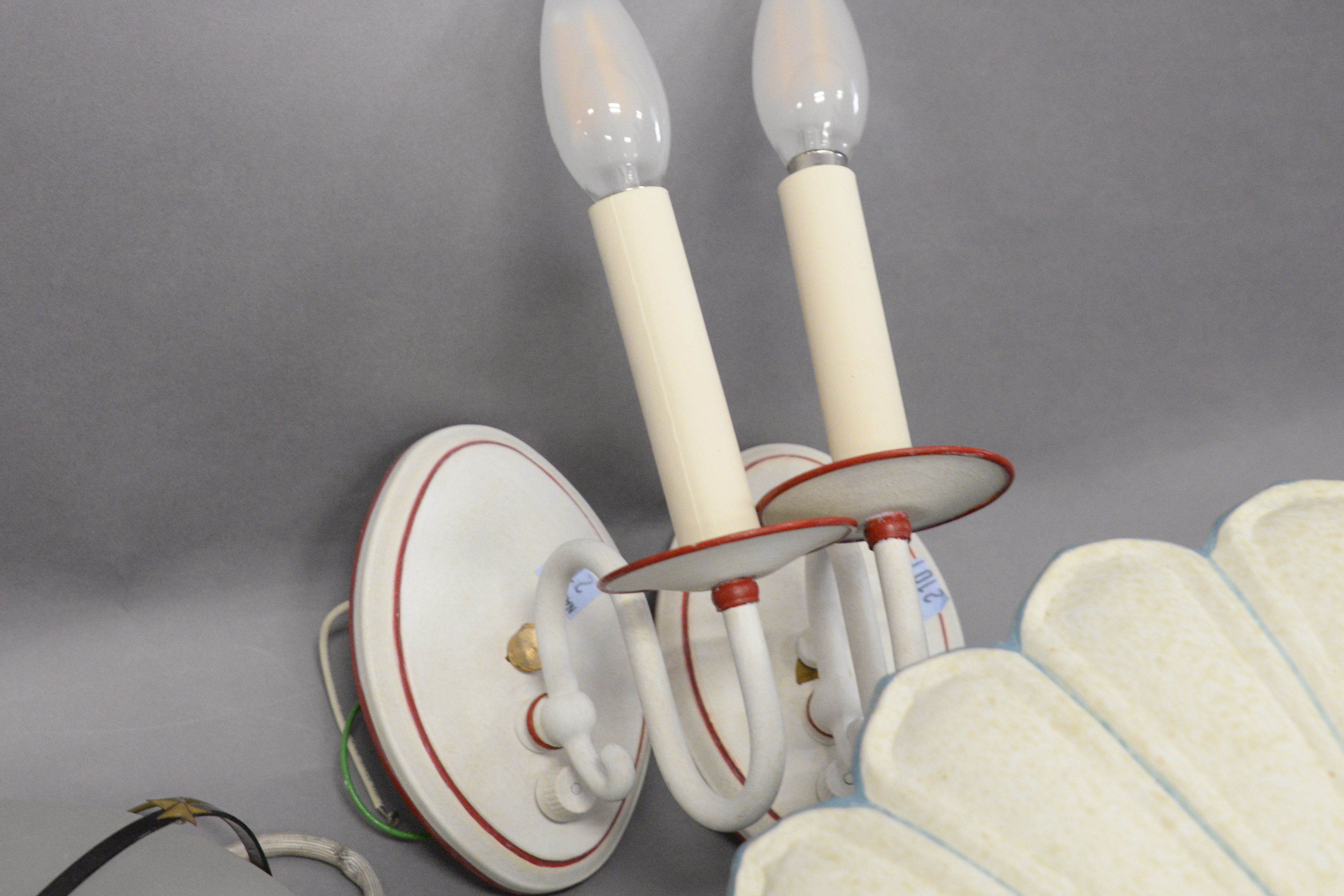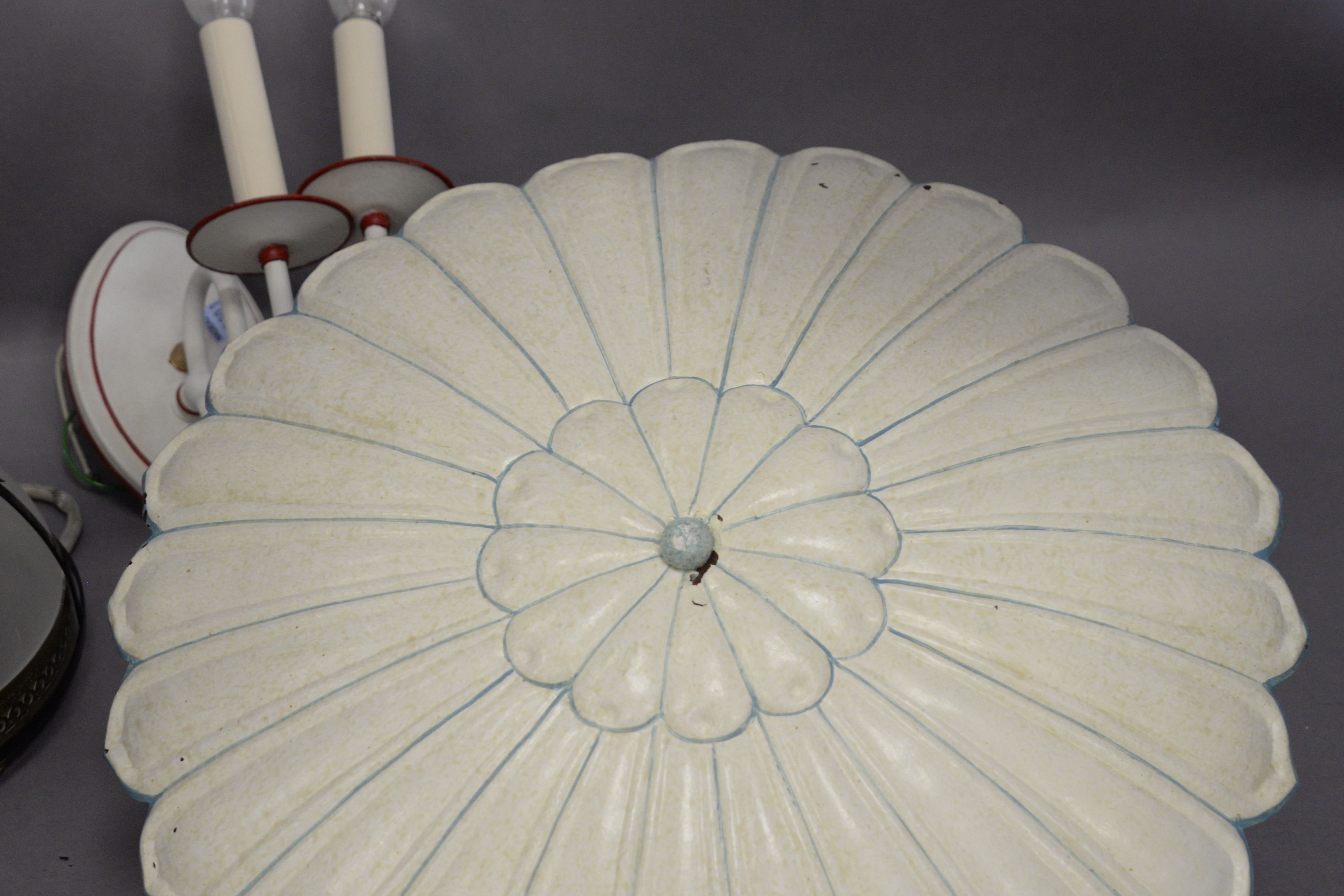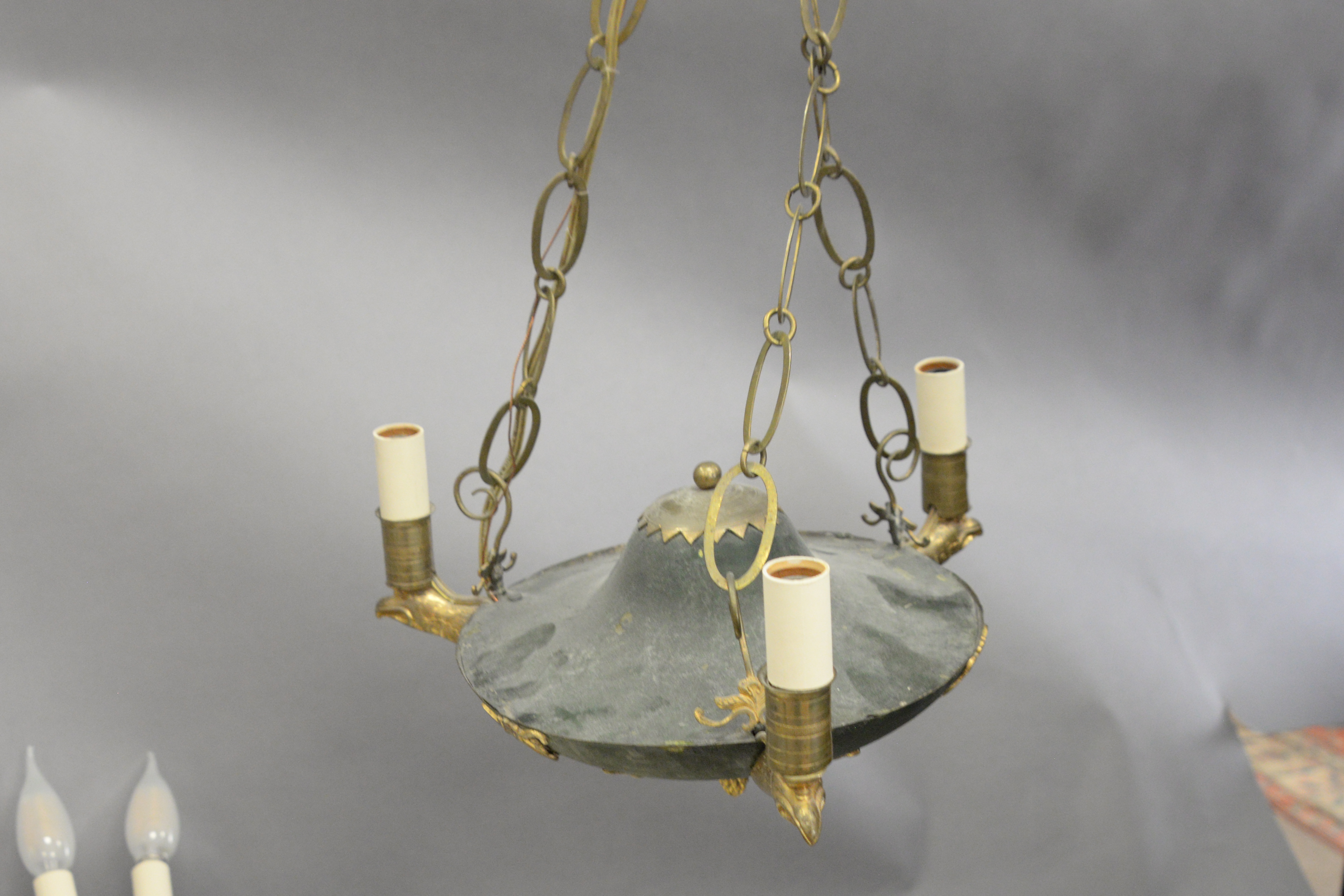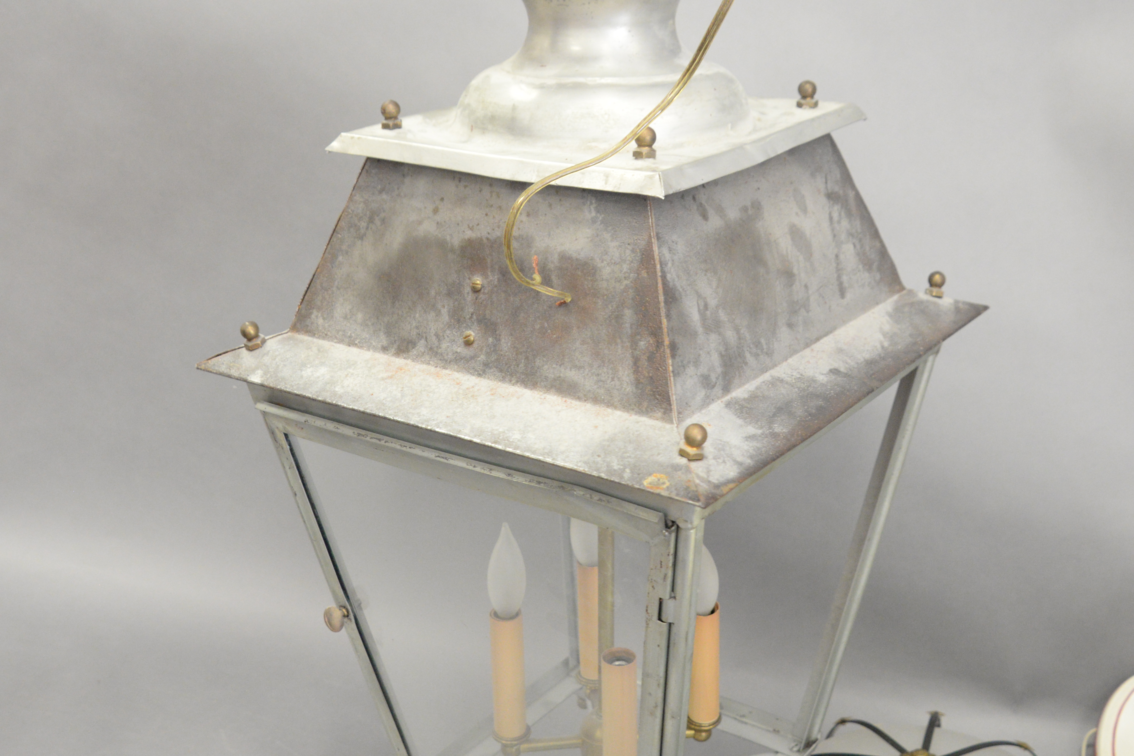 Group of Four Hanging Lights, Empire hanging light having bird head arms, painted towl light, and a ceiling light, with frosted shade, lantern approximately 29 inches
