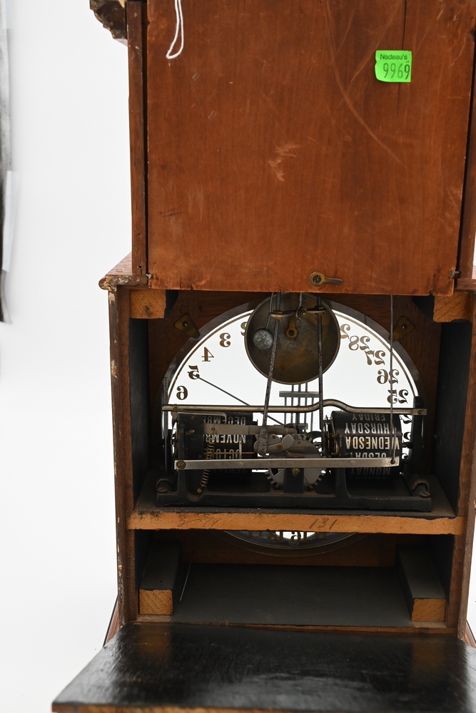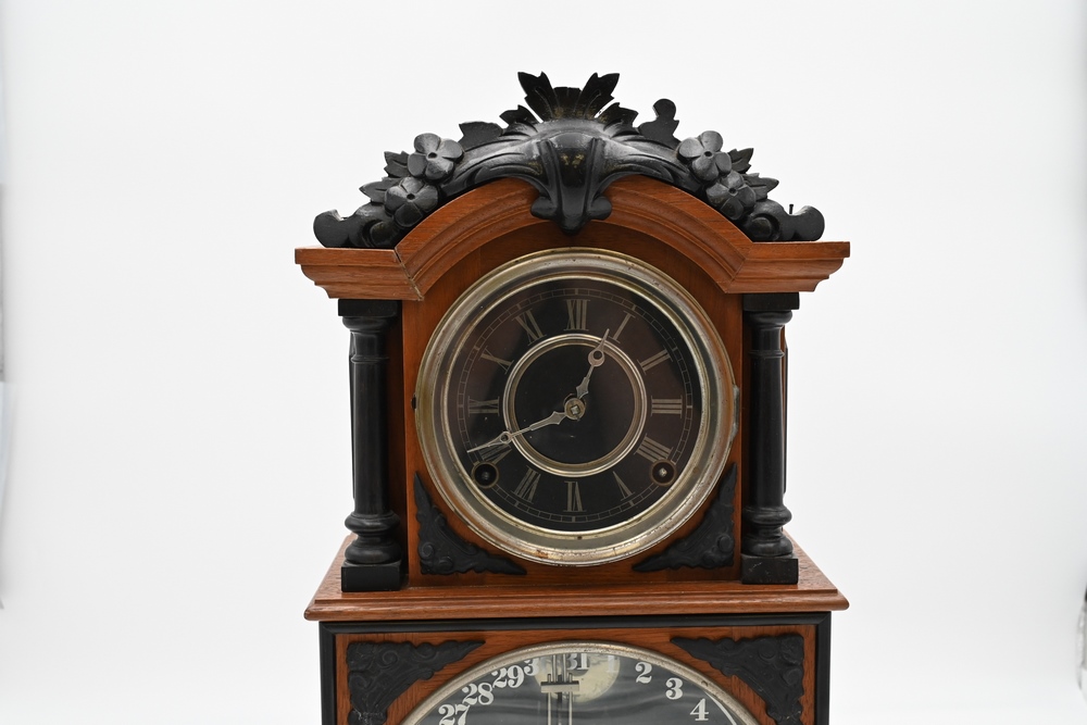 having dual dial and walnut case, carved wood accents, top dial with paper face, bottom dial clear glass,