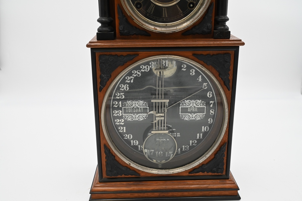 Lot 182: Ithaca Parlor Model Calendar Shelf Clock having dual dial and walnut case, carved wood accents, top dial with paper face, bottom dial clear glass, face marked Horton’s Patent height 20 inches Provenance: Fifty Year Personal Collection of Clocks and American Antiques from Thomas Bailey, Manchester, Connecticut.
