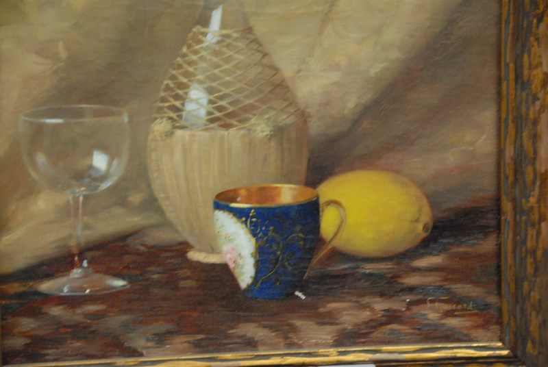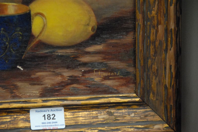 Lot 182: Leon Gascard 1861 oil on canvas still life of tea cup with lemon signed lower right L Gascard, 16 x 12.