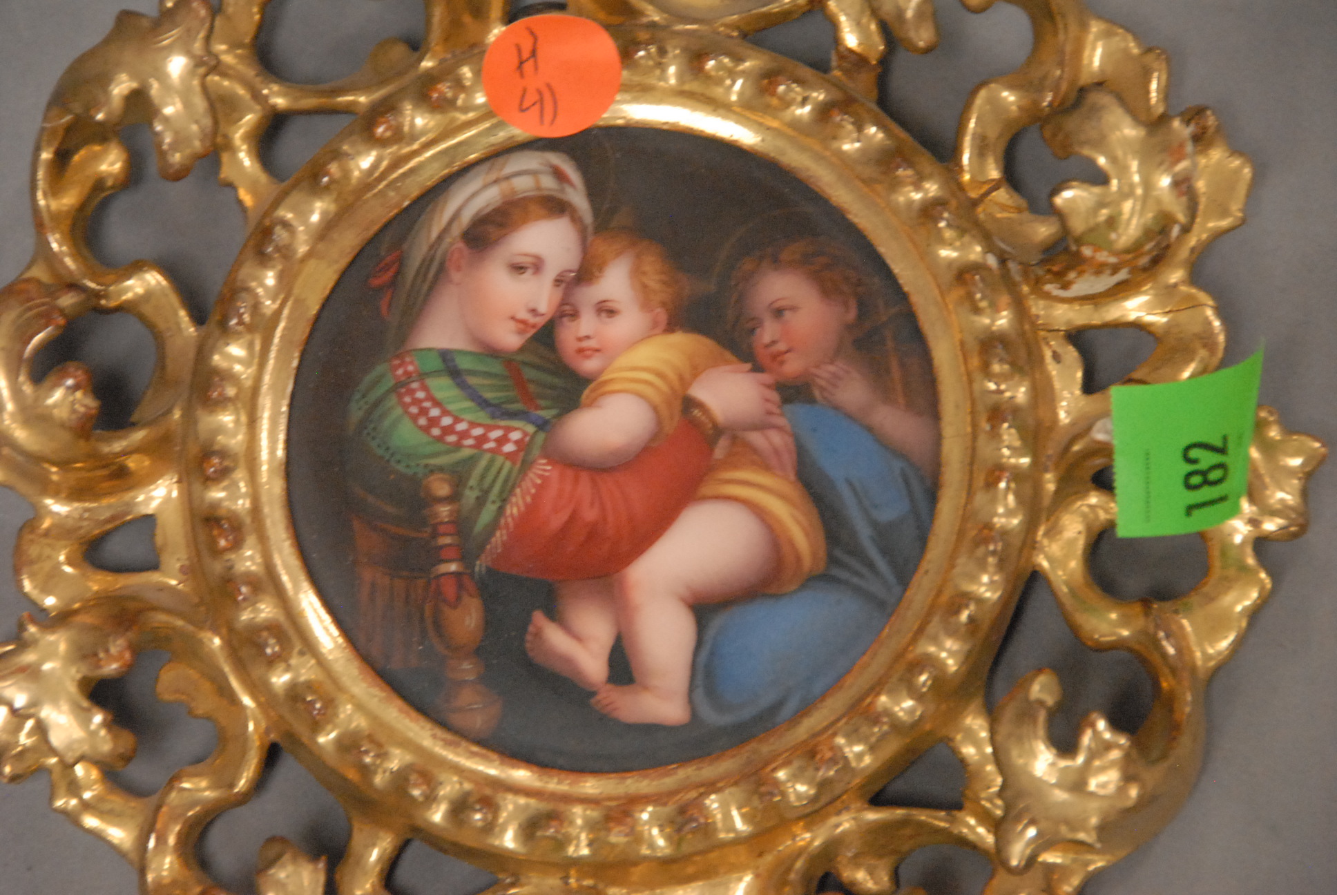 Painting on porcelain armchair Madonna, in a gilt frame.