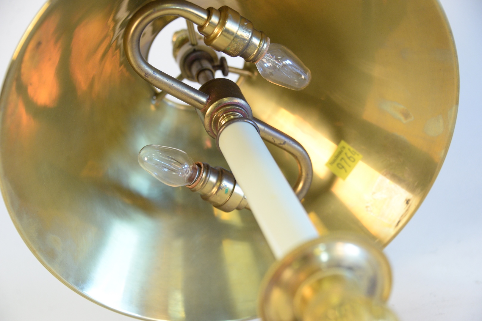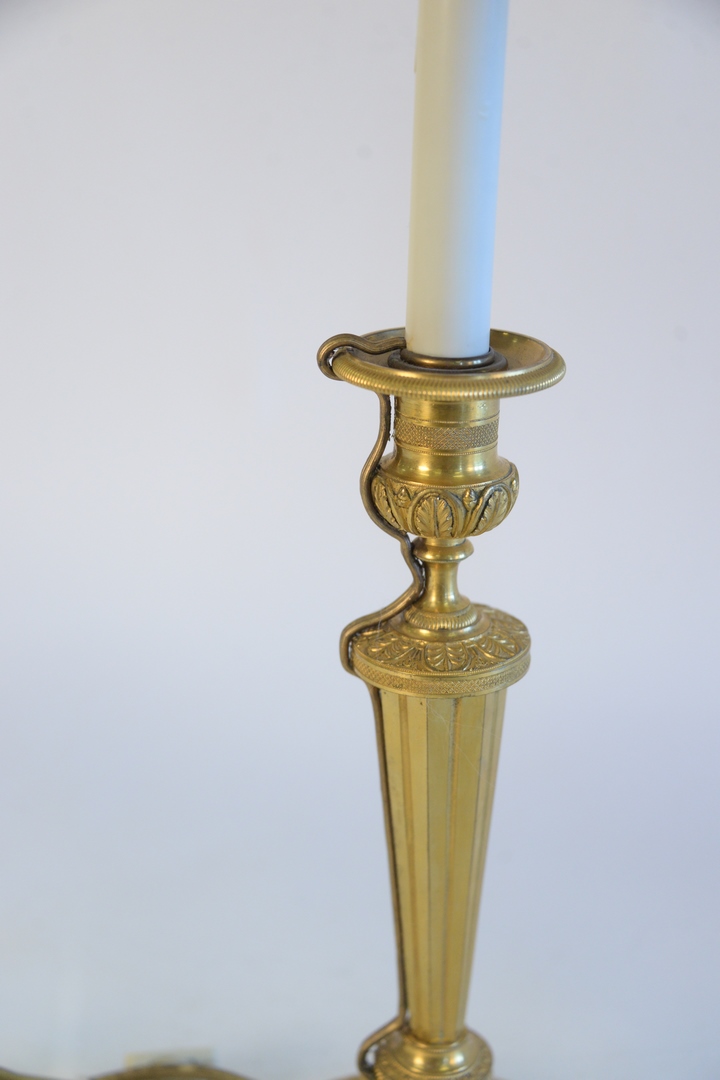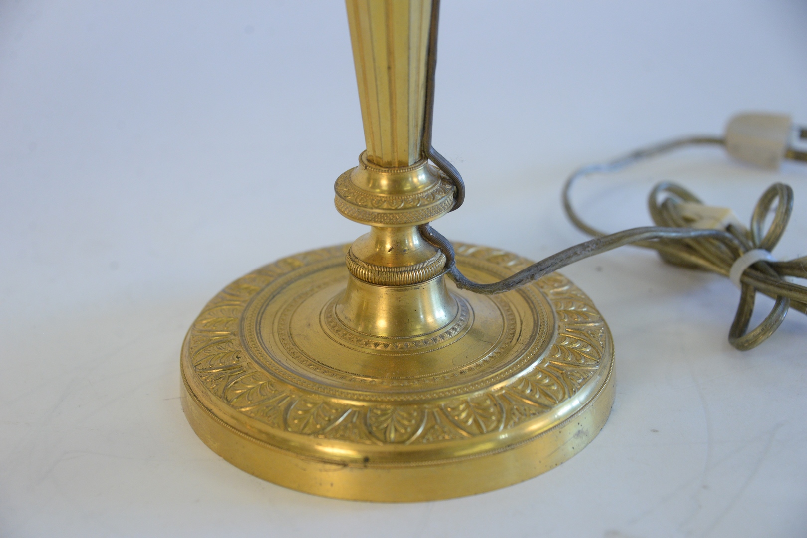 Lot 182: Pair of French Gilt Bronze Candlesticks, made into table lamps, with tole shades, height 23 inches.