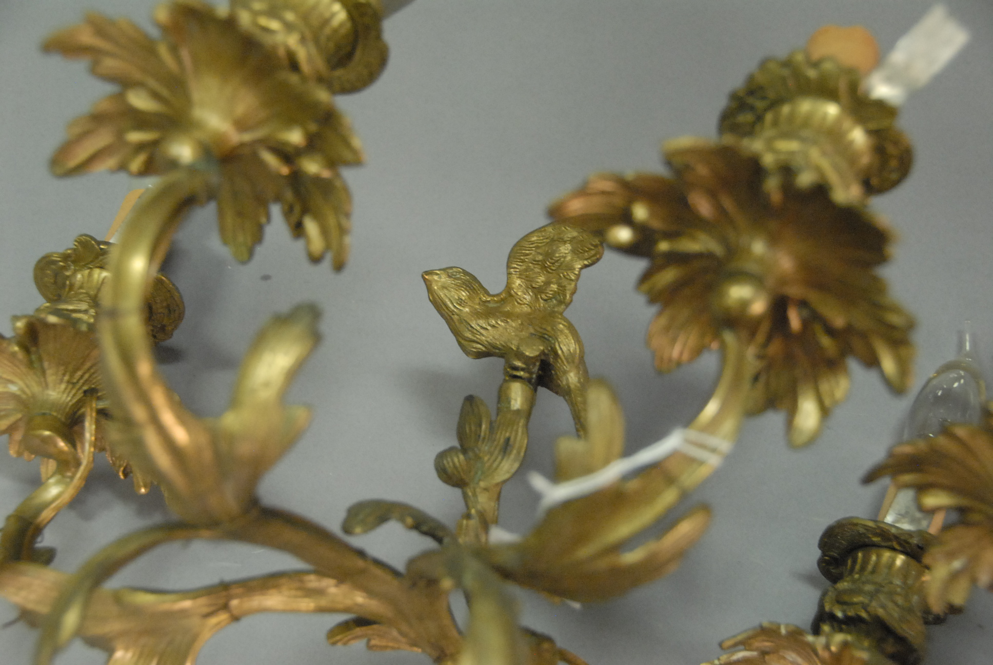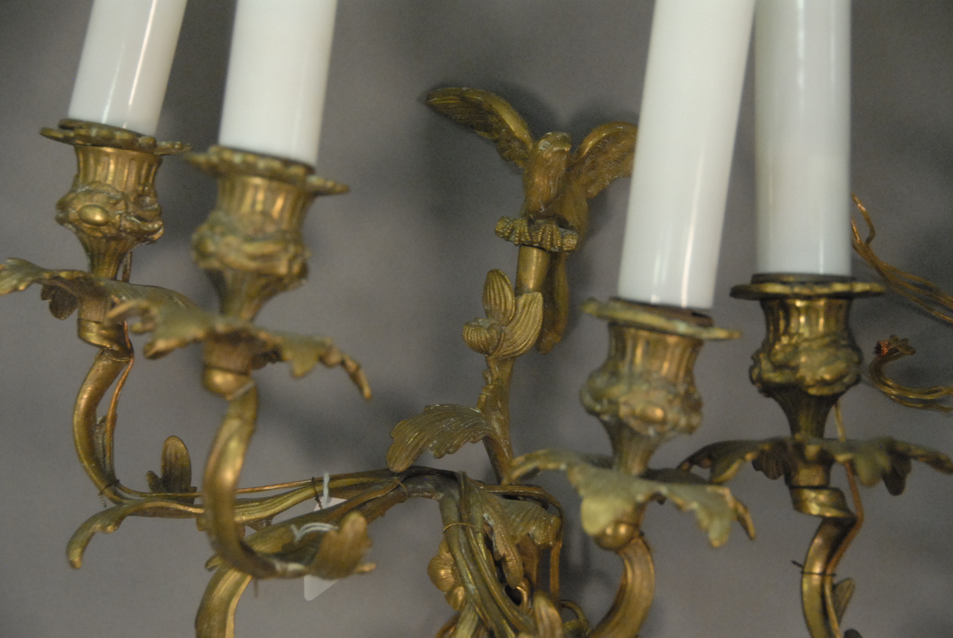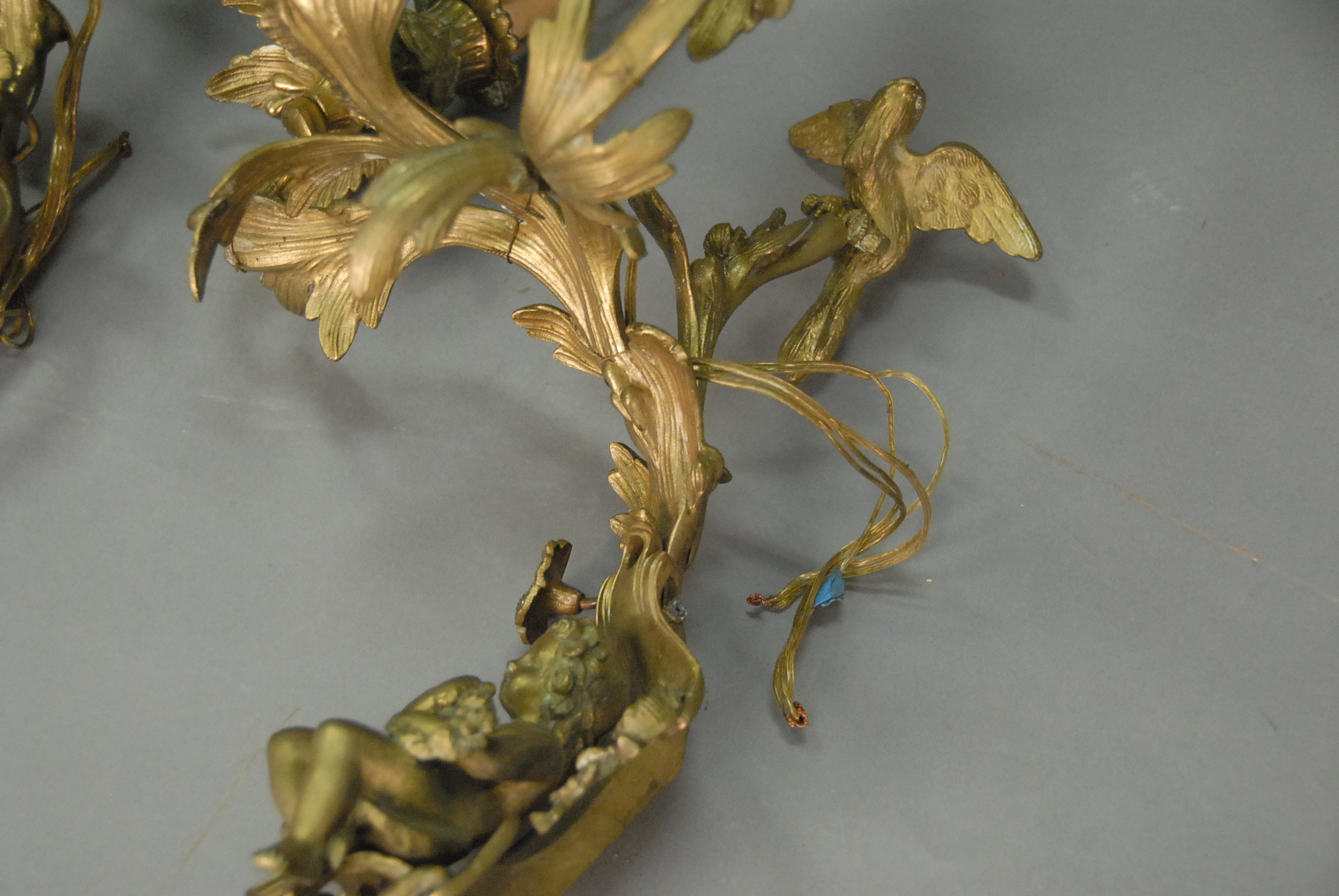 Lot 182: Set of four Louis XV style gilt bronze three-light bras de lumiere, each surmounted by a bird and centering a seated cherub, electrified, late 19th century. ht. 14 1/2in. wd. 12 1/2in.
