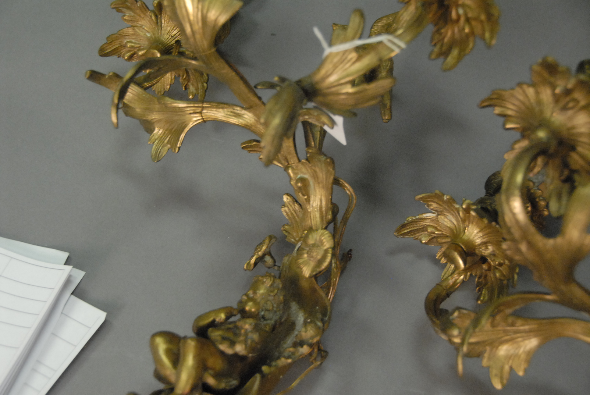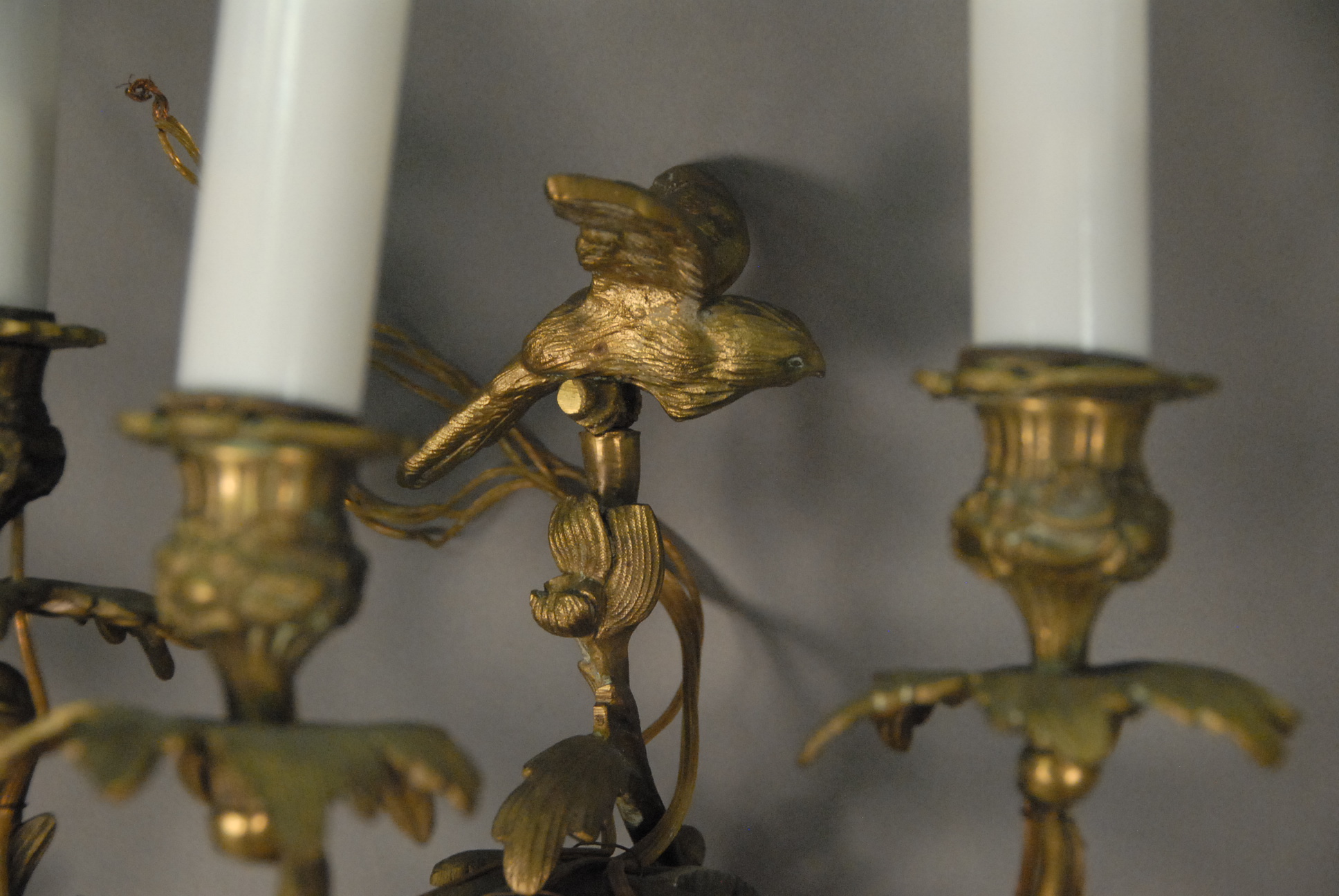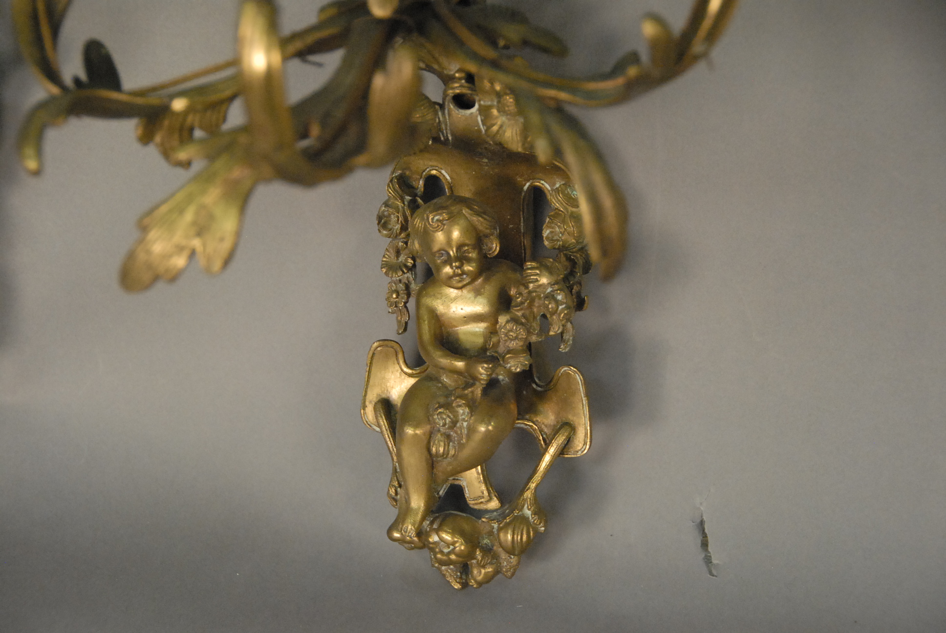 Lot 182: Set of four Louis XV style gilt bronze three-light bras de lumiere, each surmounted by a bird and centering a seated cherub, electrified, late 19th century. ht. 14 1/2in. wd. 12 1/2in.